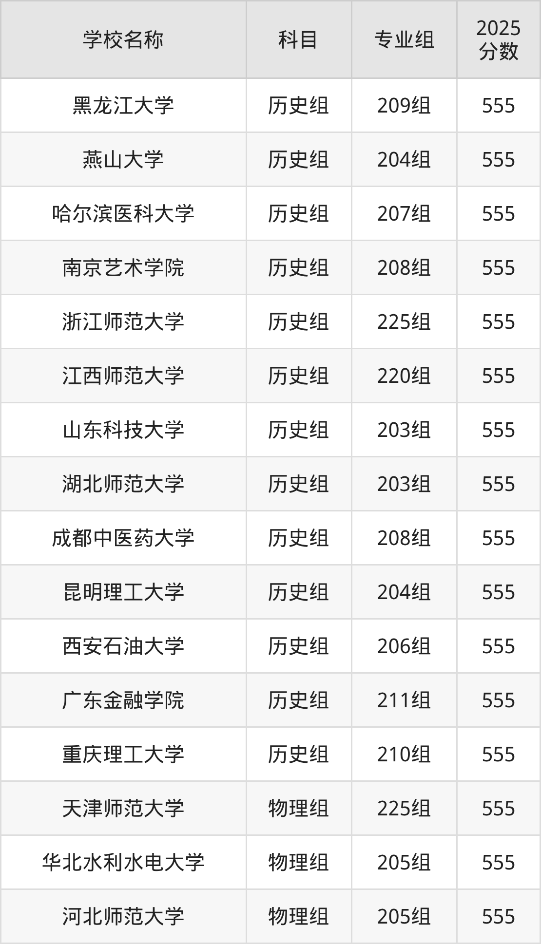 广东高考录取分数线在555分左右的公办院校专业组一共有28个,其中历史组有:黑龙江大学(555分)、燕山大学(555分)、哈尔滨医科大学(555分),物理组有:天津师范大学(555分)、华北水利水电大学(555分)、河北师范大学(555分)。