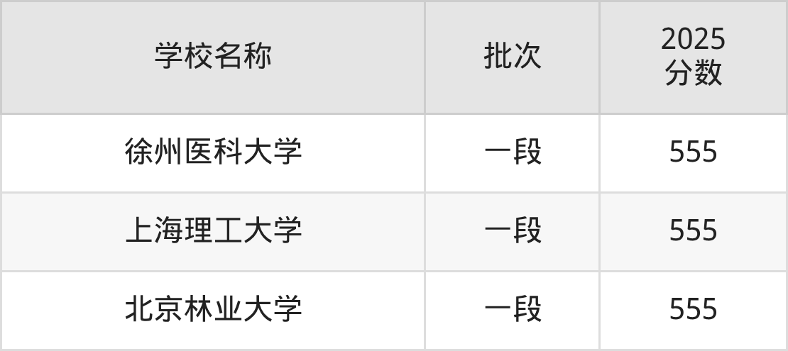 山东高考录取分数线在555分左右的公办大学一共有3所。分别是徐州医科大学(555分)、上海理工大学(555分)、北京林业大学(555分)