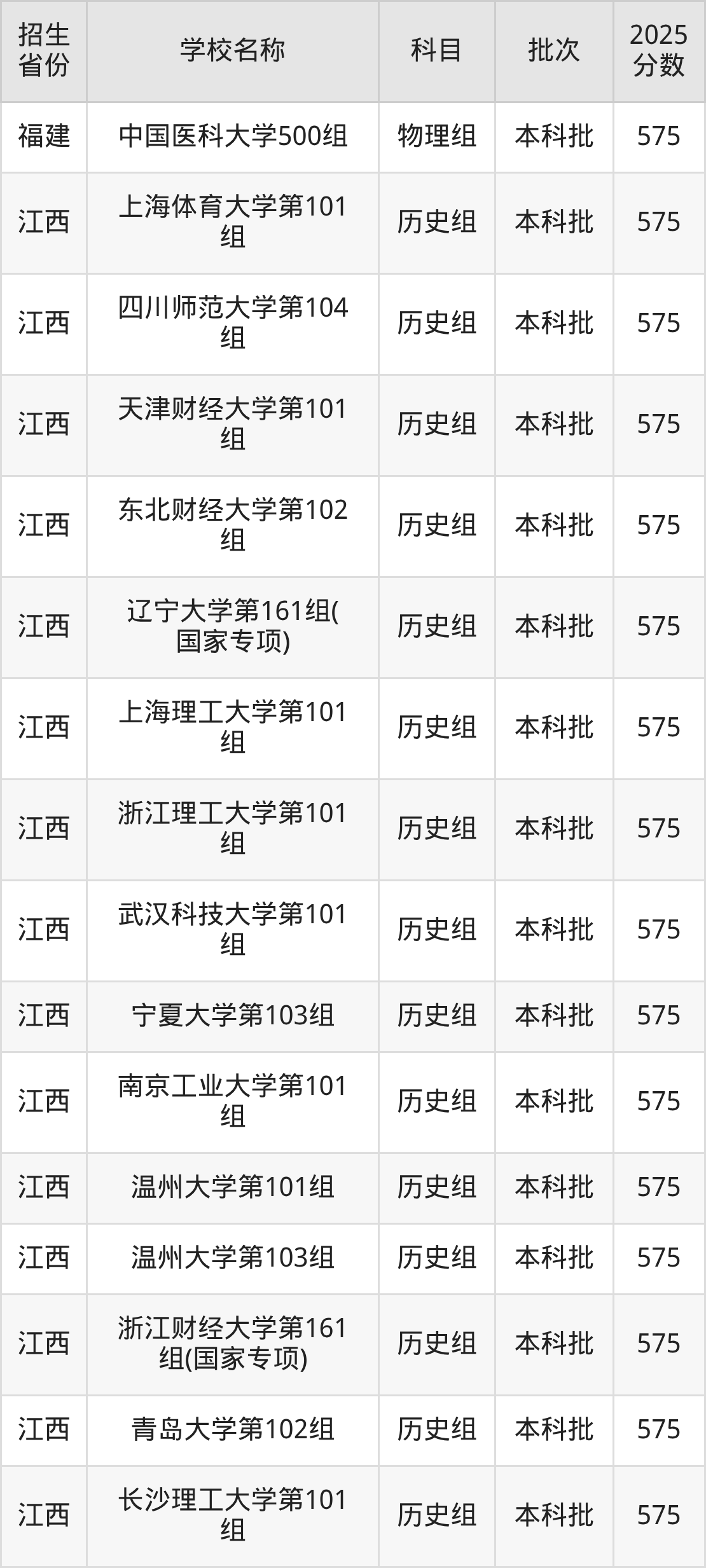江西省历史组分数线是575分的重点大学有:上海体育大学、四川师范大学、天津财经大学、东北财经大学、辽宁大学、上海理工大学、浙江理工大学、武汉科技大学、宁夏大学、南京工业大学。
