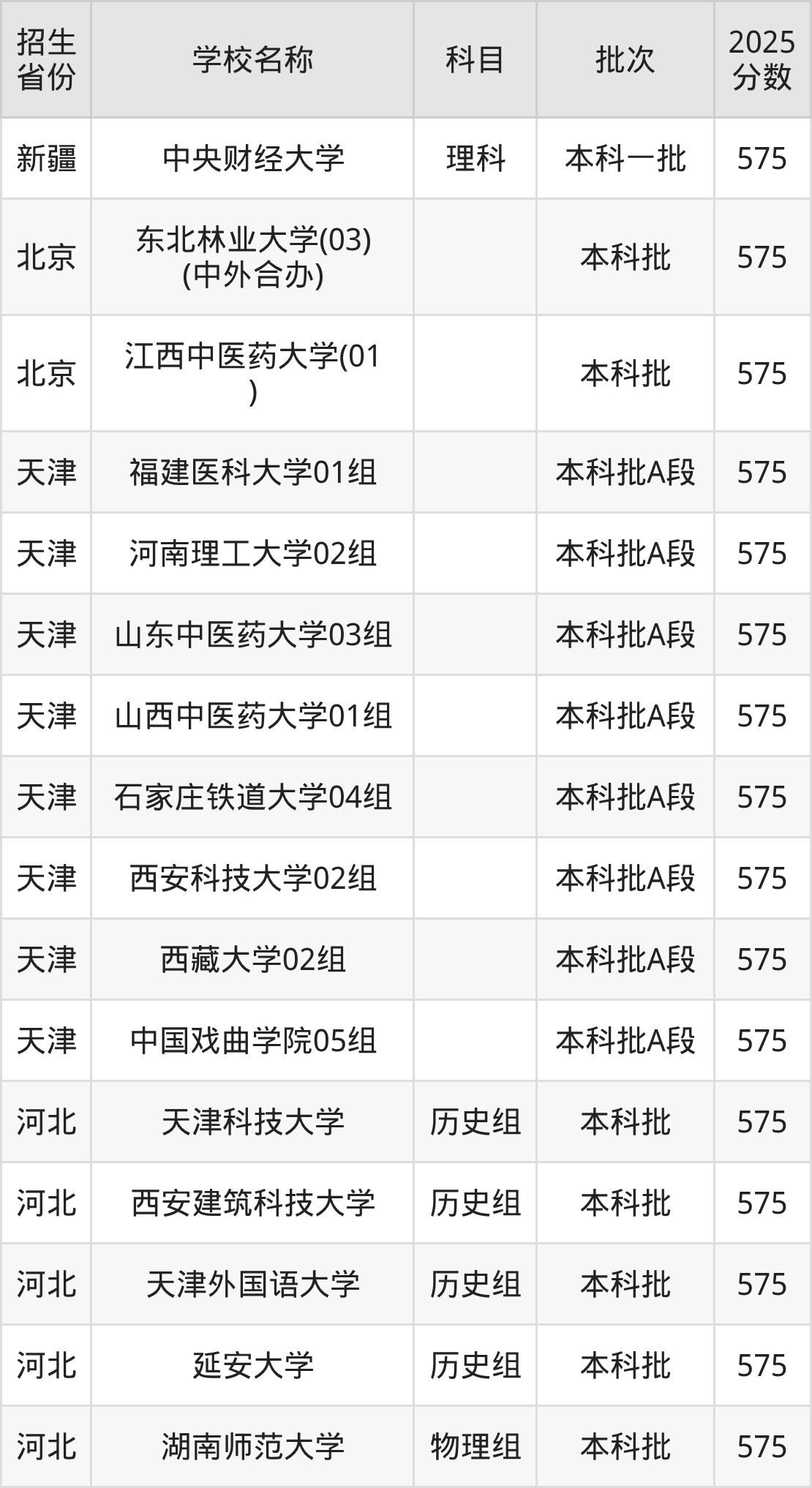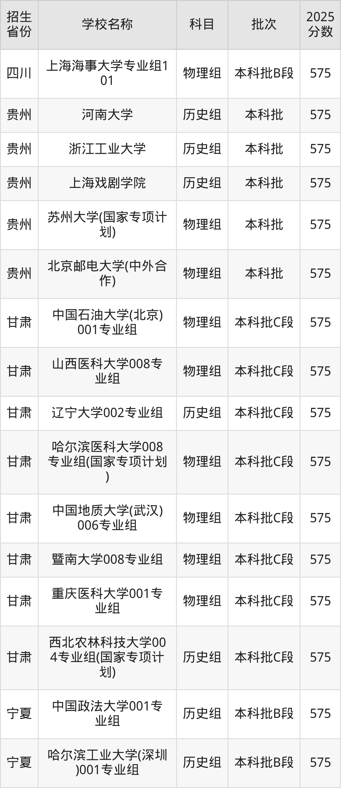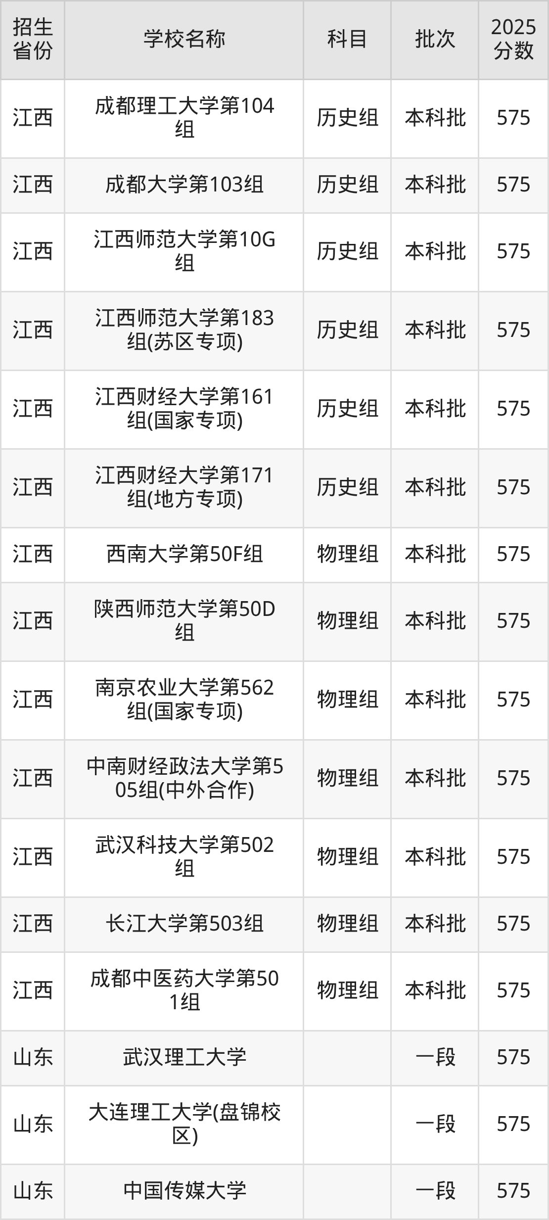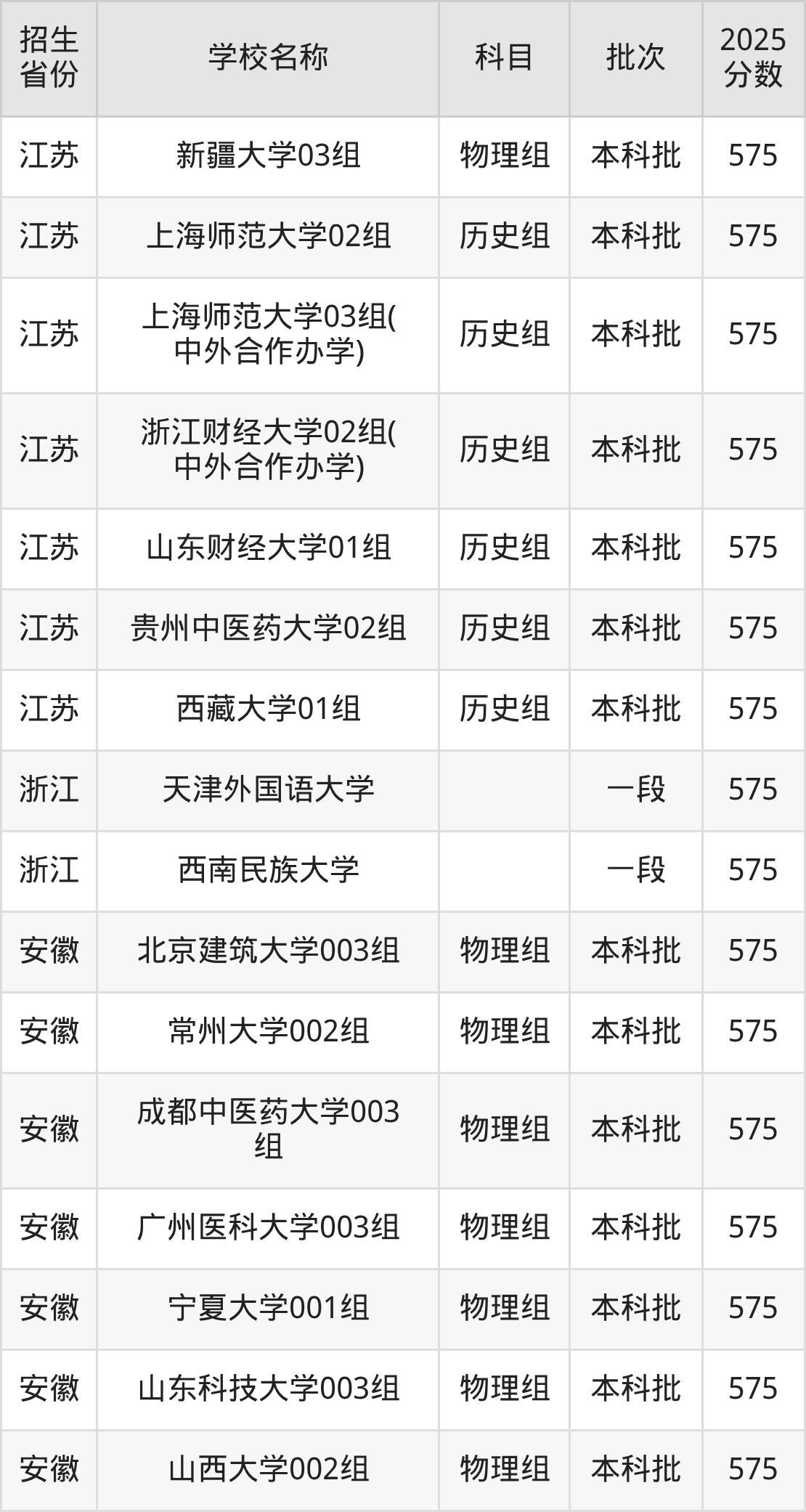筛选全国各省2025年录取分数线为575分的重点大学如下: