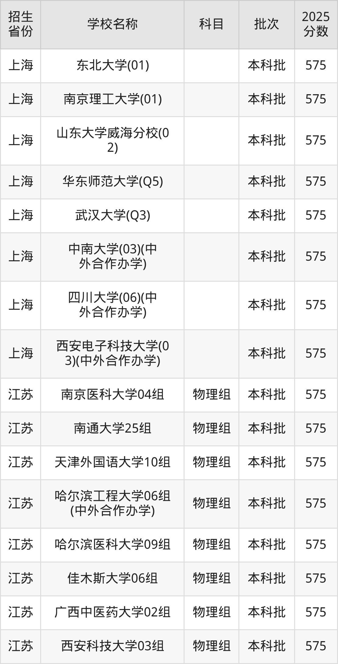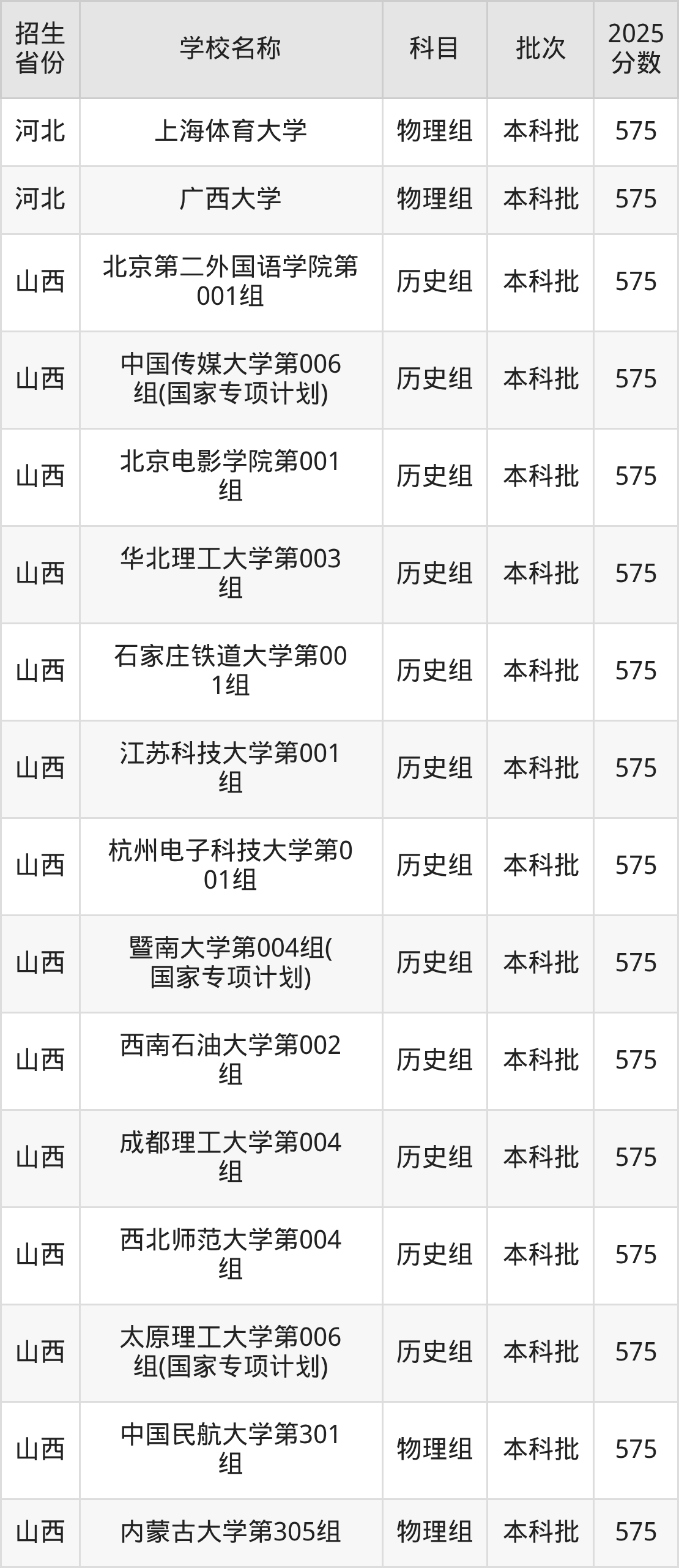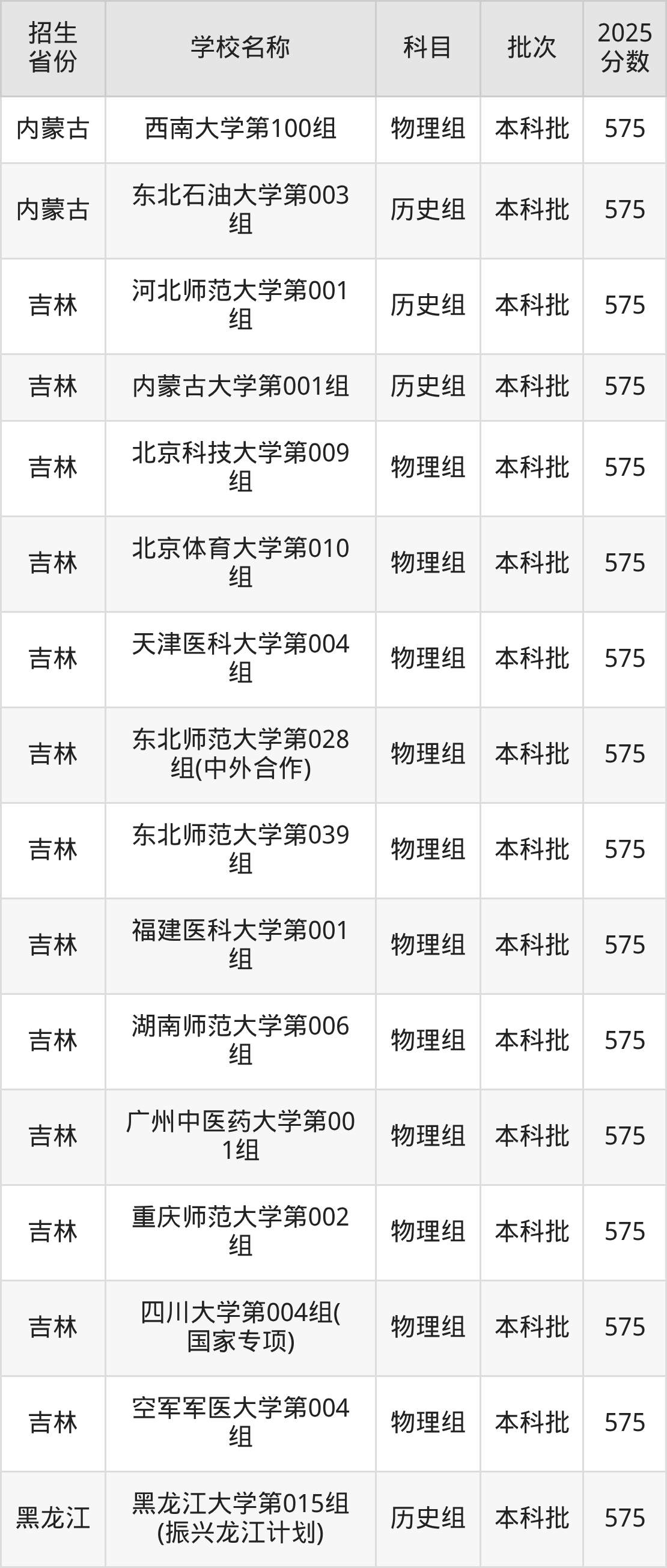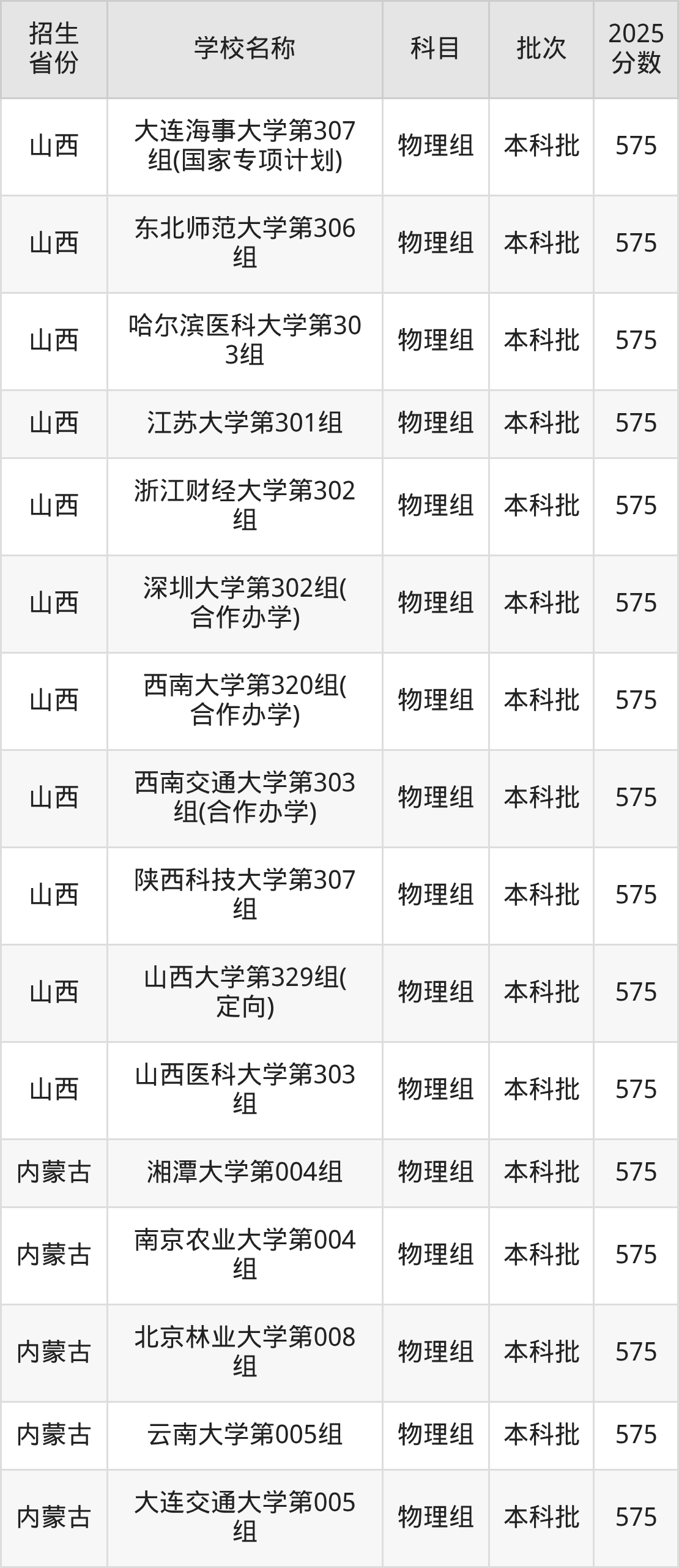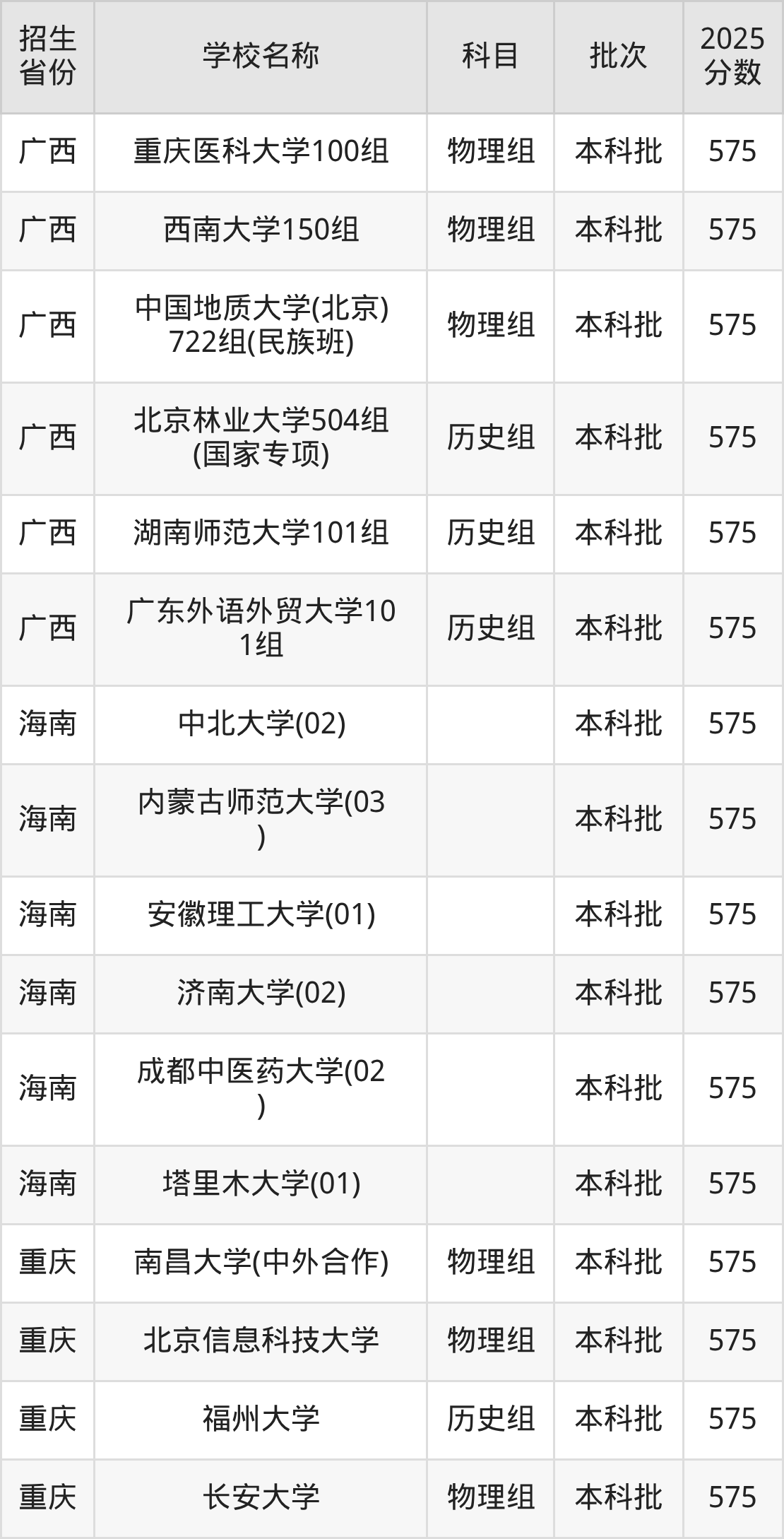 筛选全国各省2025年录取分数线为575分的重点大学如下: