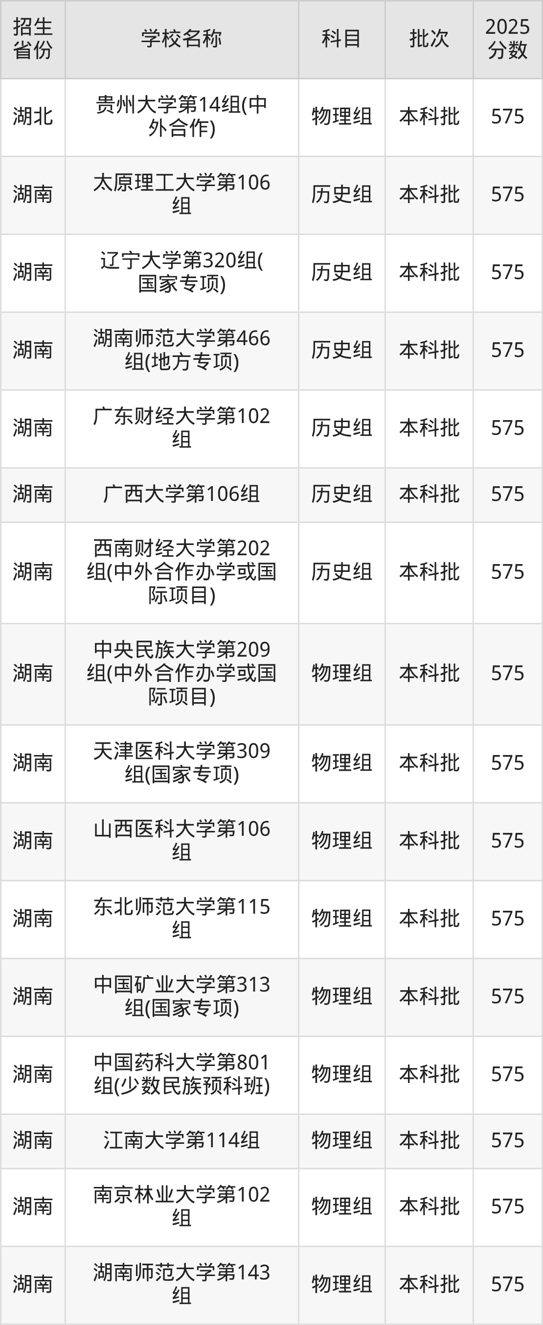 湖南省物理组分数线是575分的重点大学有:中央民族大学、天津医科大学、山西医科大学、东北师范大学、中国矿业大学、中国药科大学、江南大学、南京林业大学、湖南师范大学、广东财经大学。