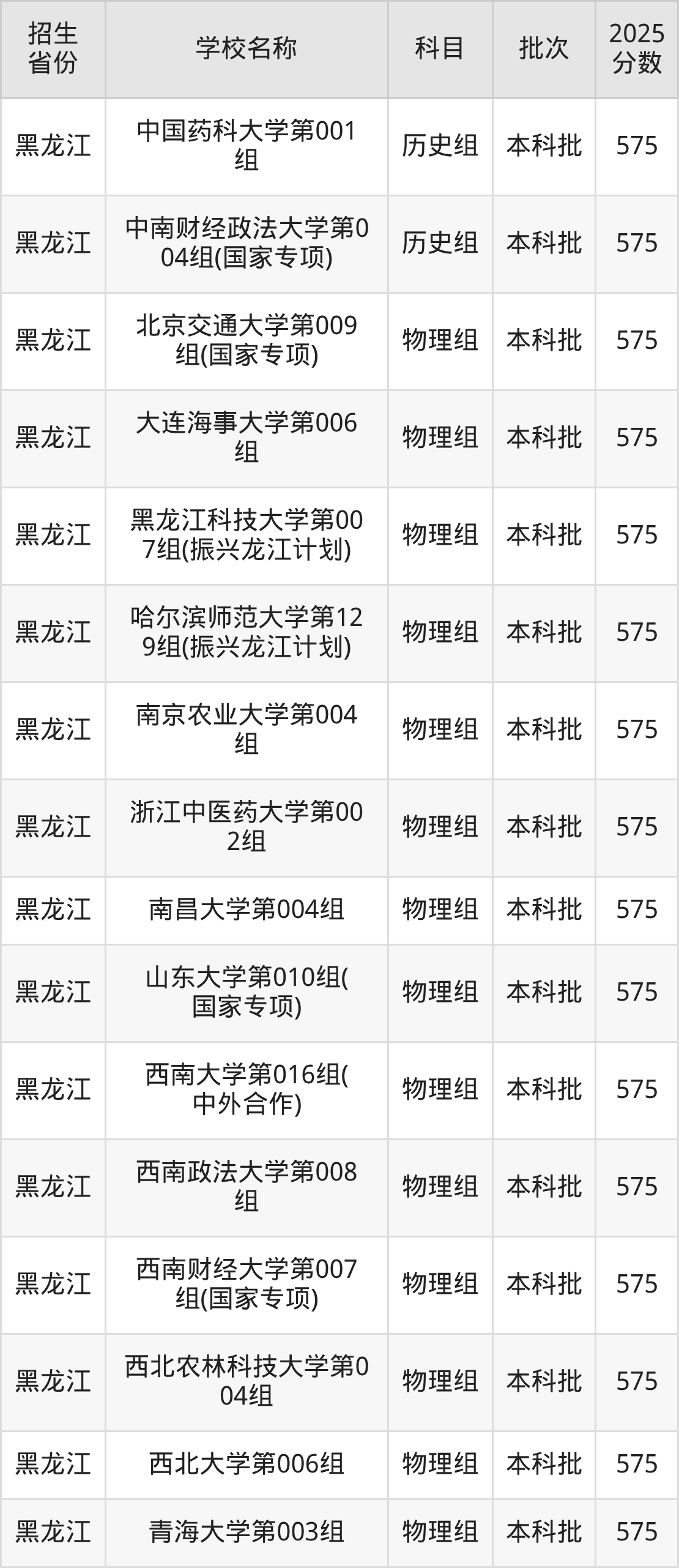 黑龙江省历史组分数线是575分的重点大学有:黑龙江大学、中国药科大学、中南财经政法大学。