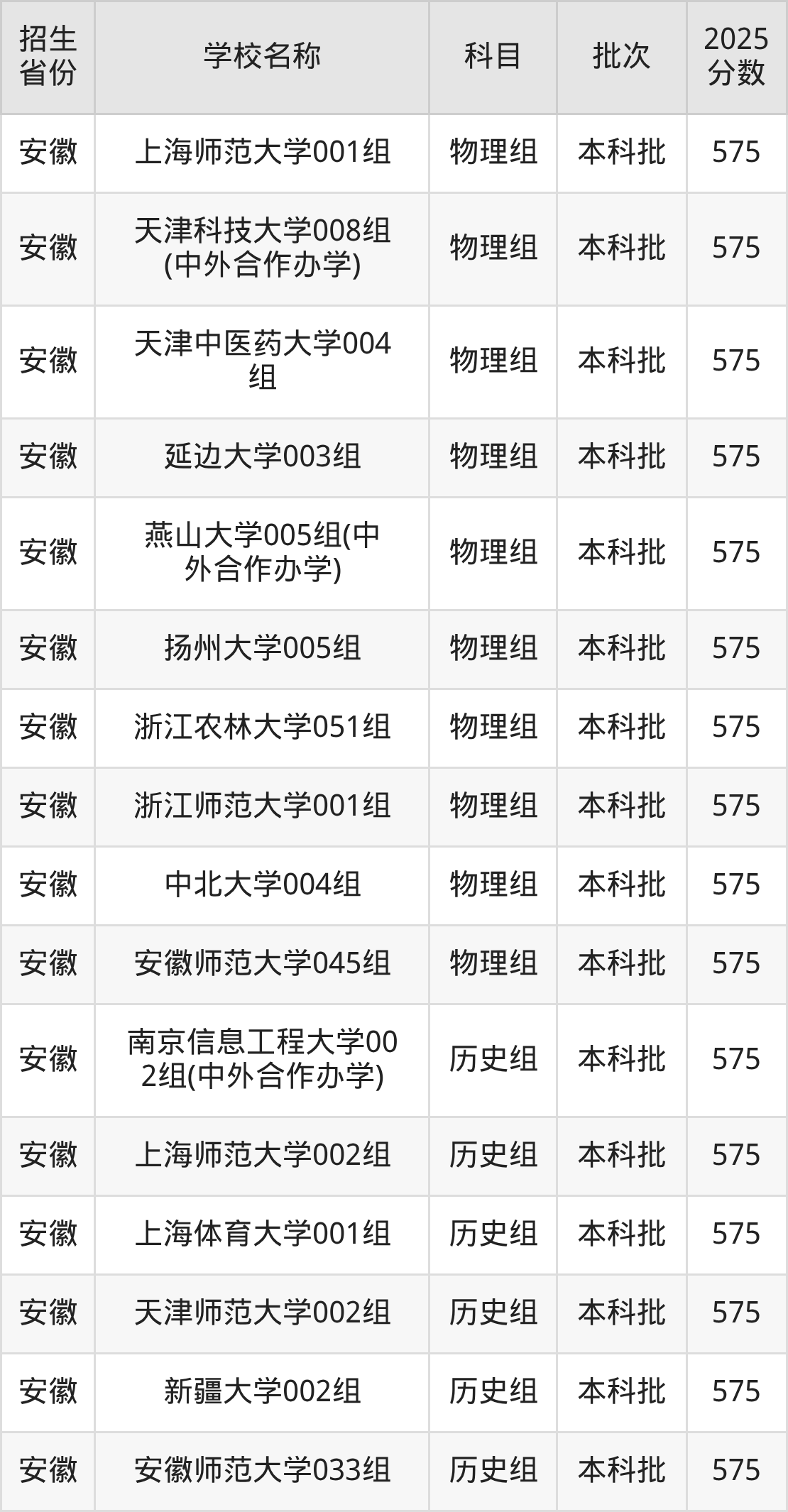 安徽省历史组分数线是575分的重点大学有:南京信息工程大学、上海师范大学、上海体育大学、天津师范大学、新疆大学、安徽师范大学。