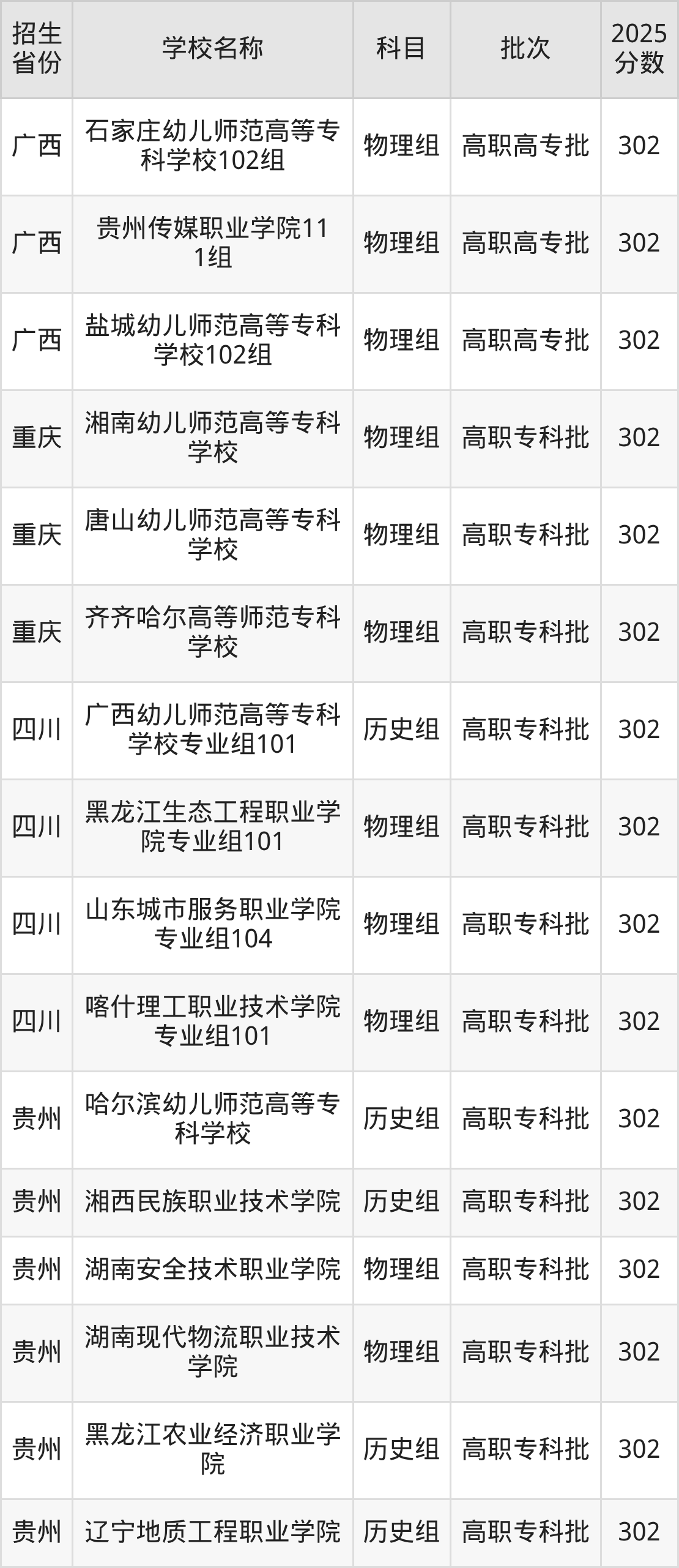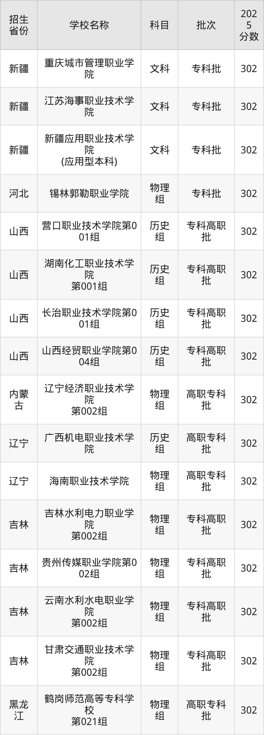 二、各省302分的公办专科大学名单