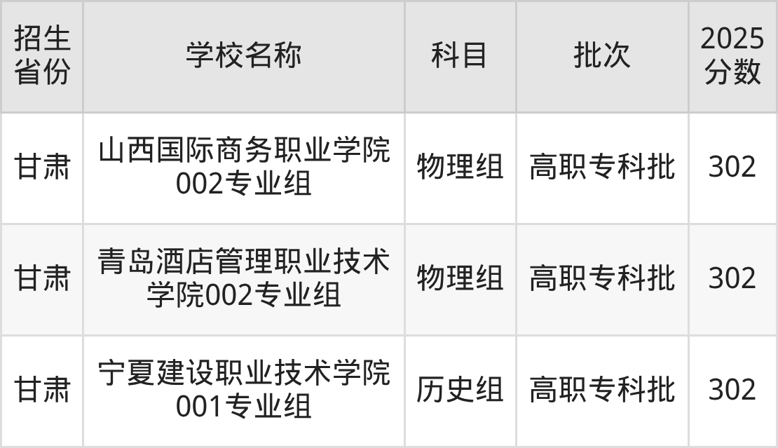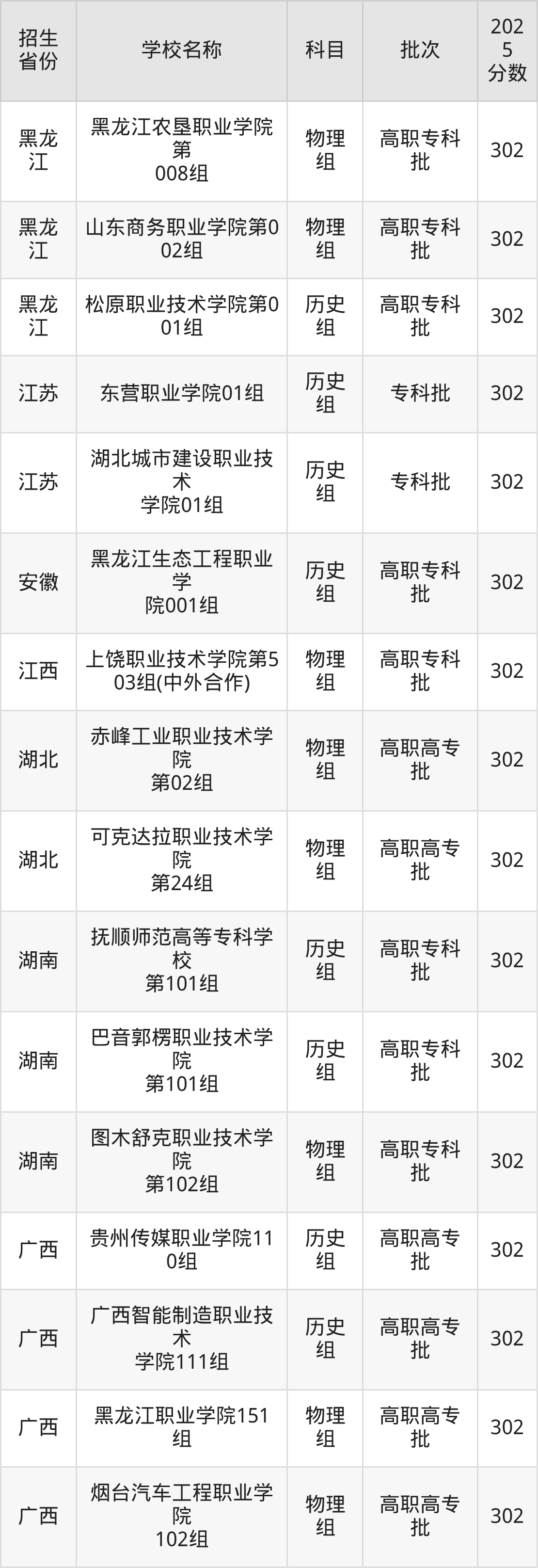 筛选全国各省2025年录取分数线为302分的公办专科大学如下:
