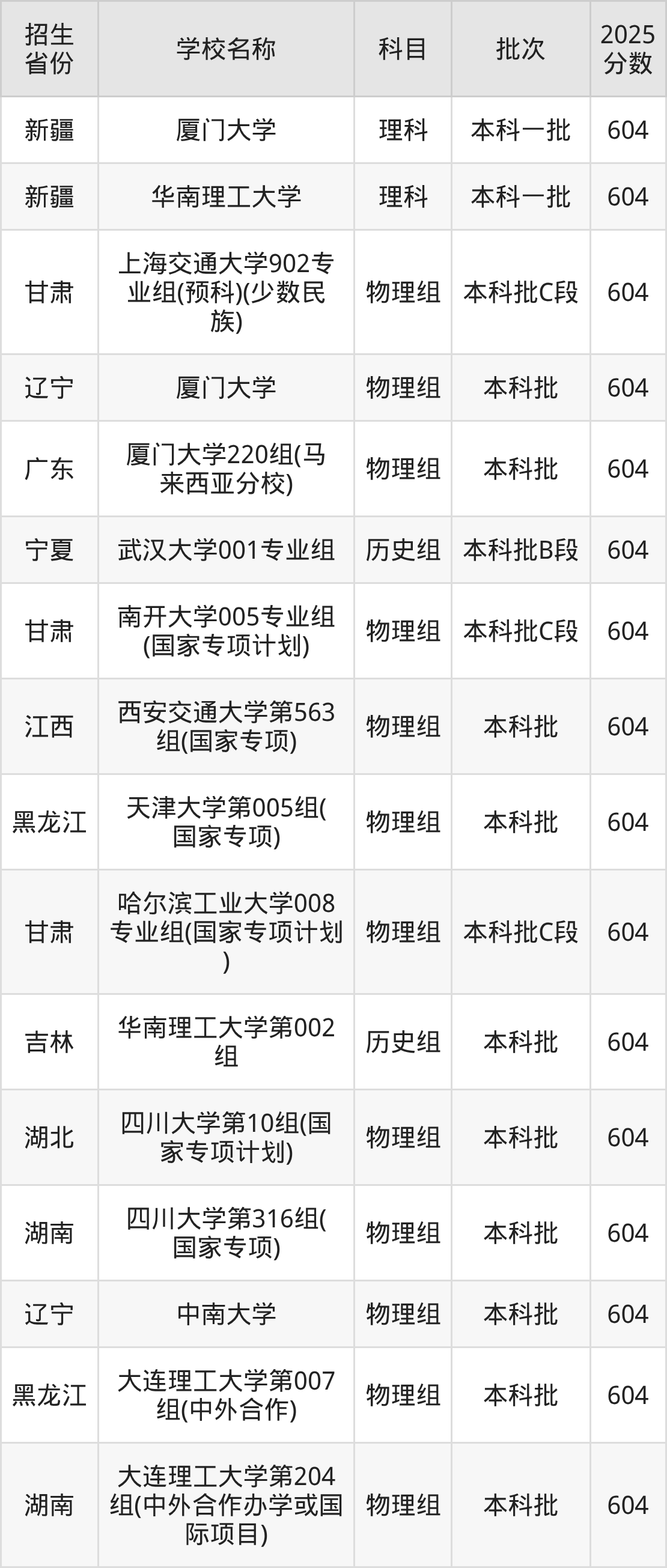 二、各省604分的985大学名单