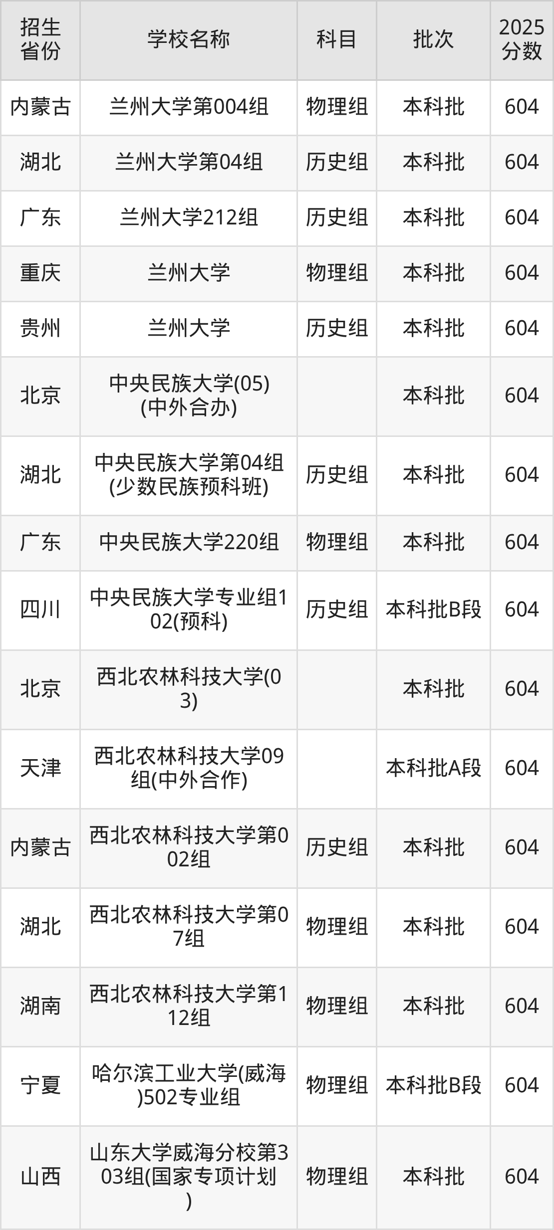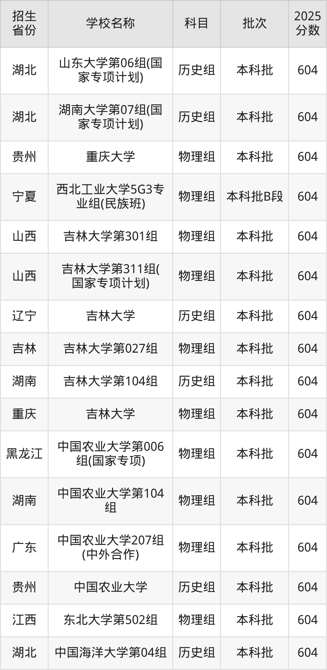 筛选全国各省2025年录取分数线为604分的985大学如下:
