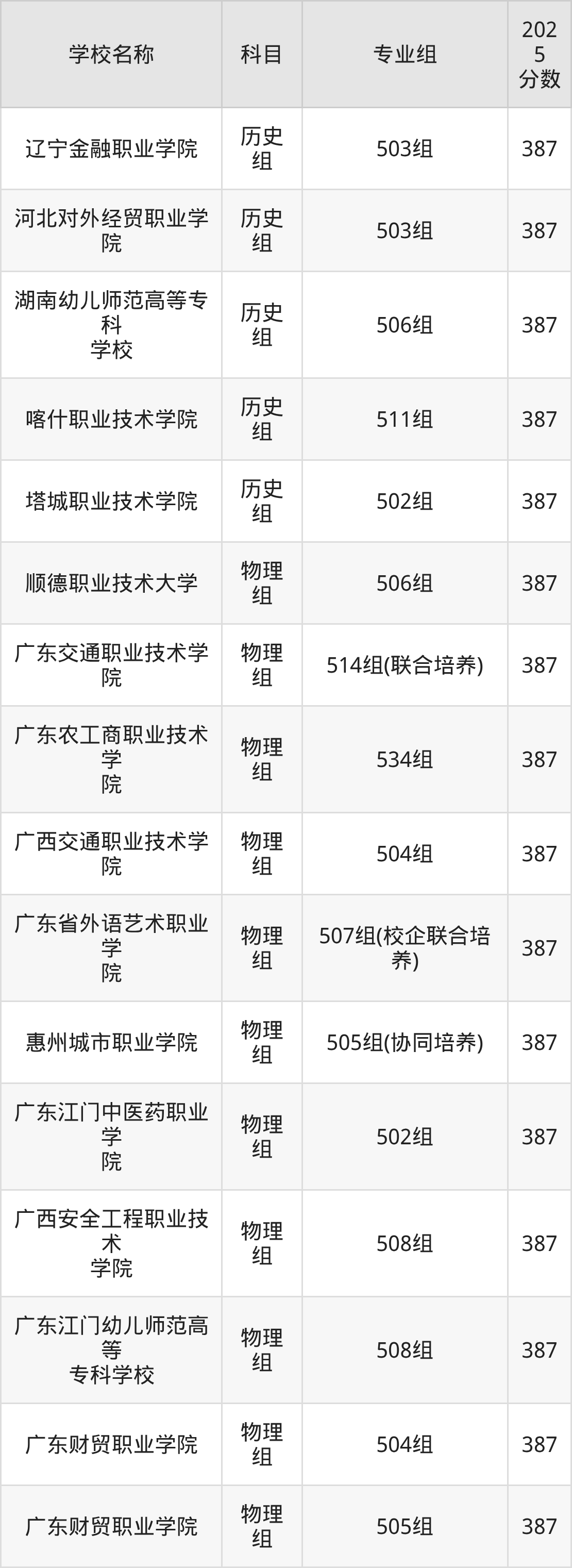 广东高考录取分数线在387分左右的公办院校专业组一共有16个,其中历史组有:辽宁金融职业学院(387分)、河北对外经贸职业学院(387分)、湖南幼儿师范高等专科学校(387分),物理组有:顺德职业技术大学(387分)、广东交通职业技术学院(387分)、广东农工商职业技术学院(387分)。