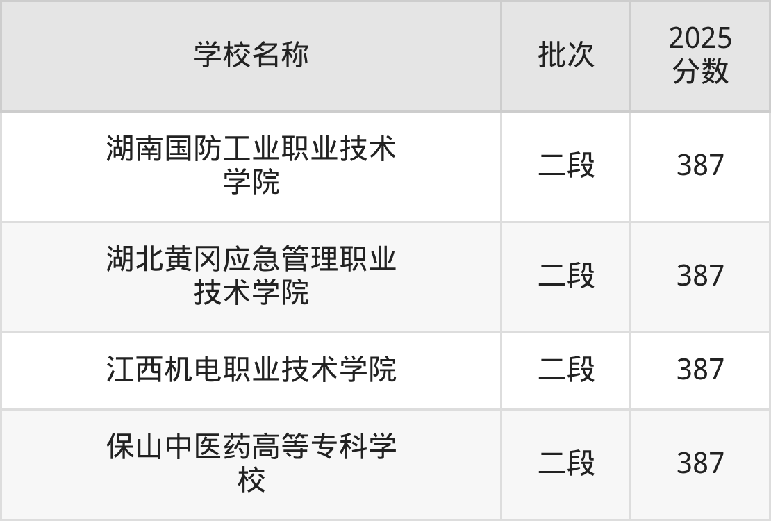 山东高考录取分数线在387分左右的公办大学一共有4所。分别是湖南国防工业职业技术学院(387分)、湖北黄冈应急管理职业技术学院(387分)、江西机电职业技术学院(387分)