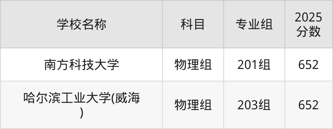 广东高考录取分数线在652分左右的公办院校专业组一共有2个,其中物理组有:南方科技大学(652分)、哈尔滨工业大学(威海)(652分)。
