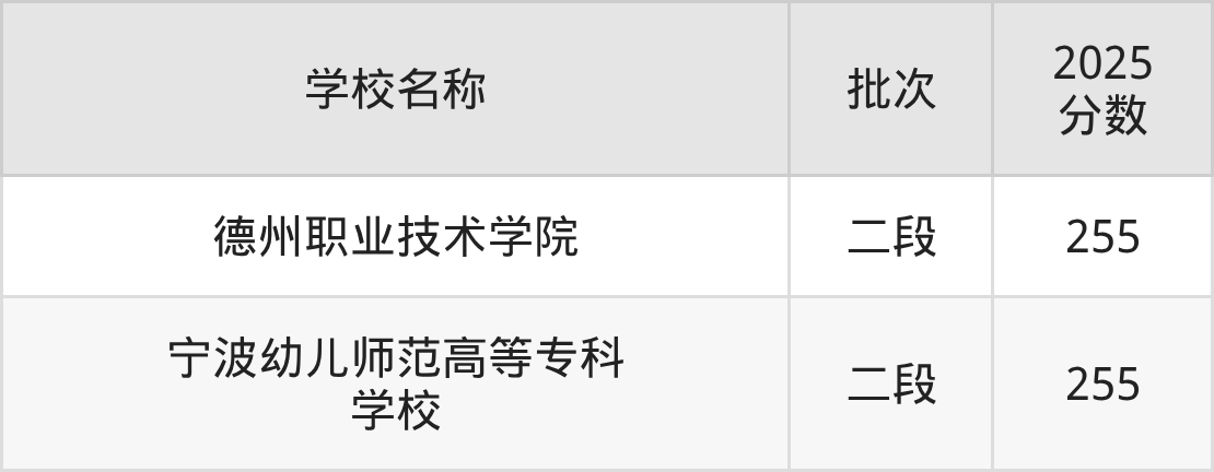 山东高考录取分数线在255分左右的公办大学一共有2所。分别是德州职业技术学院(255分)、宁波幼儿师范高等专科学校(255分)