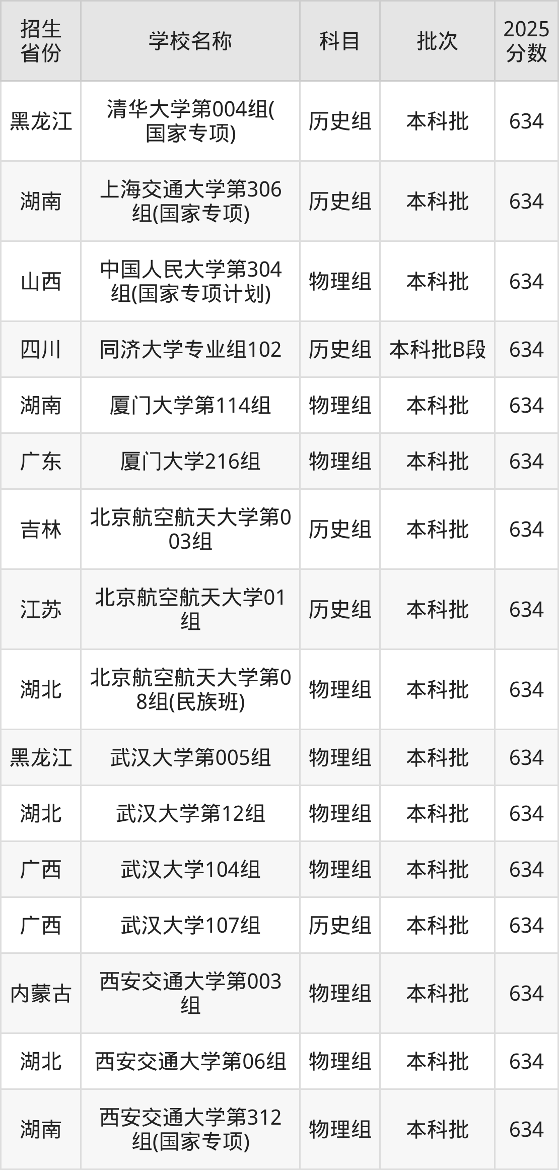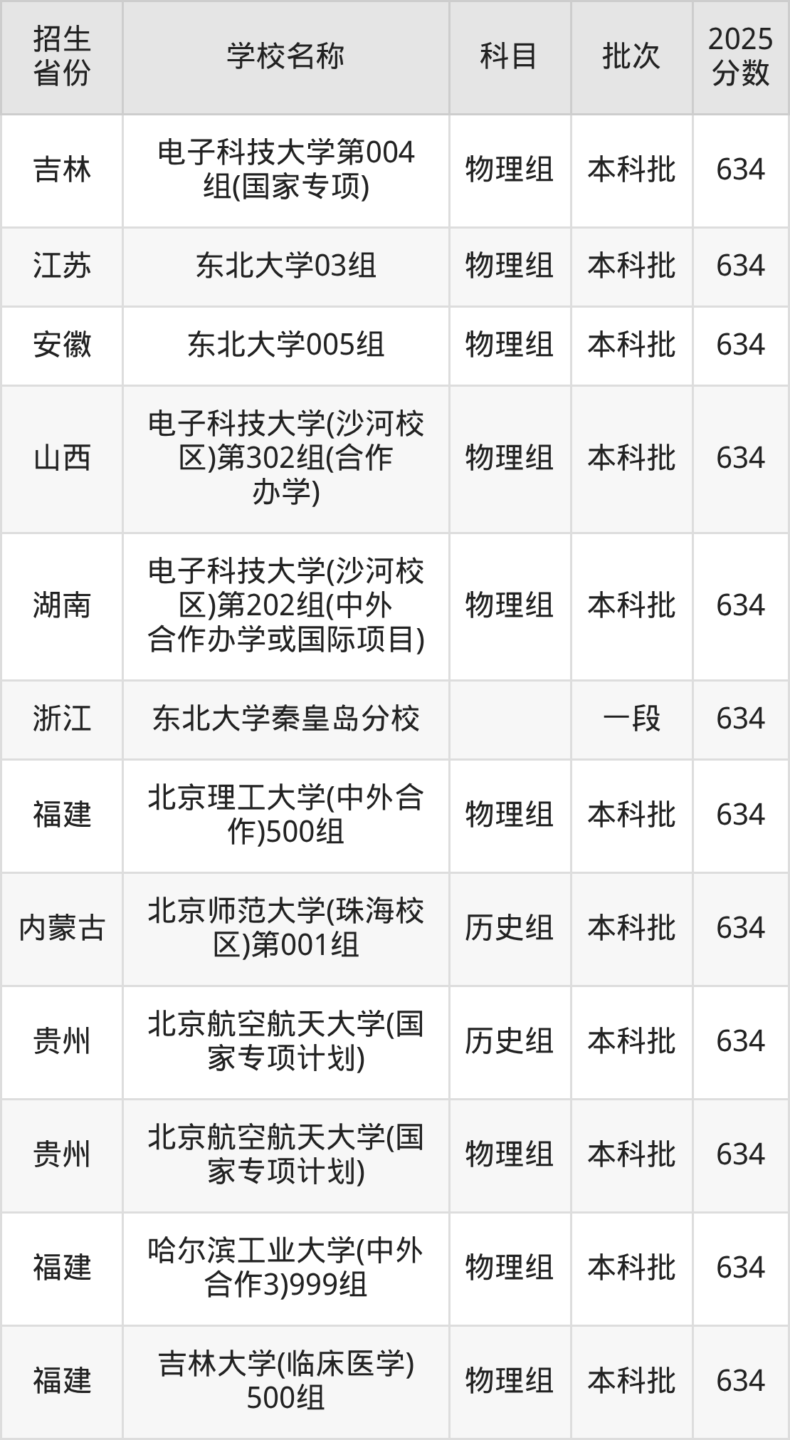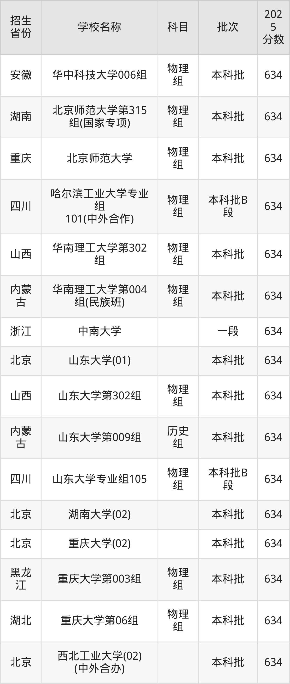 筛选全国各省2025年录取分数线为634分的985大学如下: