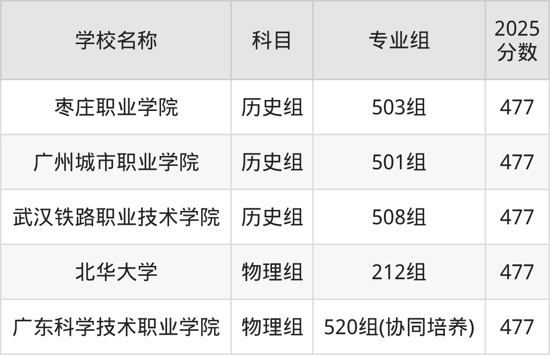 广东高考录取分数线在477分左右的公办院校专业组一共有5个,其中历史组有:枣庄职业学院(477分)、广州城市职业学院(477分)、武汉铁路职业技术学院(477分),物理组有:北华大学(477分)、广东科学技术职业学院(477分)。