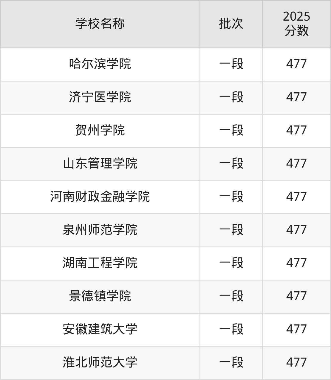 山东高考录取分数线在477分左右的公办大学一共有10所。分别是哈尔滨学院(477分)、济宁医学院(477分)、贺州学院(477分)