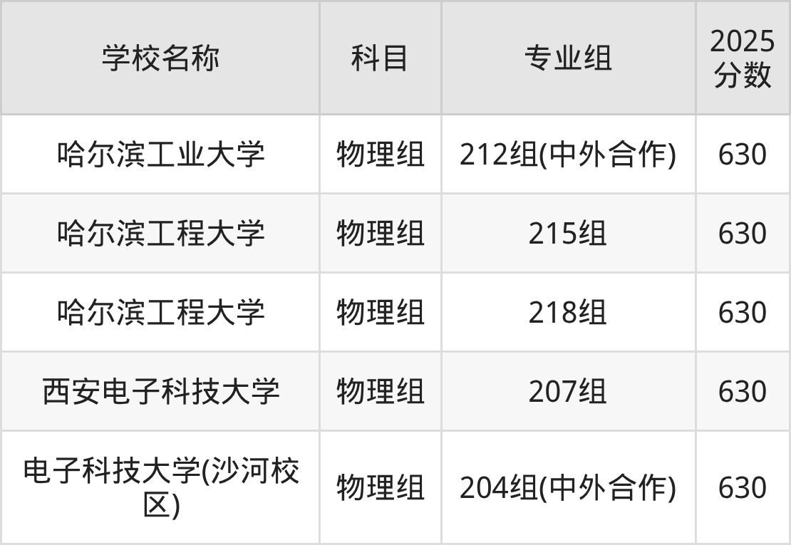 广东高考录取分数线在630分左右的公办院校专业组一共有5个,其中物理组有:哈尔滨工业大学(630分)、哈尔滨工程大学(630分)、西安电子科技大学(630分)。