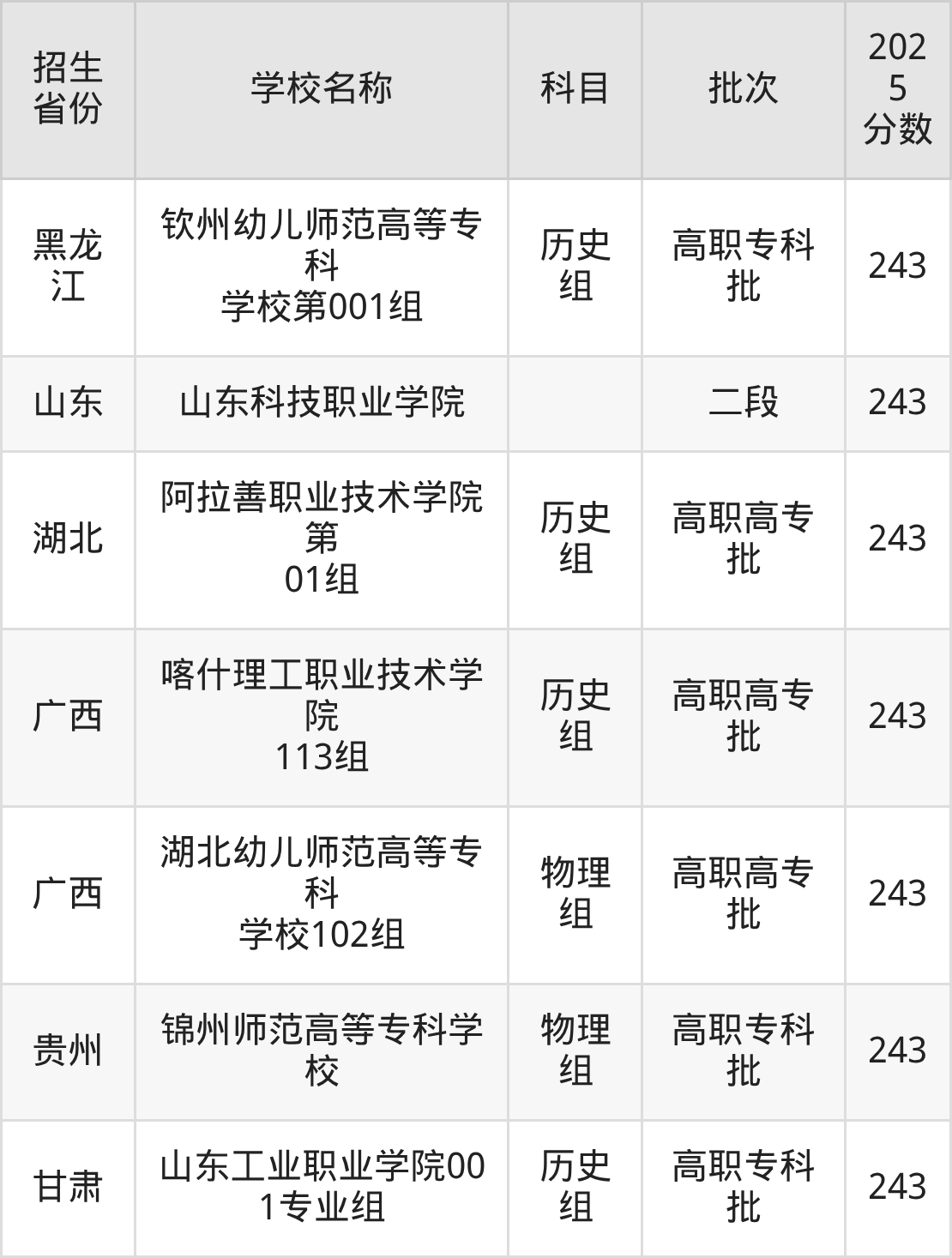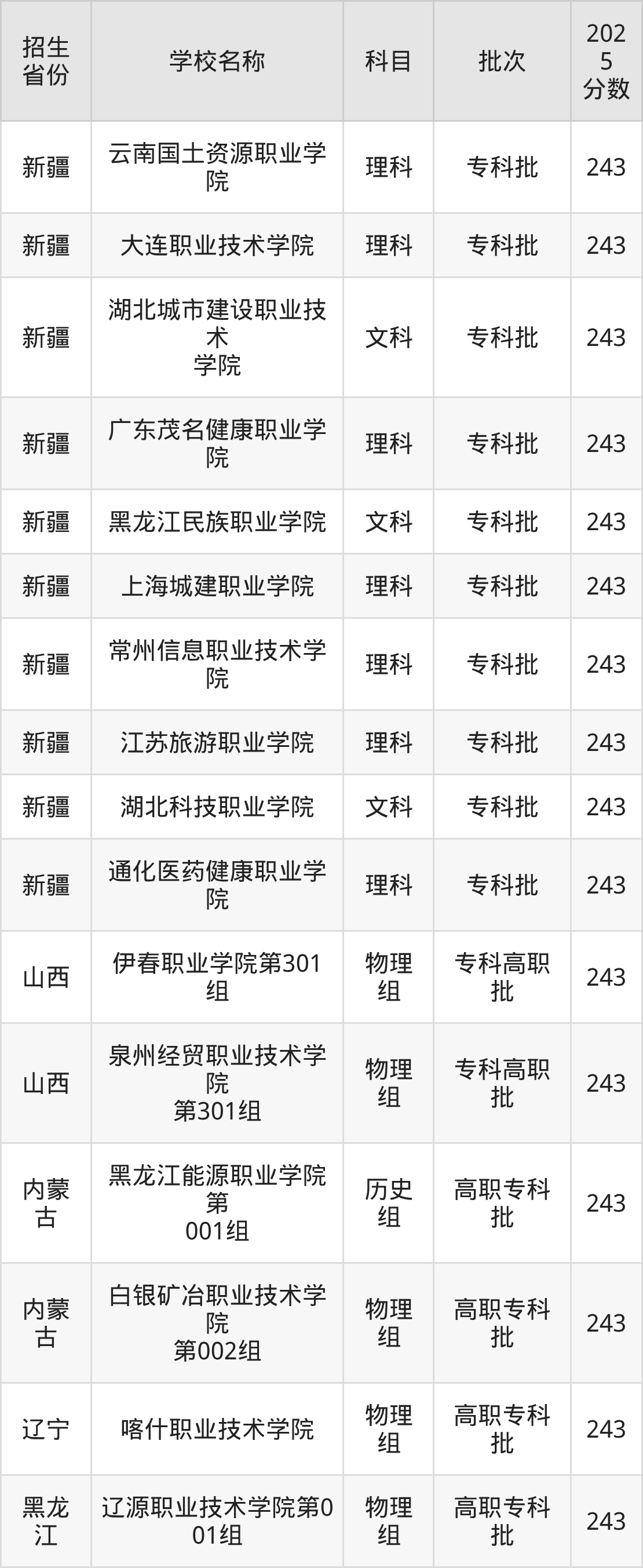 筛选全国各省2025年录取分数线为243分的公办专科大学如下: