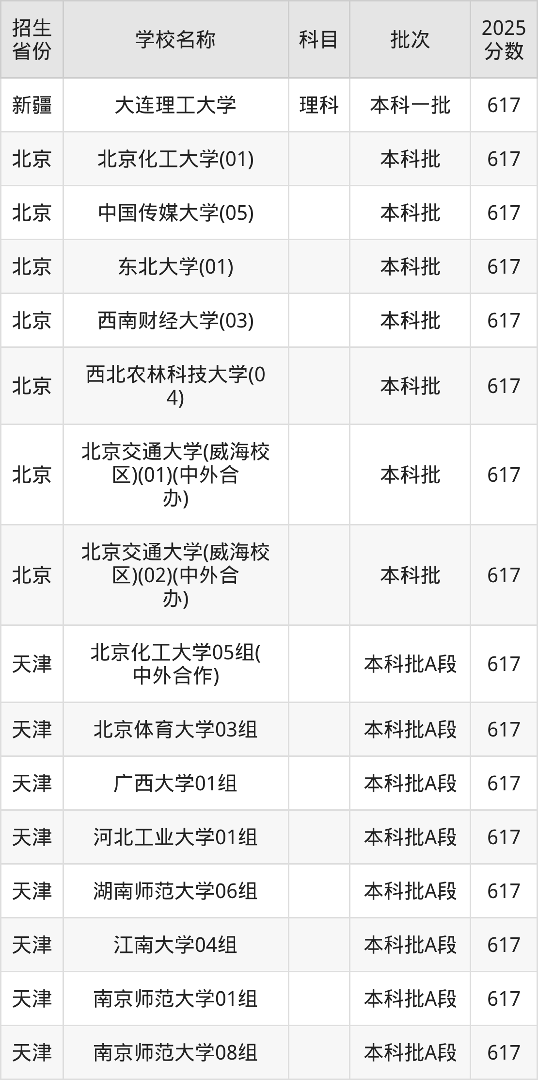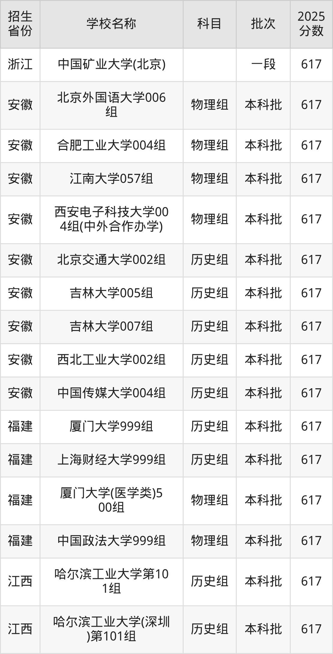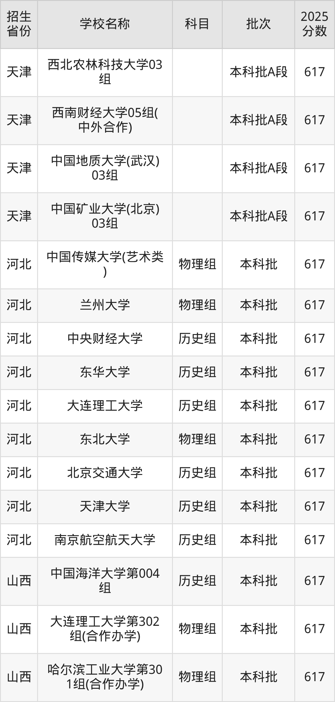 筛选全国各省2025年录取分数线为617分的211大学如下: