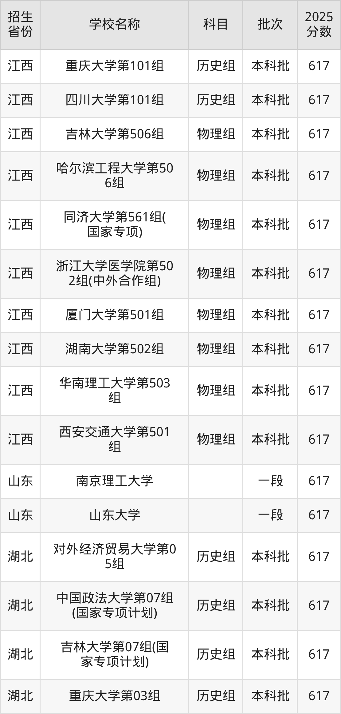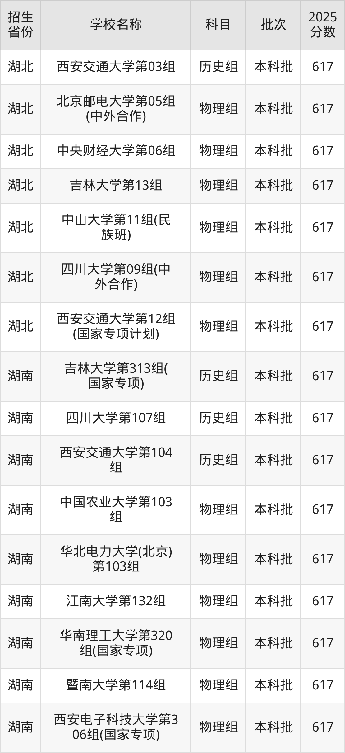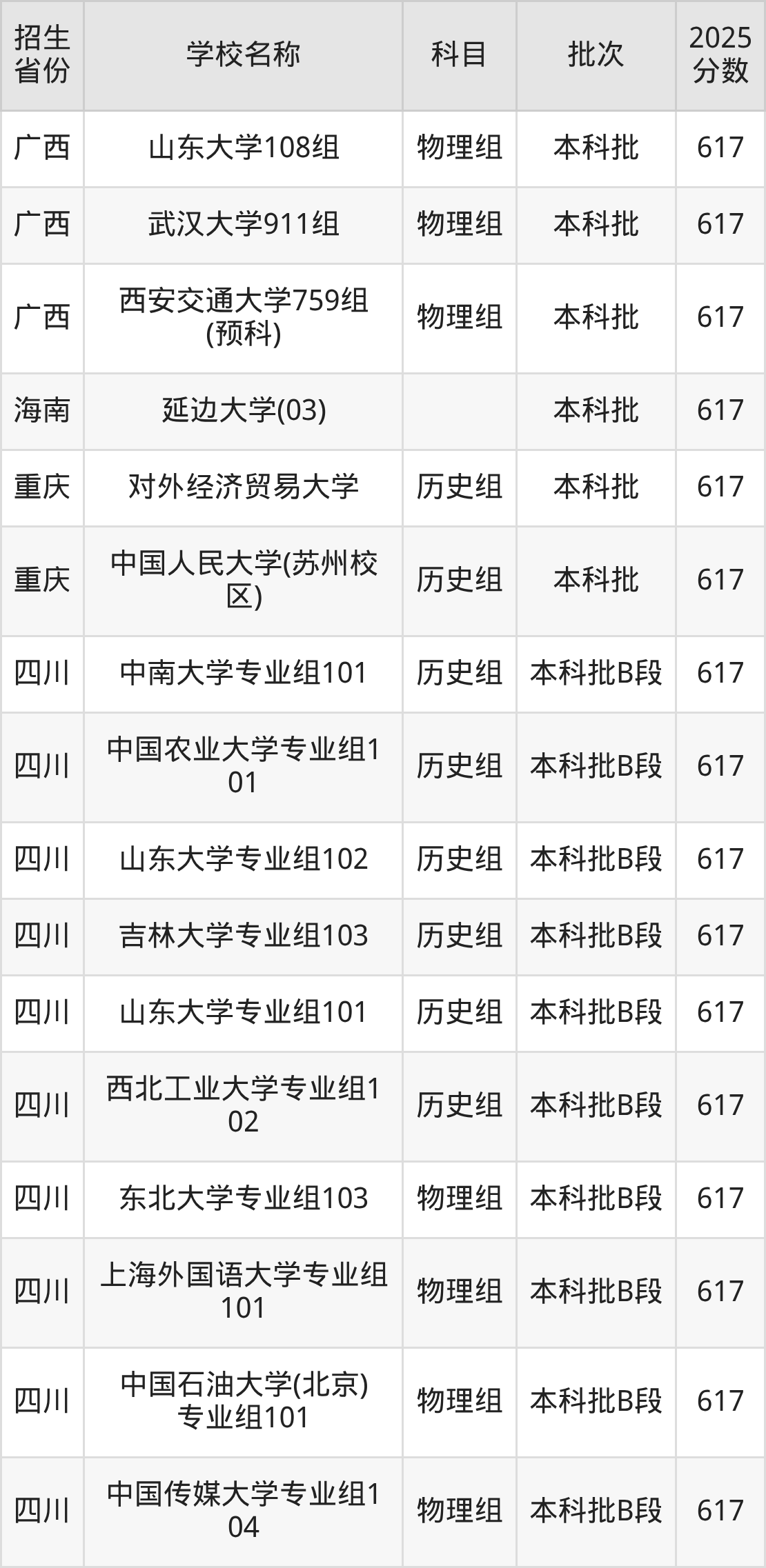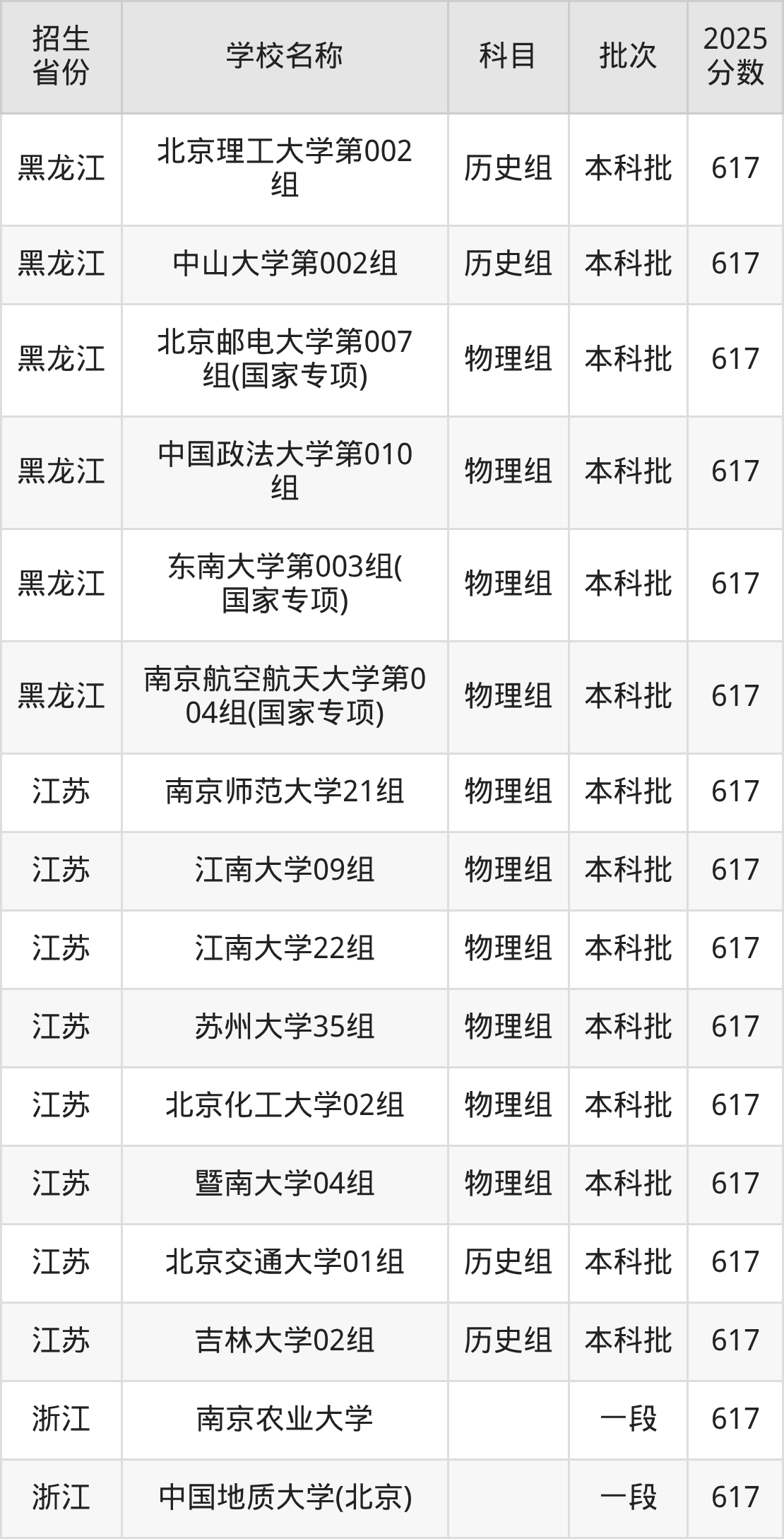 筛选全国各省2025年录取分数线为617分的211大学如下: