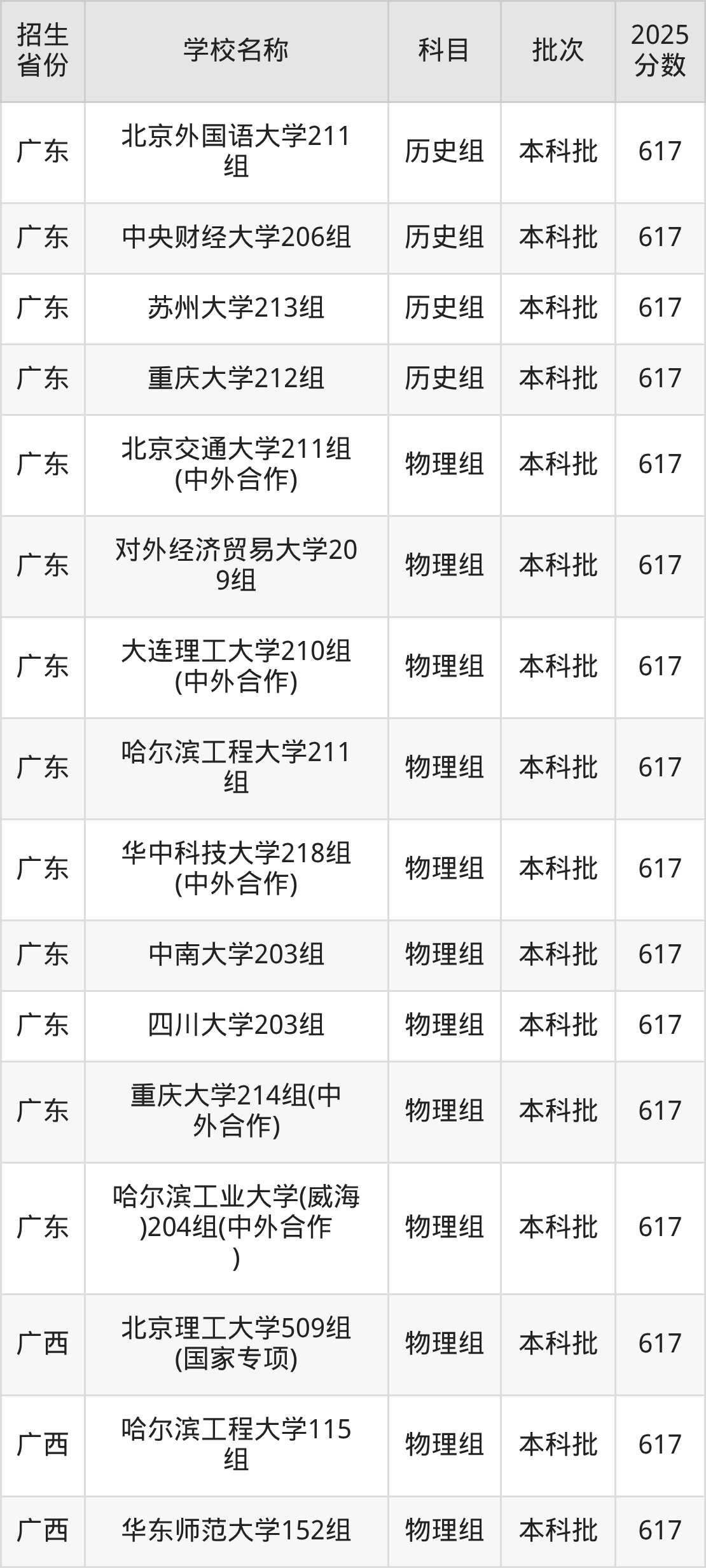 广东省历史组分数线是617分的211大学有:北京外国语大学、中央财经大学、苏州大学、重庆大学。