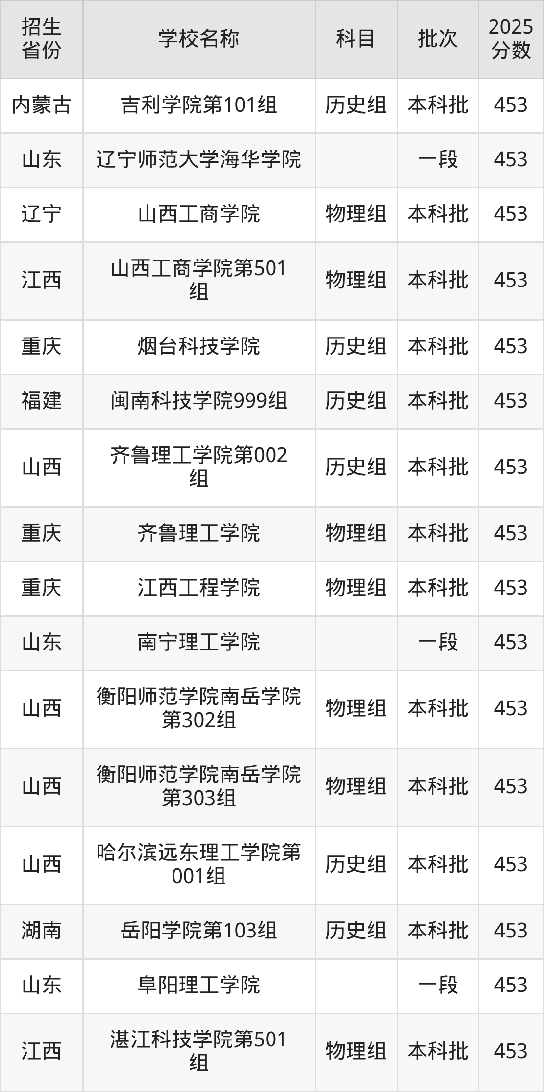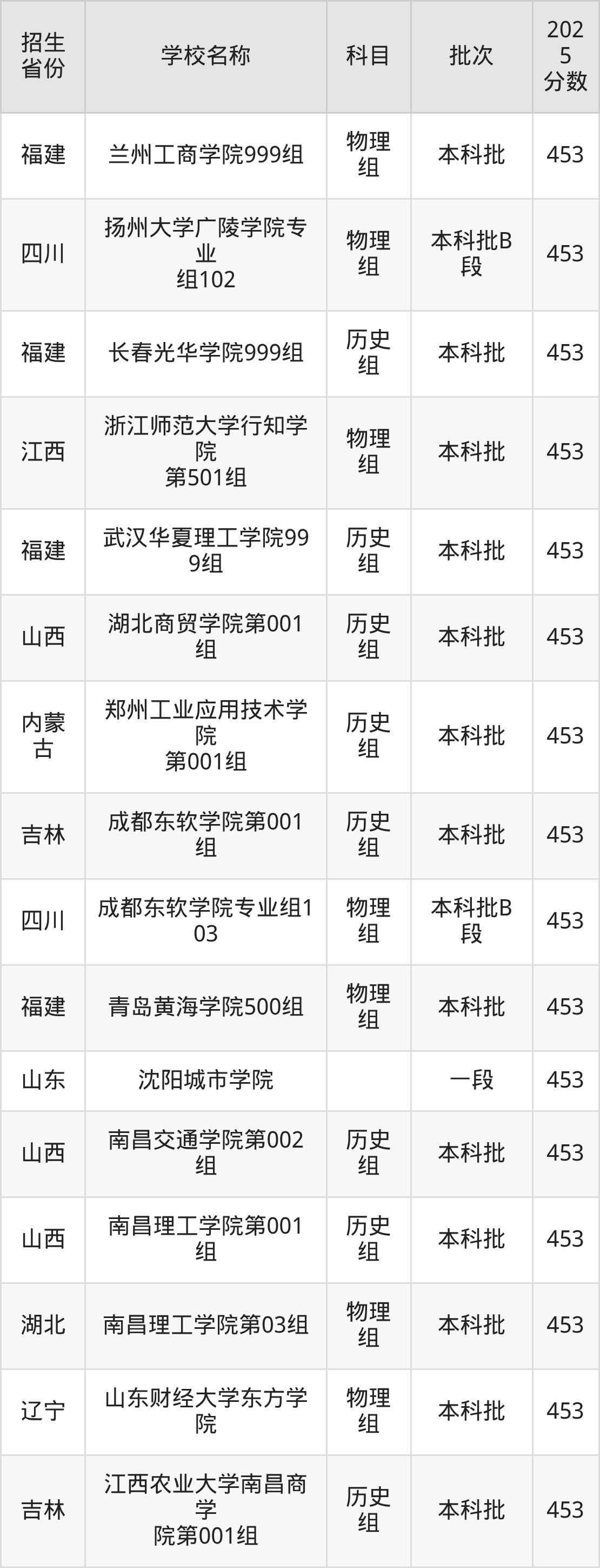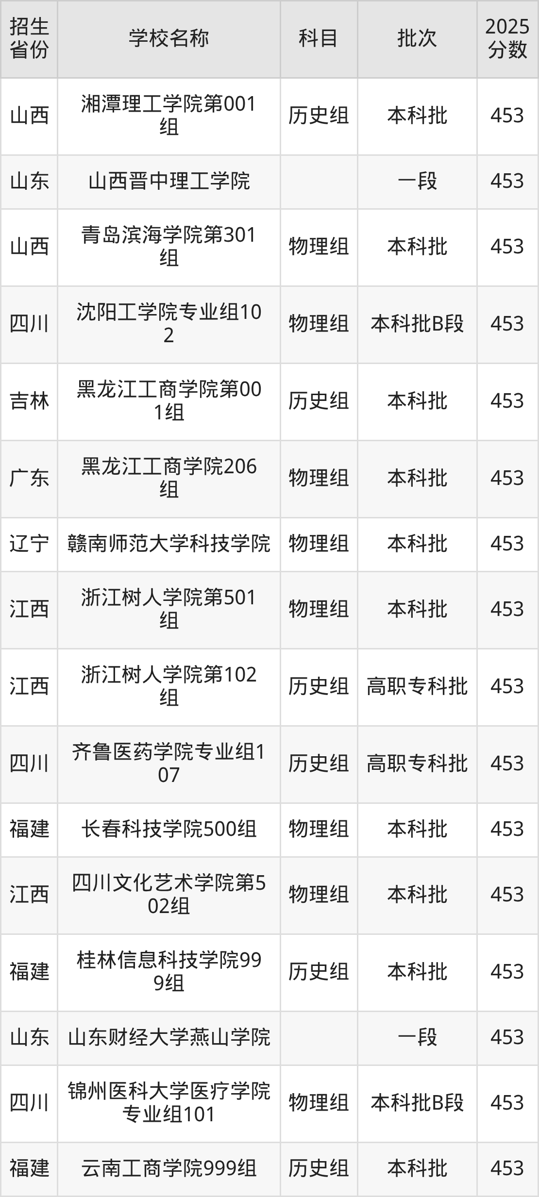 筛选全国各省2025年录取分数线为453分的二本民办大学如下: