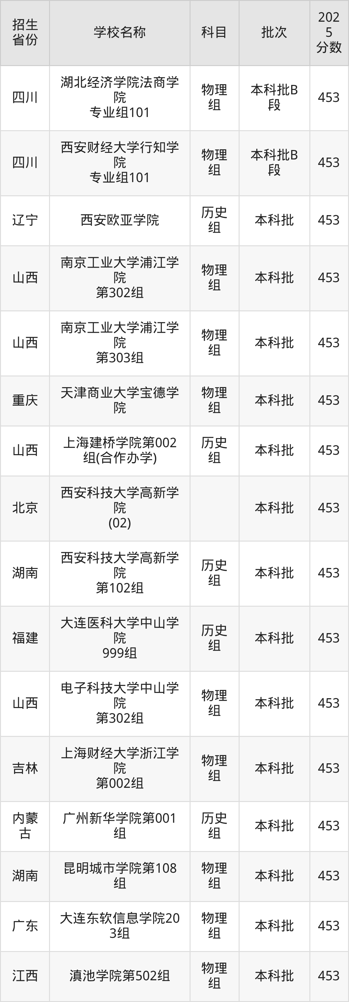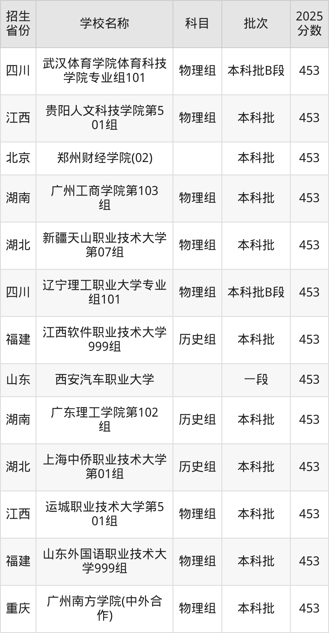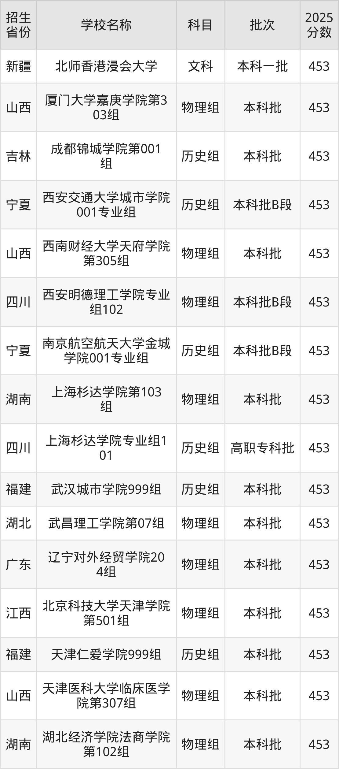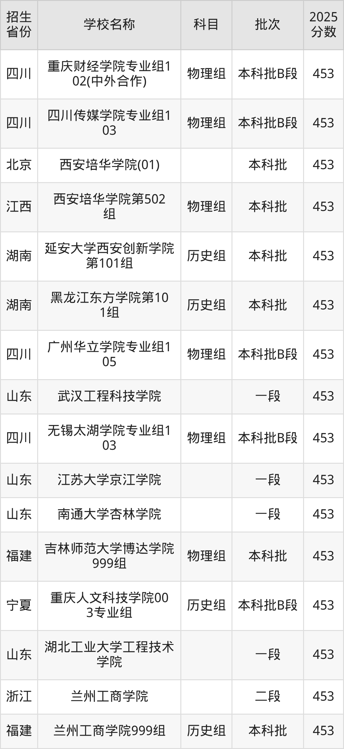 筛选全国各省2025年录取分数线为453分的二本民办大学如下: