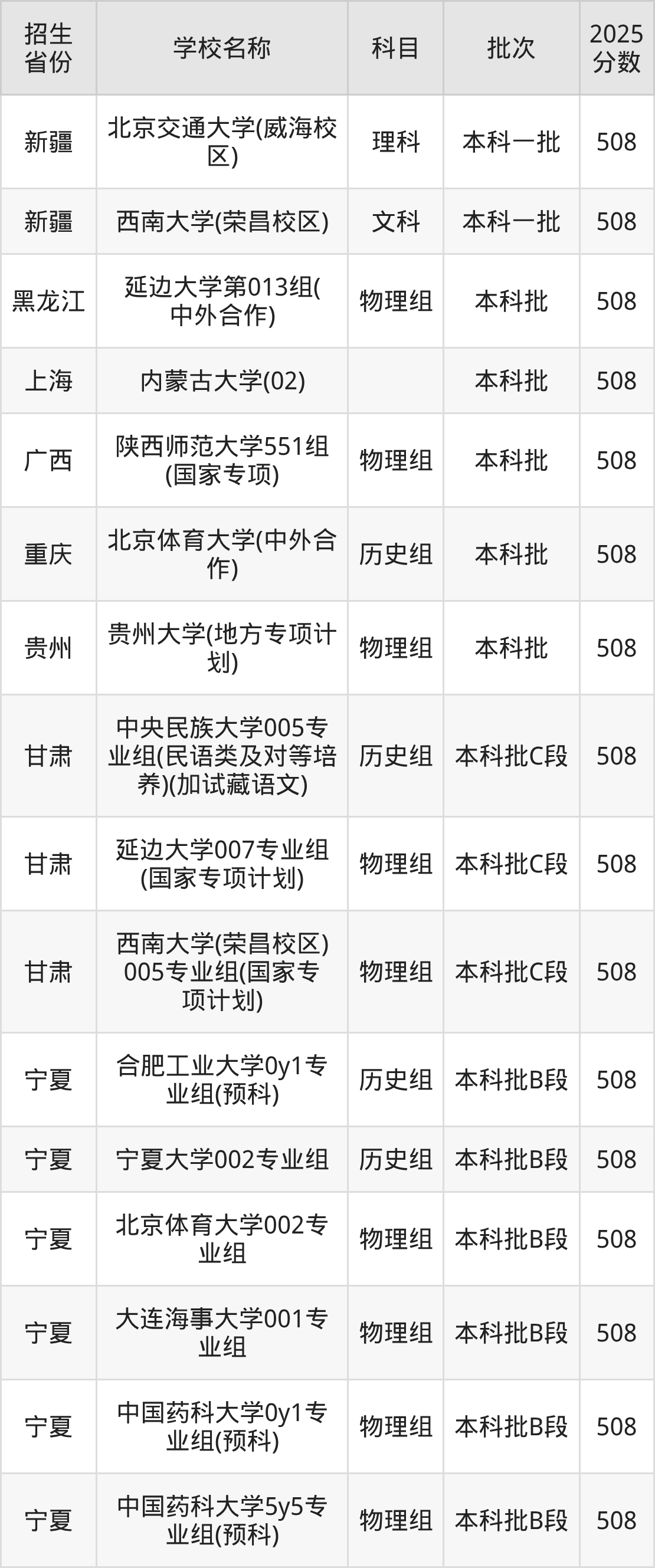 西南大学(荣昌校区)、延边大学、内蒙古大学、贵州大学(地方专项计划)、宁夏大学