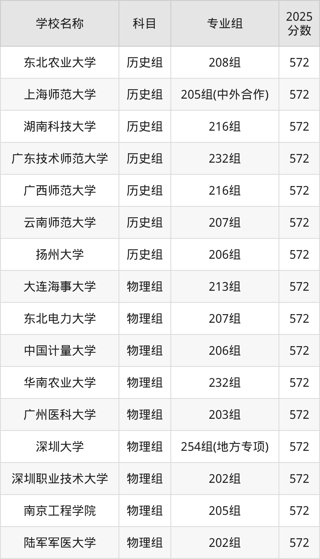 广东高考录取分数线在572分左右的公办院校专业组一共有16个,其中历史组有:东北农业大学(572分)、上海师范大学(572分)、湖南科技大学(572分),物理组有:大连海事大学(572分)、东北电力大学(572分)、中国计量大学(572分)。