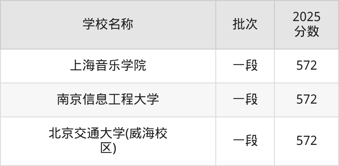 山东高考录取分数线在572分左右的公办大学一共有3所。分别是上海音乐学院(572分)、南京信息工程大学(572分)、北京交通大学(威海校区)(572分)