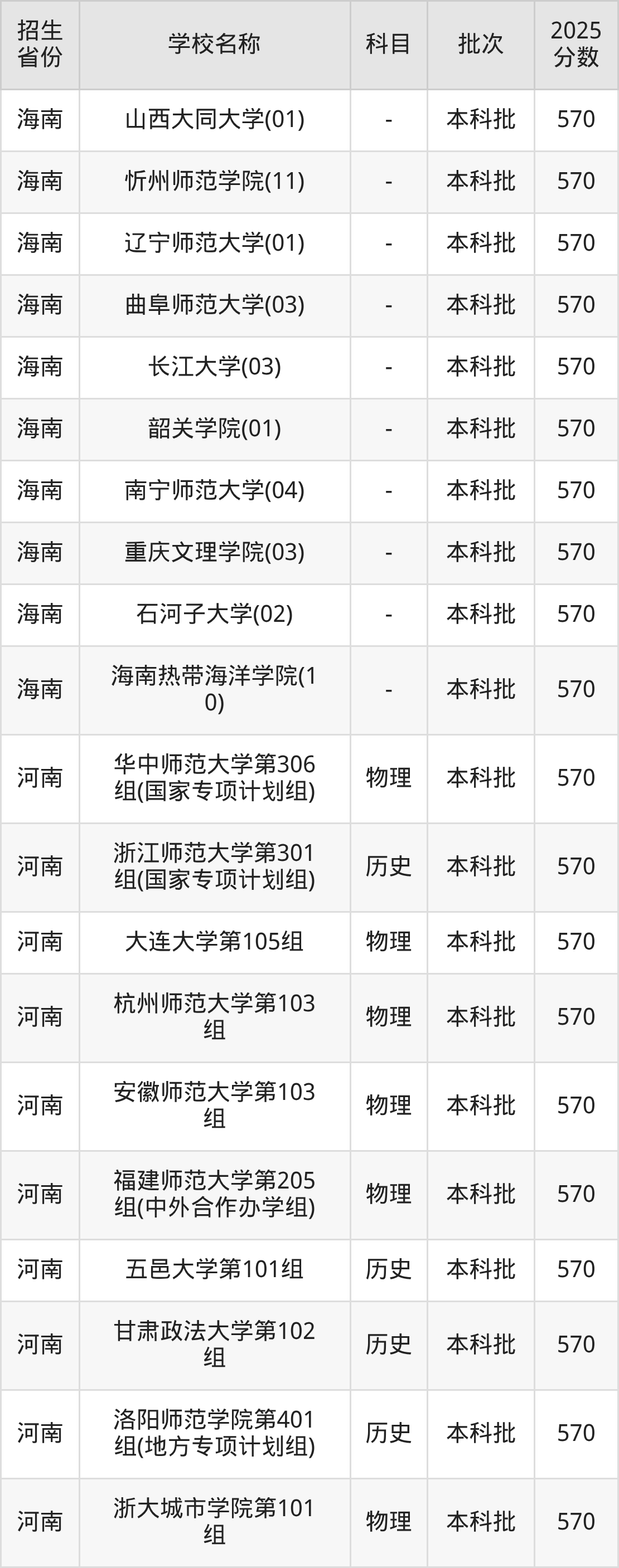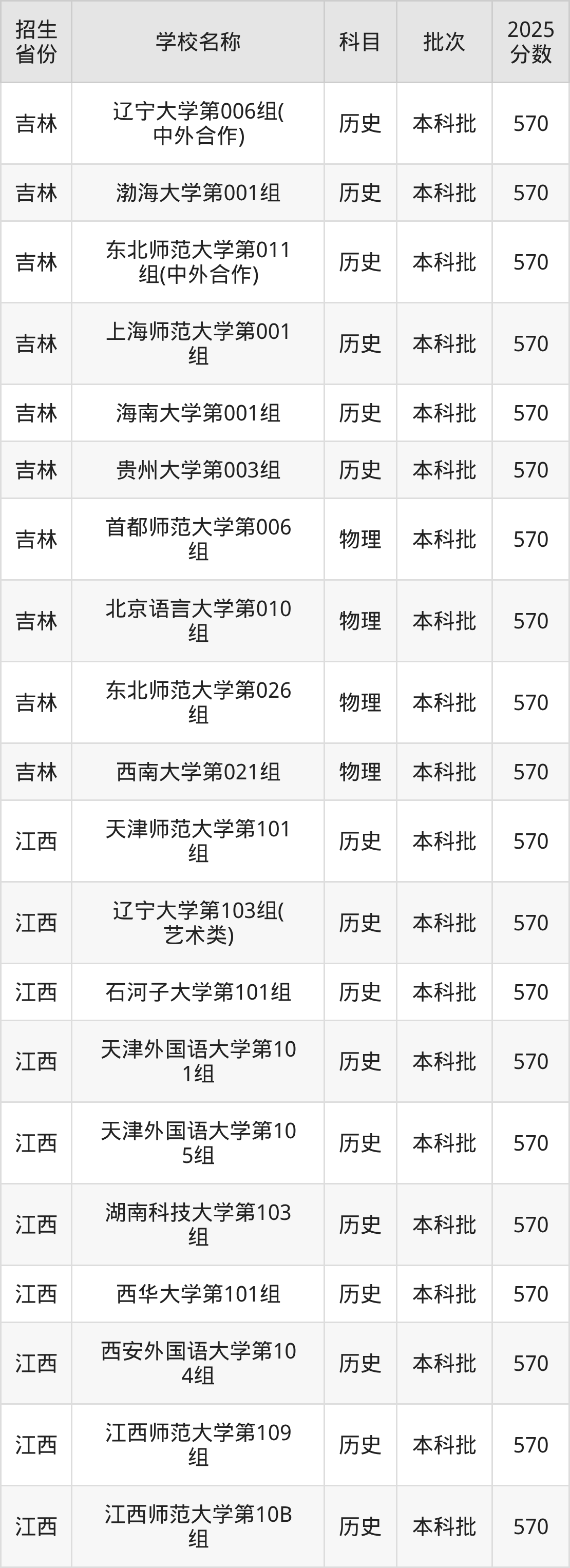 筛选全国各省2025年录取分数线为570分的文科大学如下:
