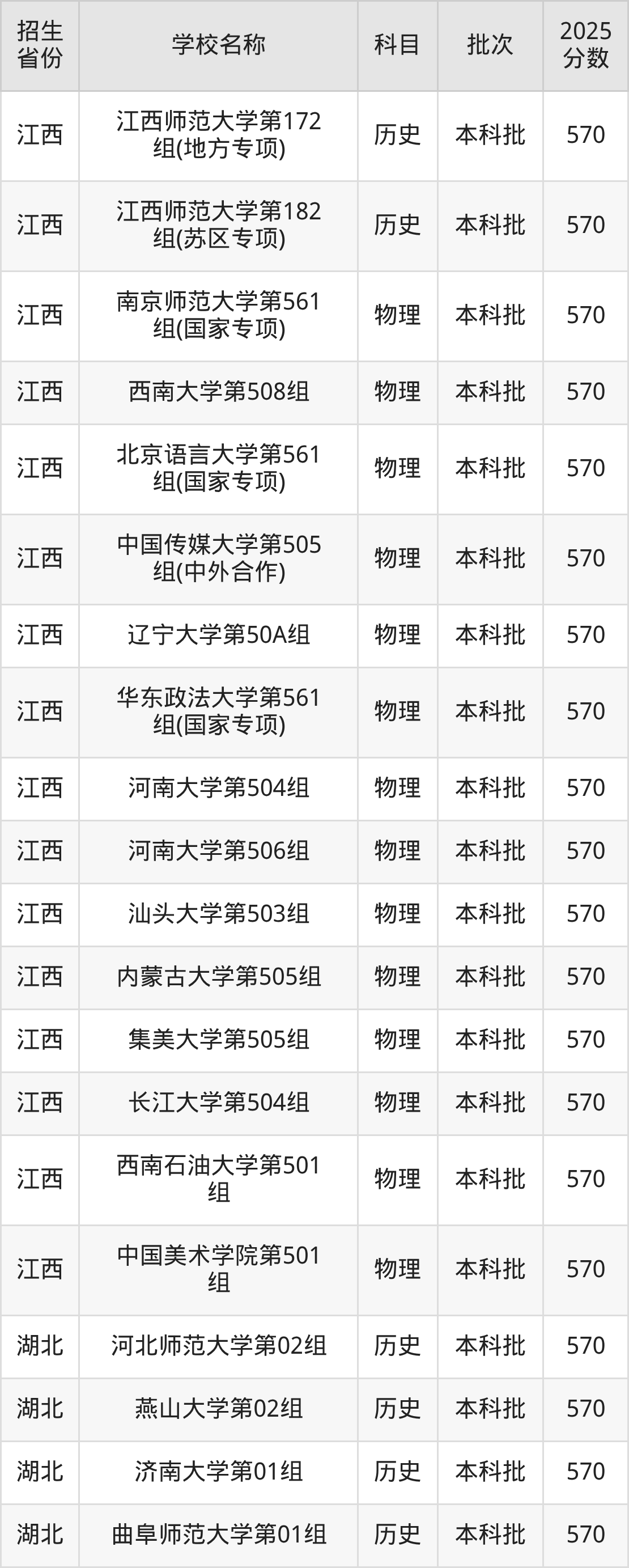 二、各省570分的文科大学名单