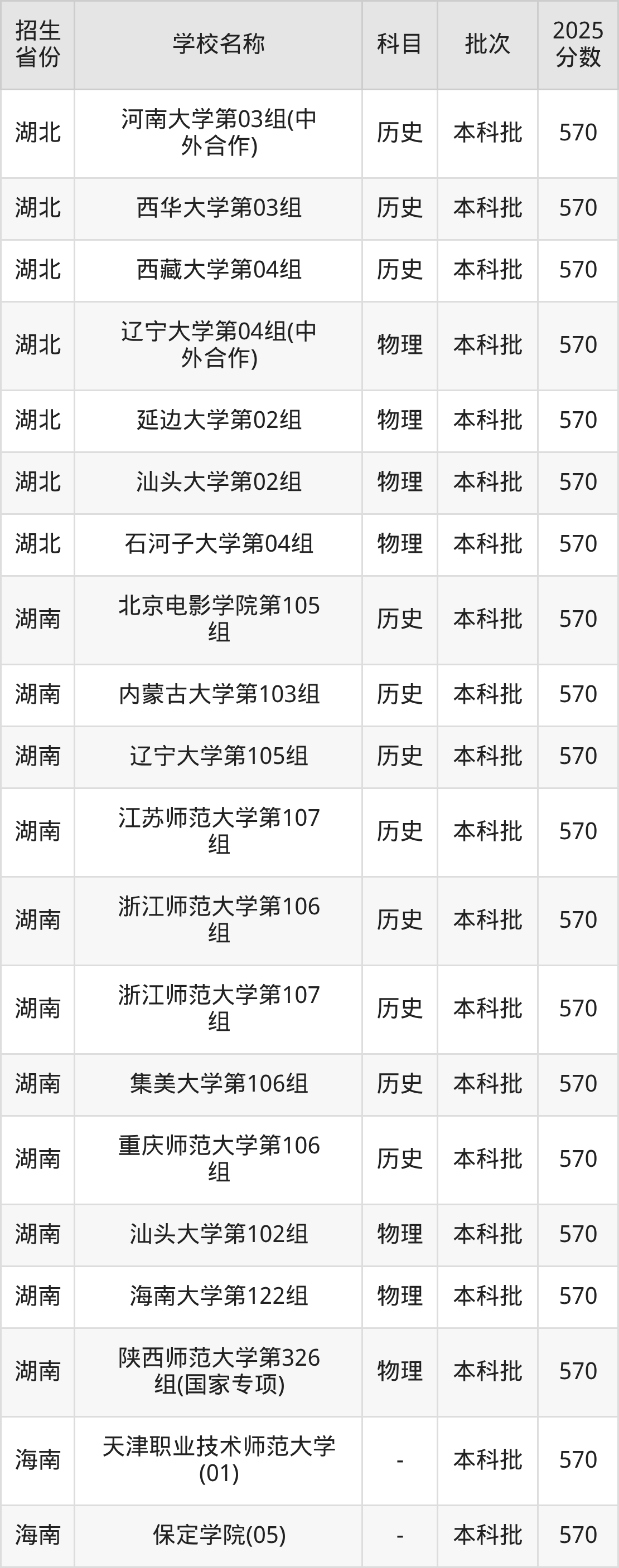 湖北省物理组分数线是570分的文科大学有:辽宁大学、延边大学、汕头大学、石河子大学。