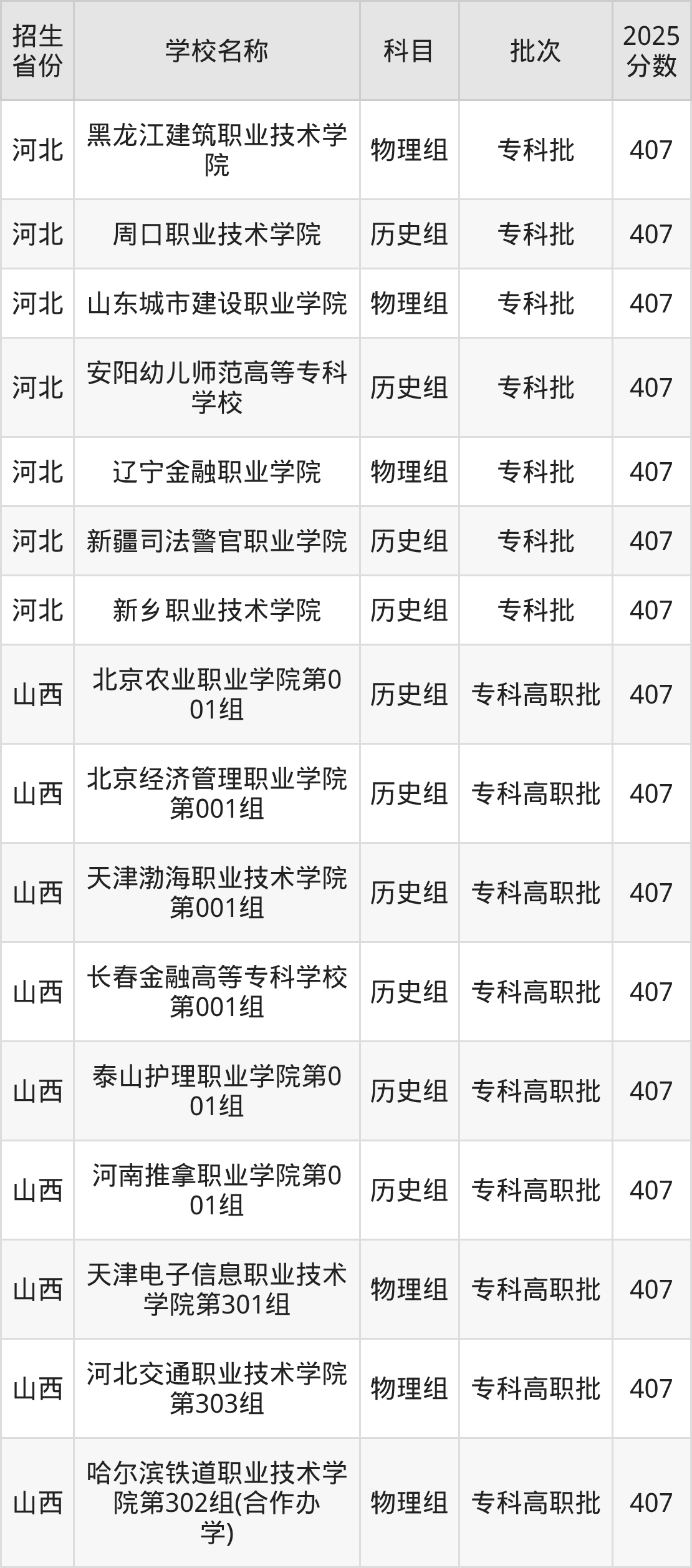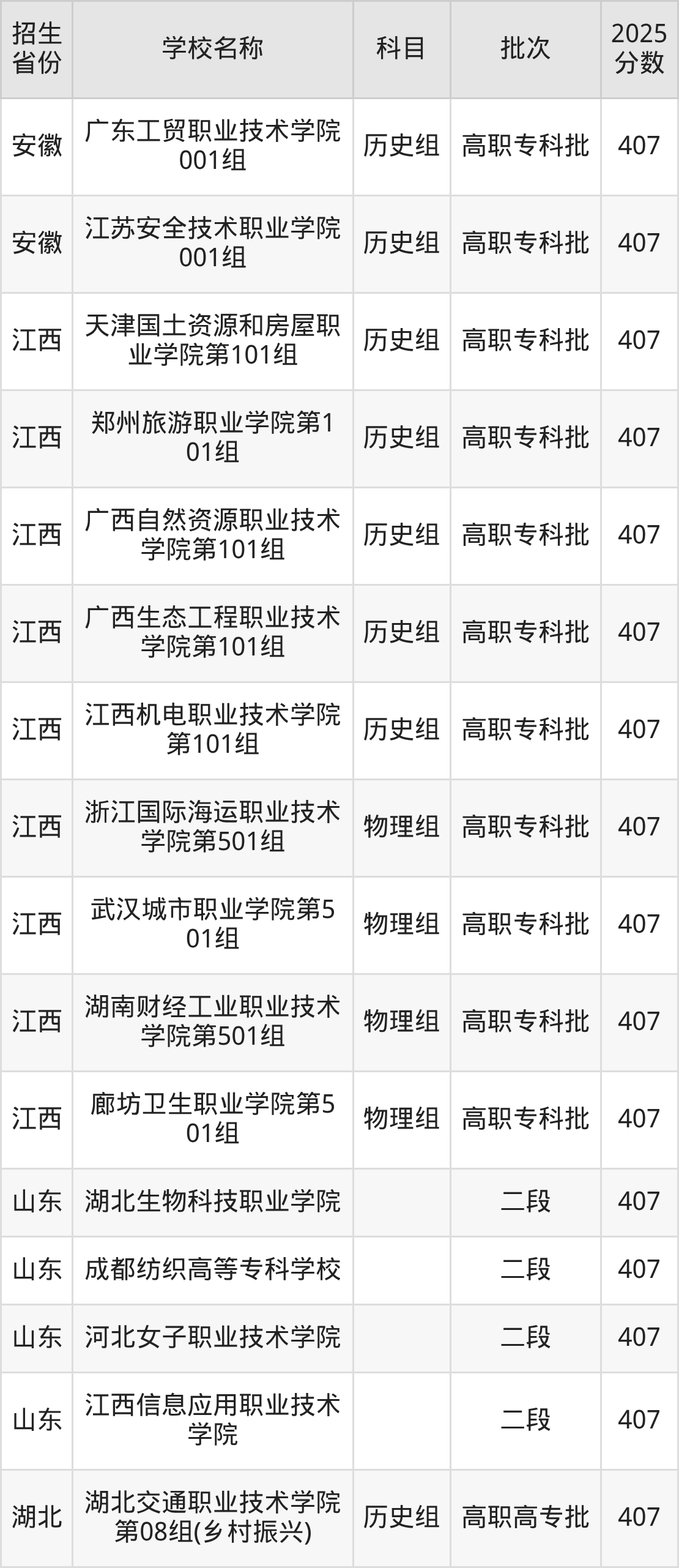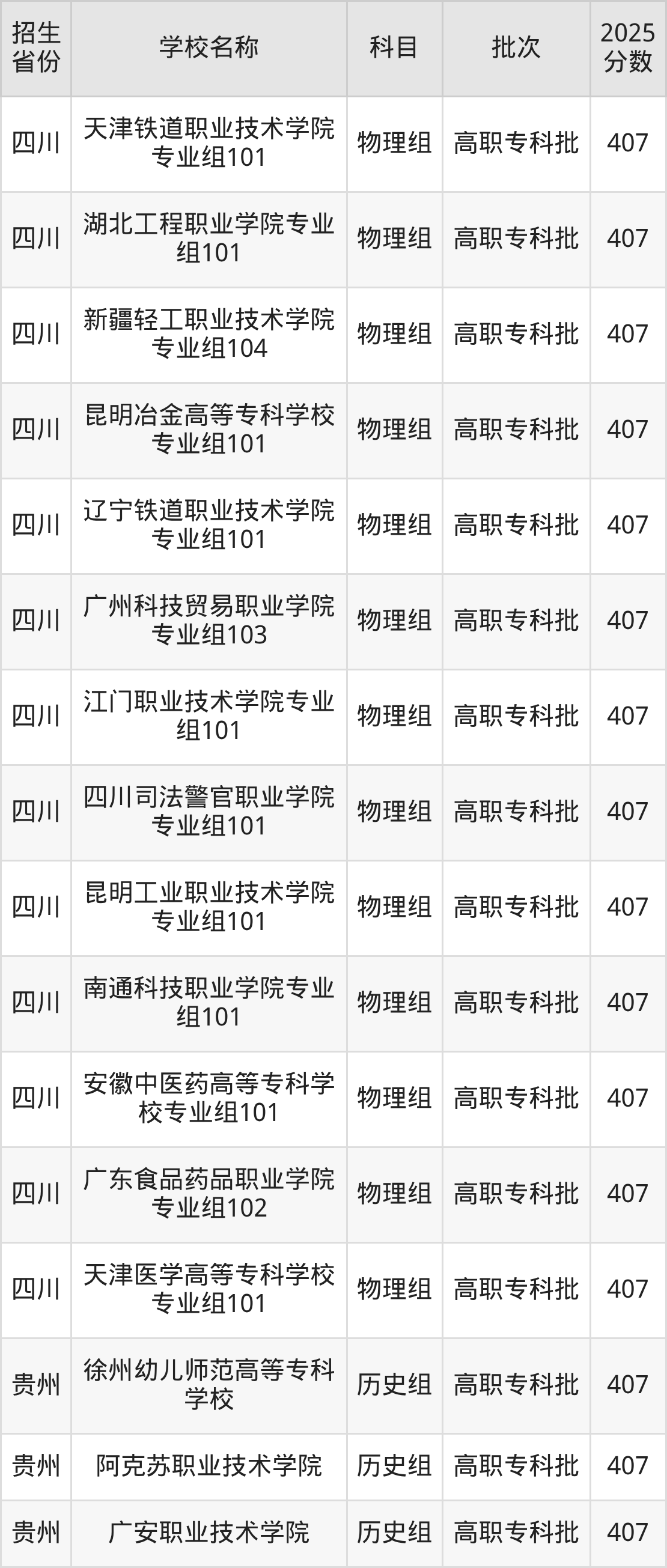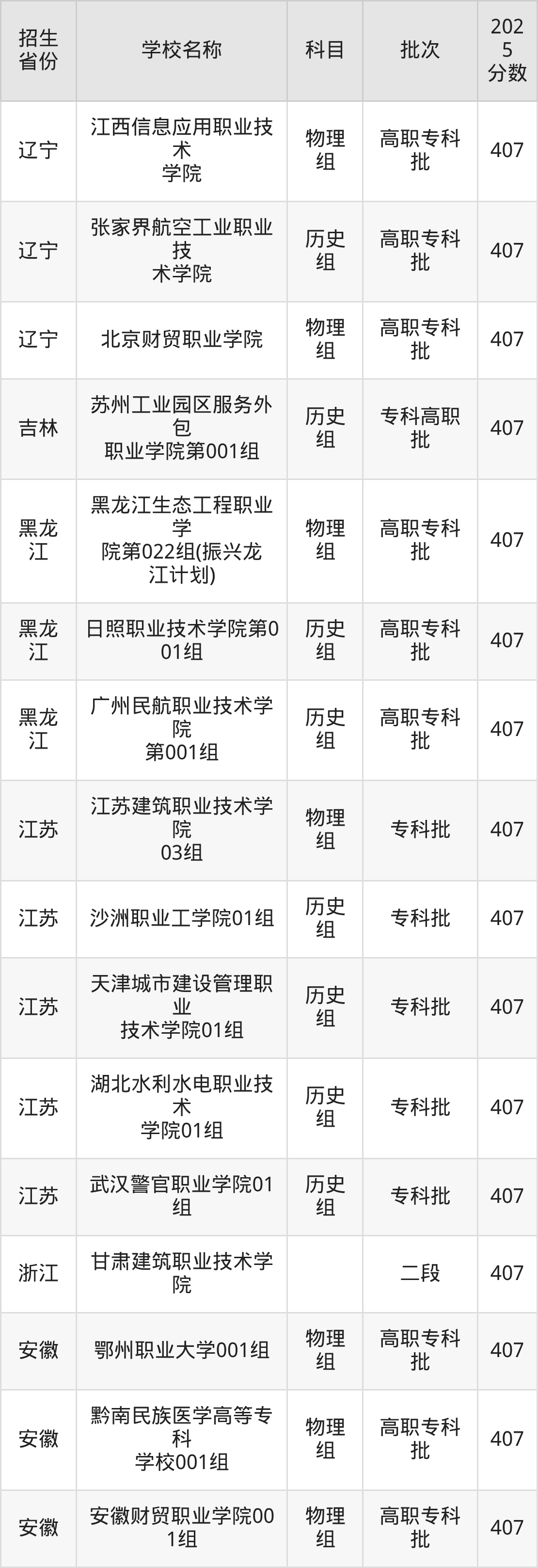 筛选全国各省2025年录取分数线为407分的公办专科大学如下: