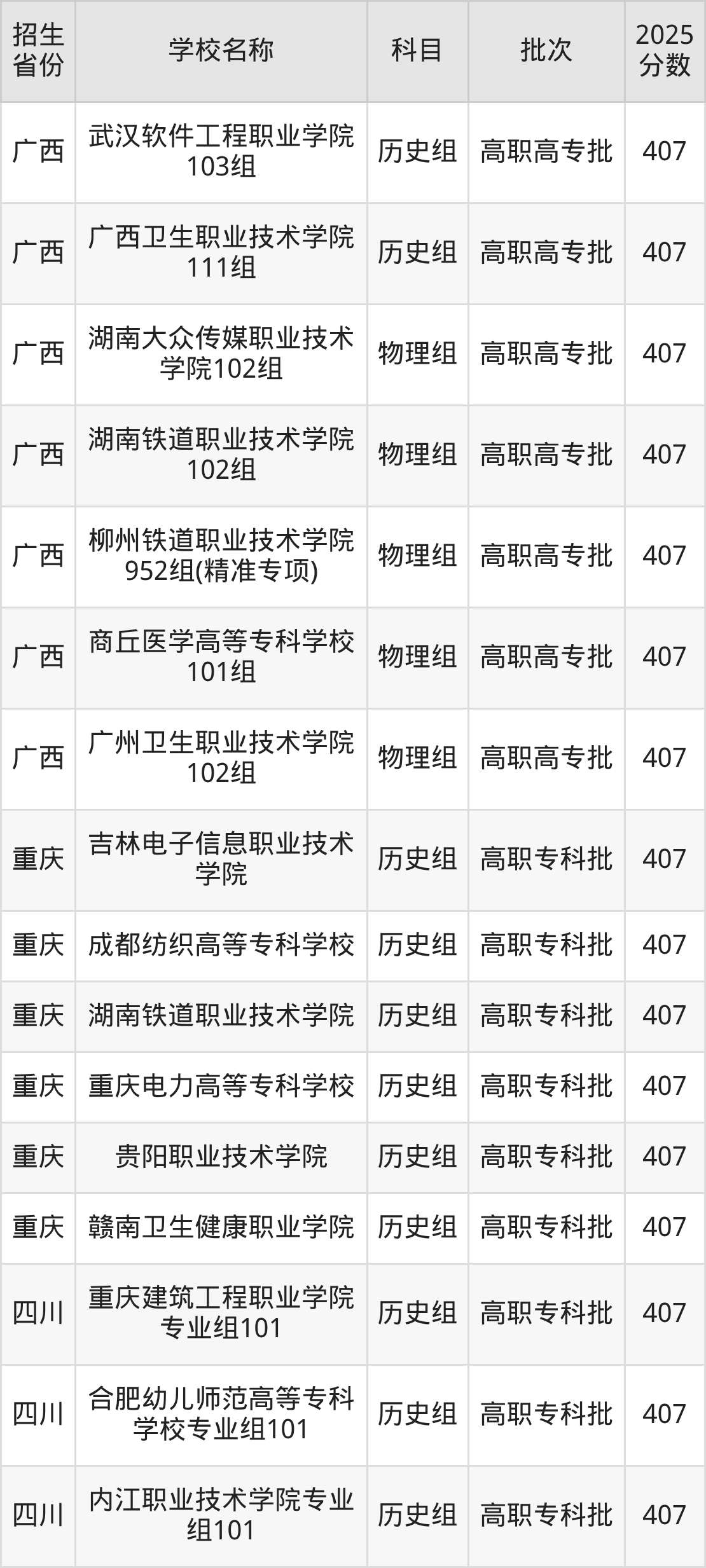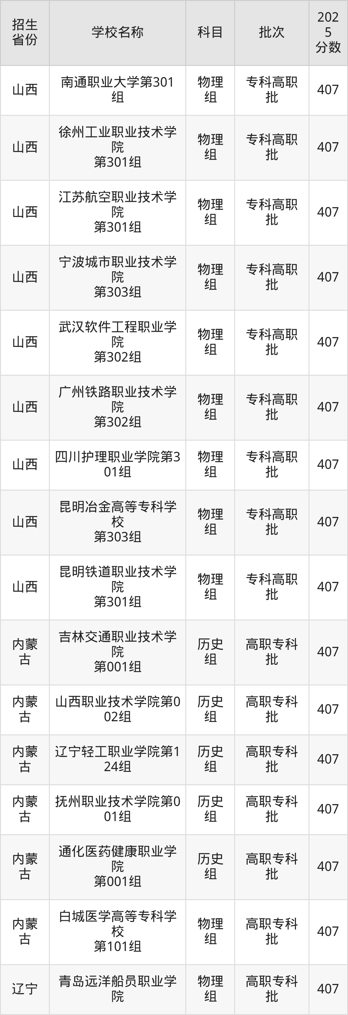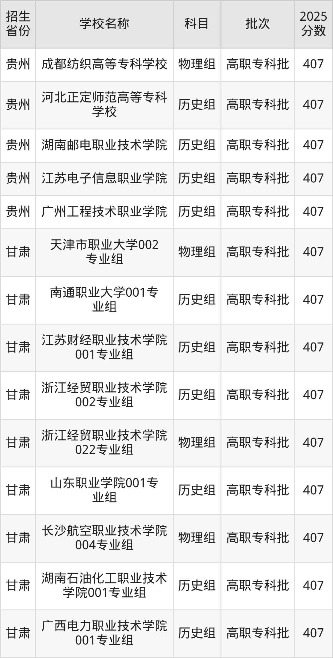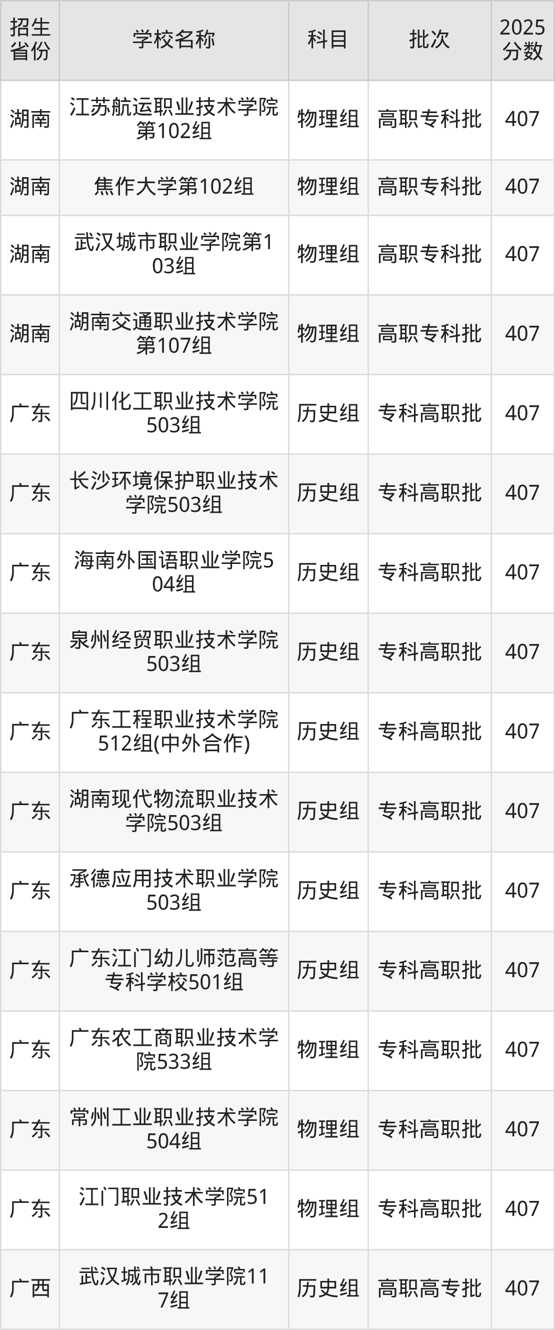 筛选全国各省2025年录取分数线为407分的公办专科大学如下: