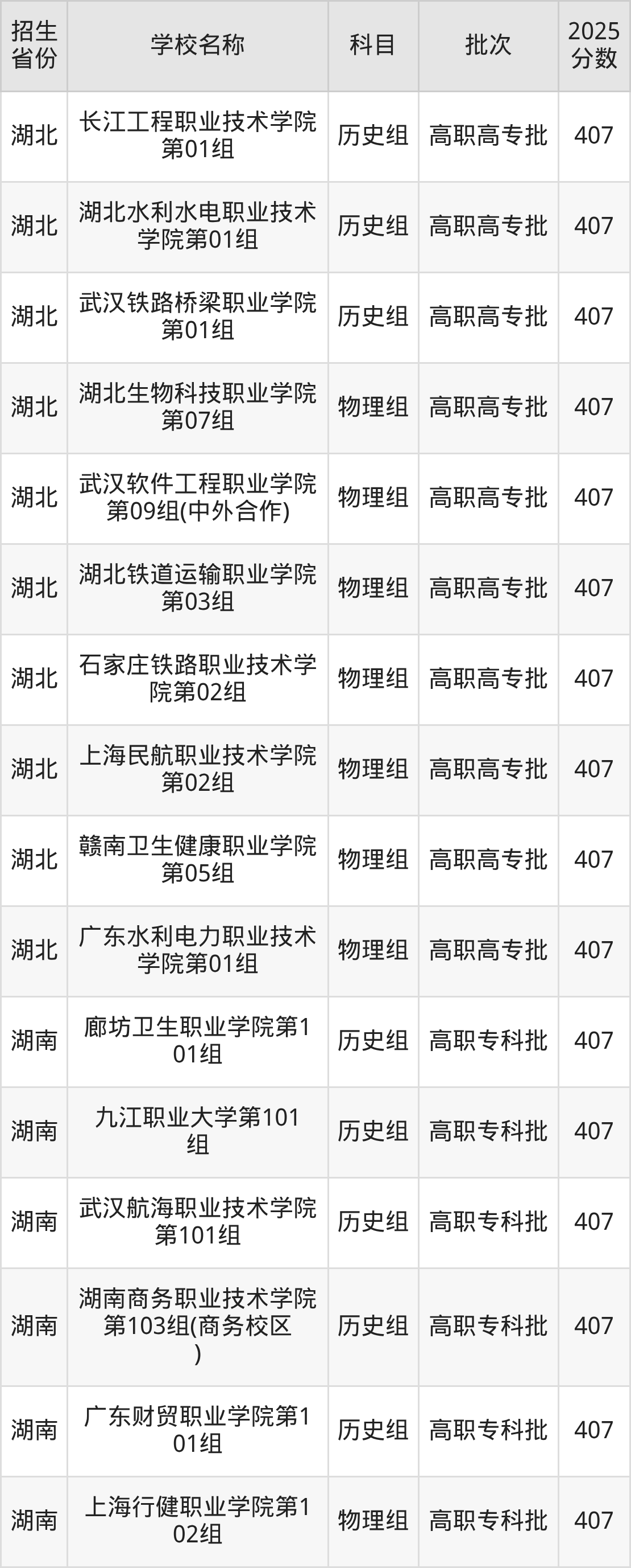 湖北省历史组分数线是407分的公办专科大学有:湖北交通职业技术学院、长江工程职业技术学院、湖北水利水电职业技术学院、武汉铁路桥梁职业学院。
