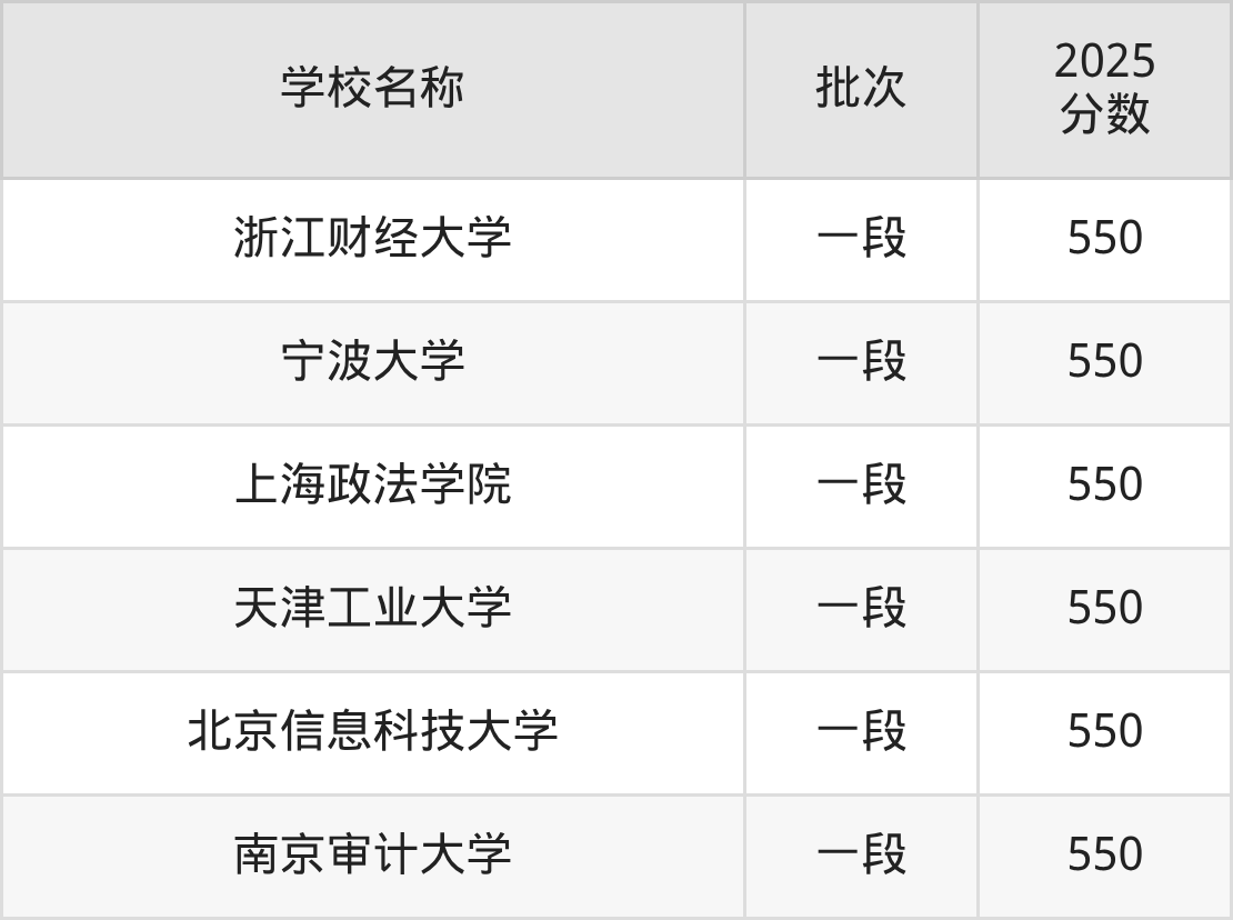 山东高考录取分数线在550分左右的公办大学一共有6所。分别是浙江财经大学(550分)、宁波大学(550分)、上海政法学院(550分)