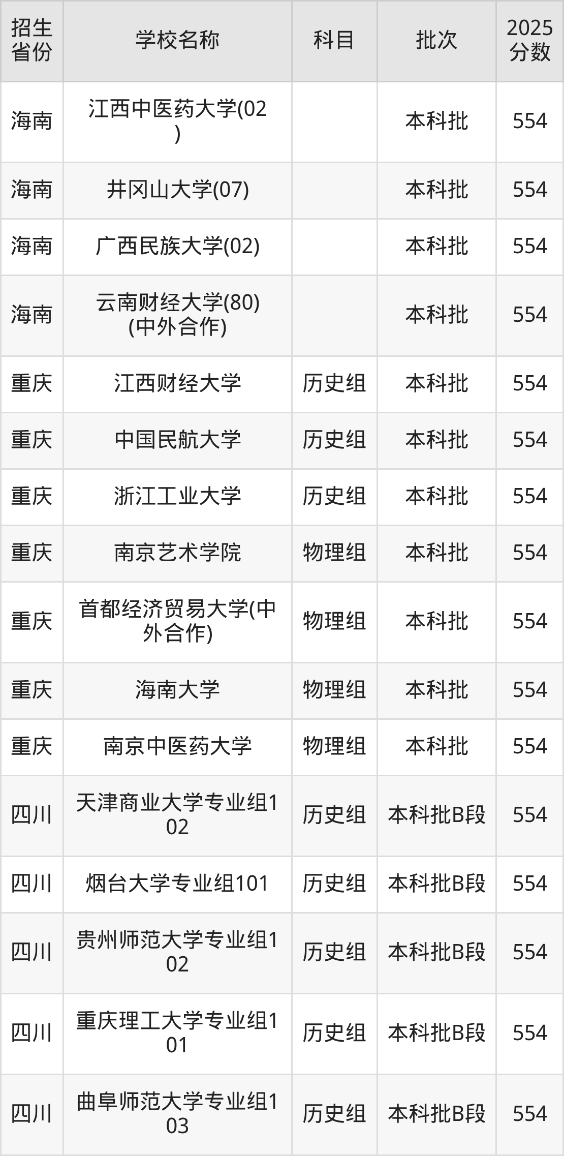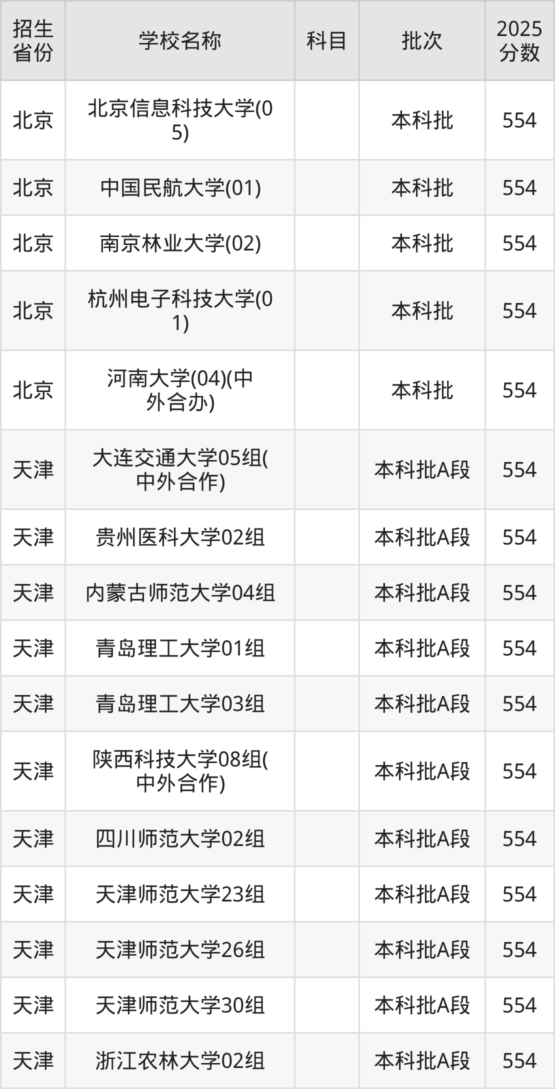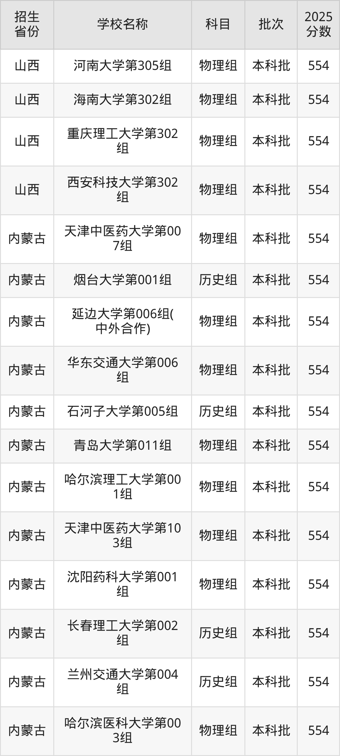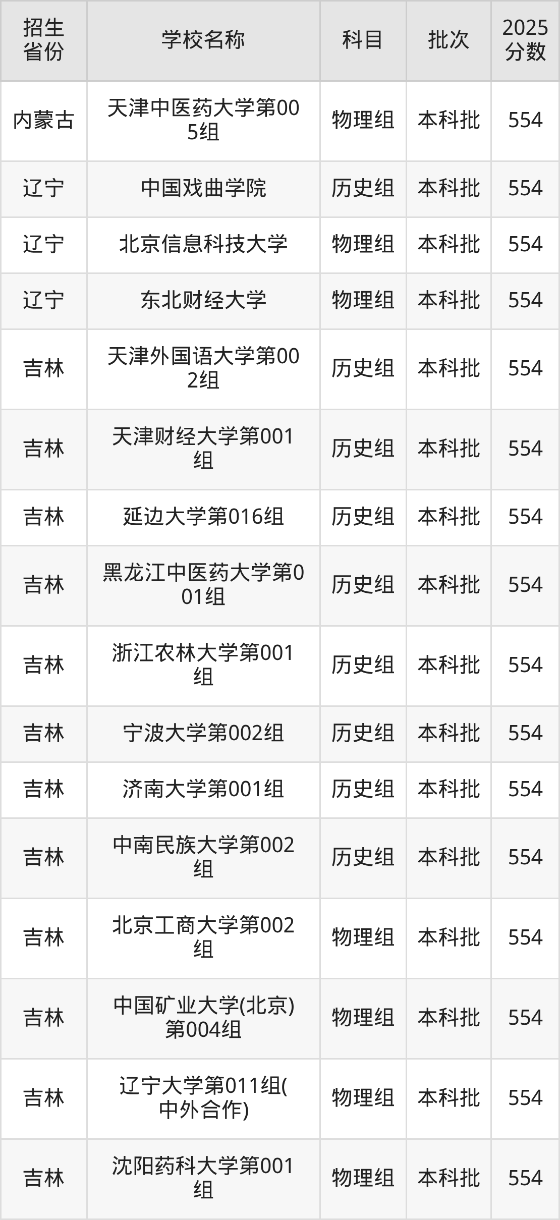 筛选全国各省2025年录取分数线为554分的重点大学如下: