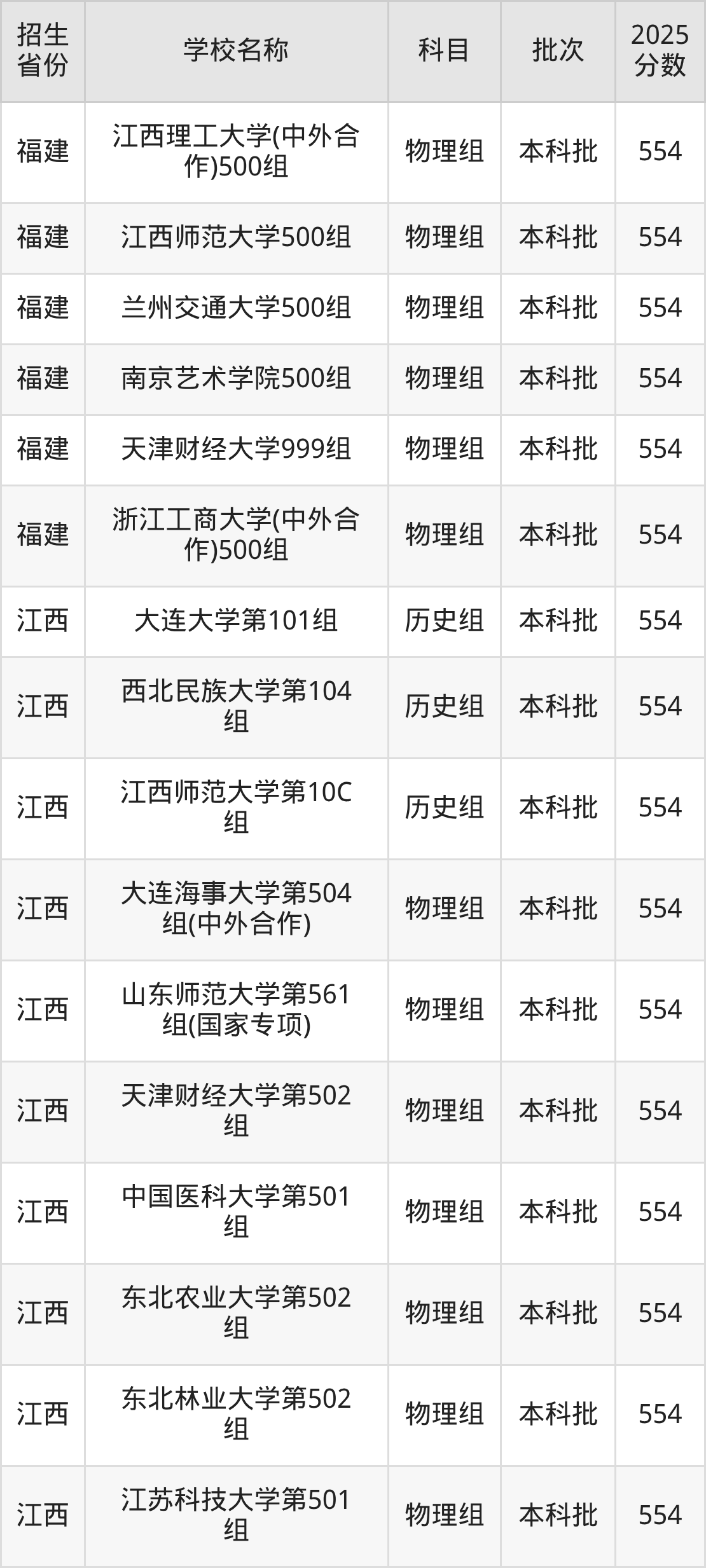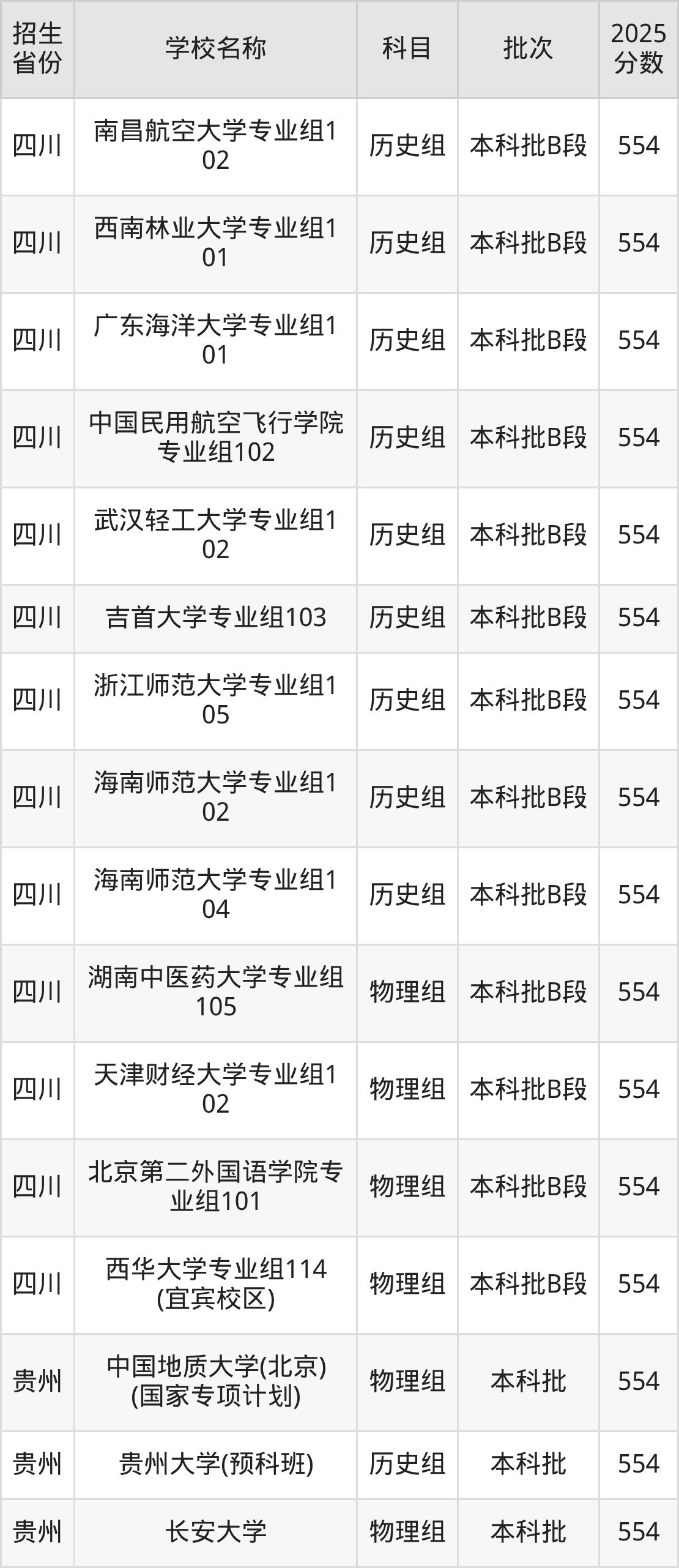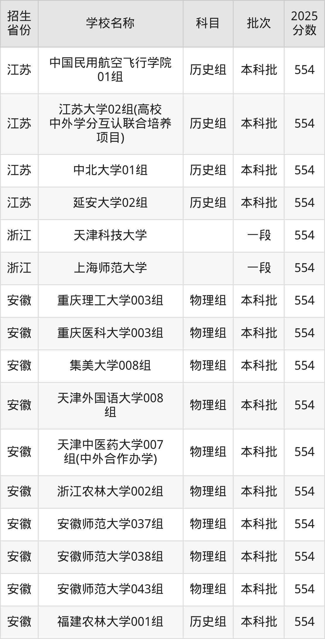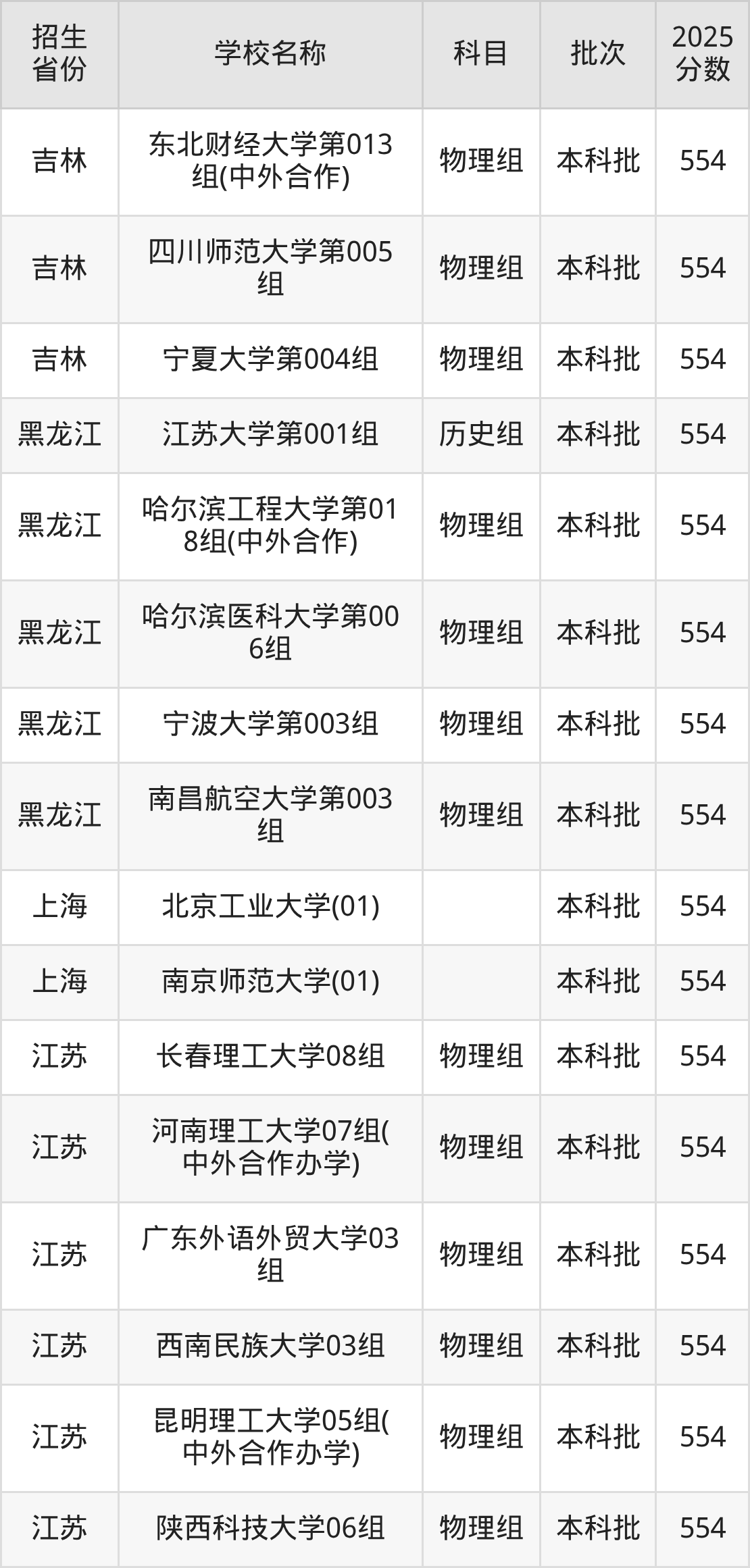 筛选全国各省2025年录取分数线为554分的重点大学如下: