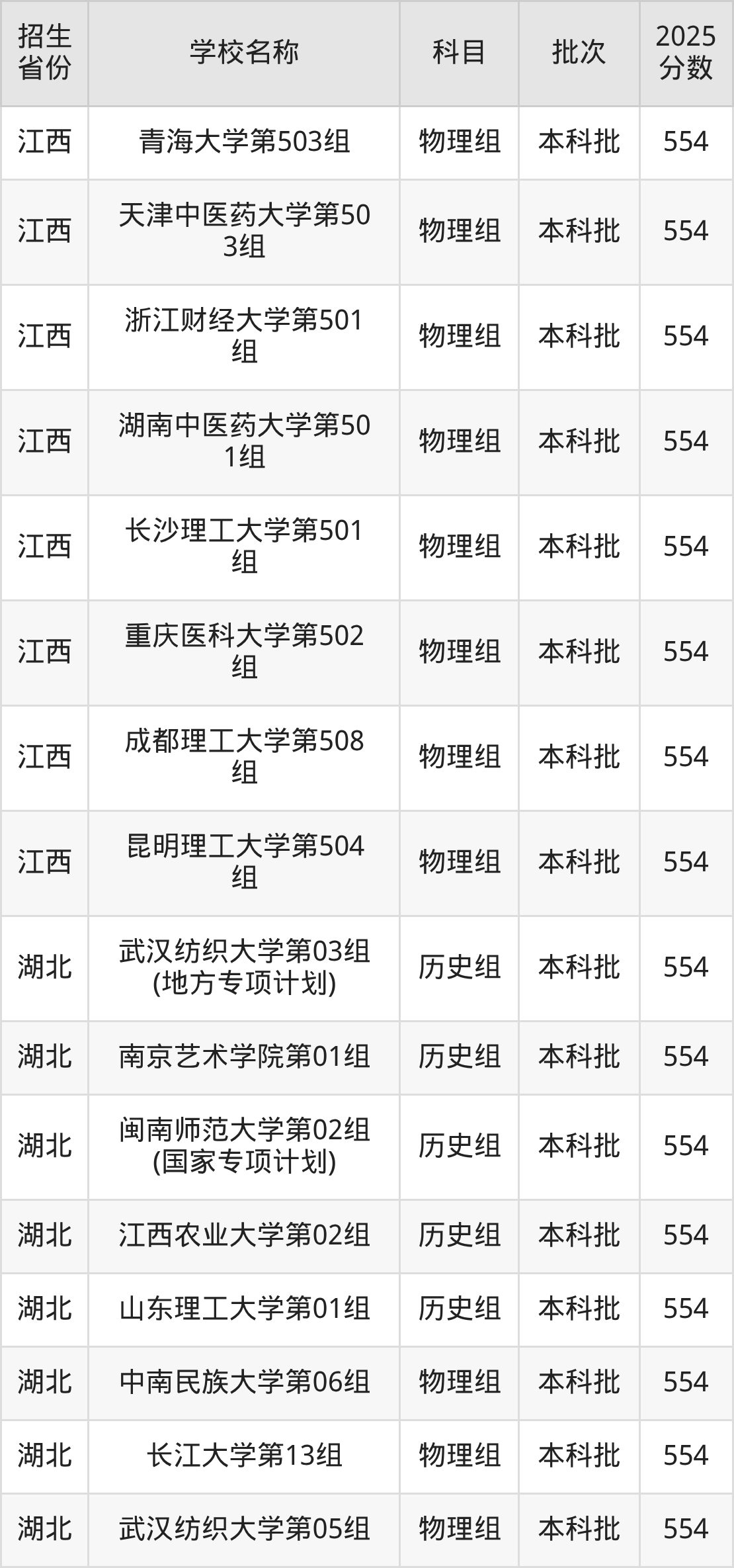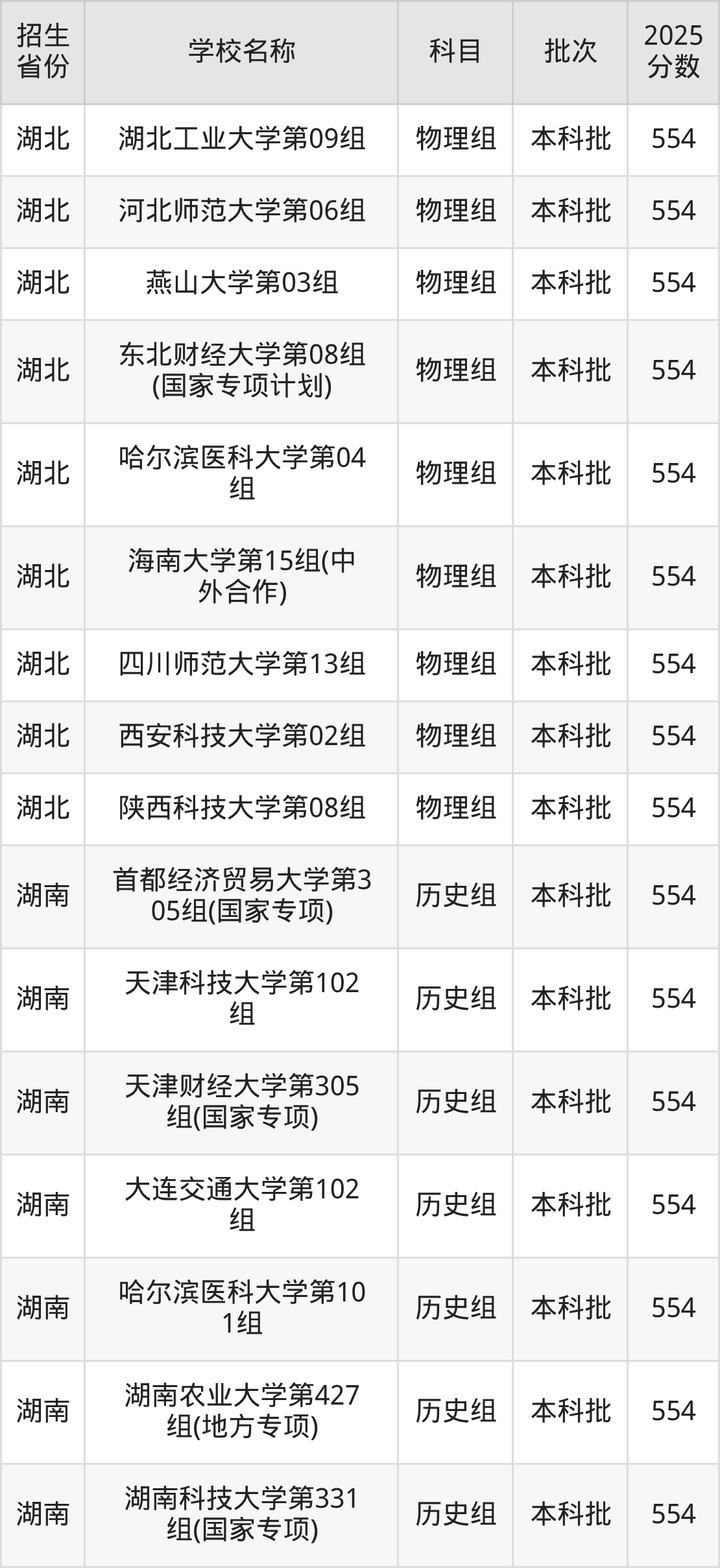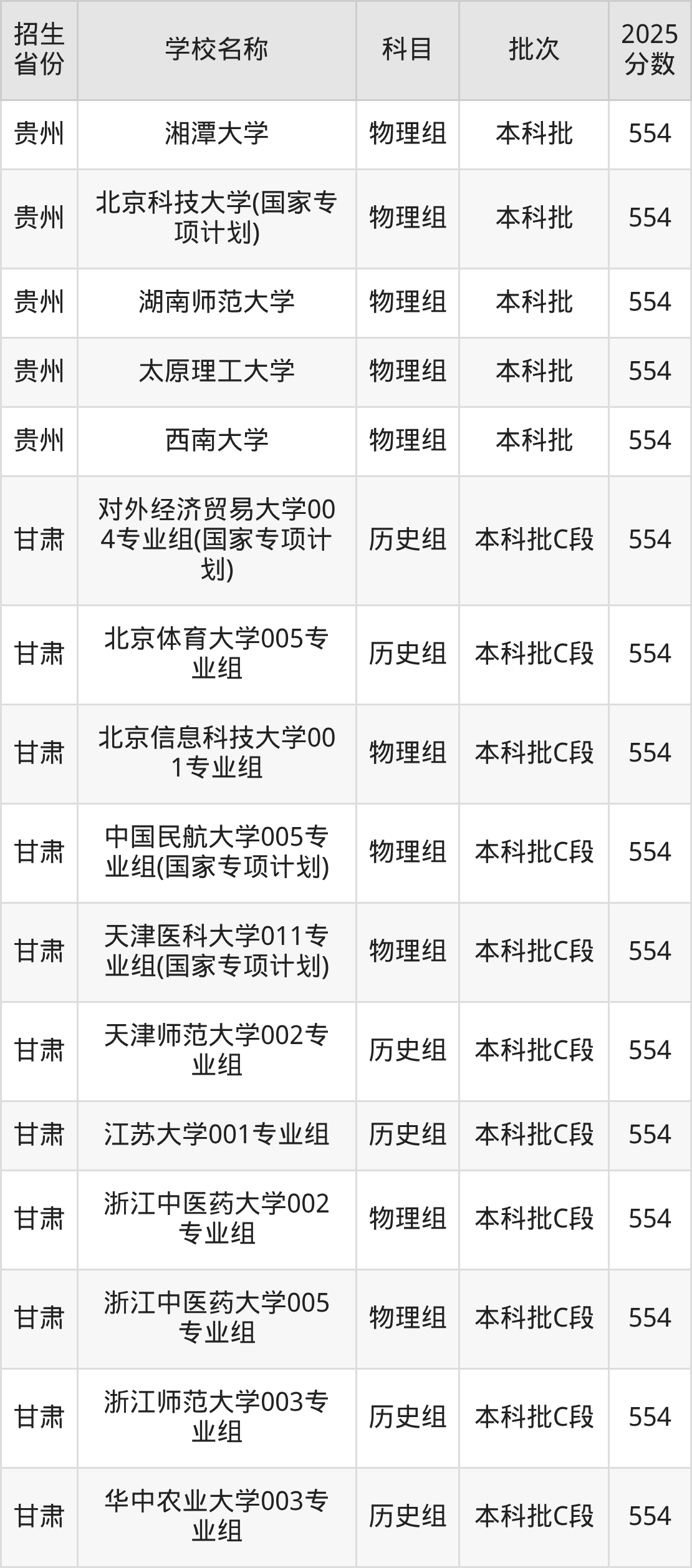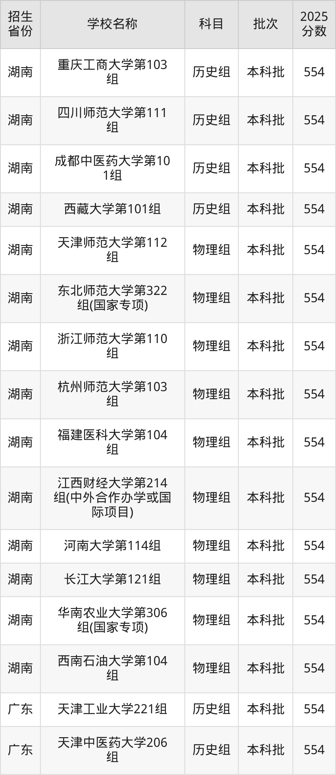筛选全国各省2025年录取分数线为554分的重点大学如下: