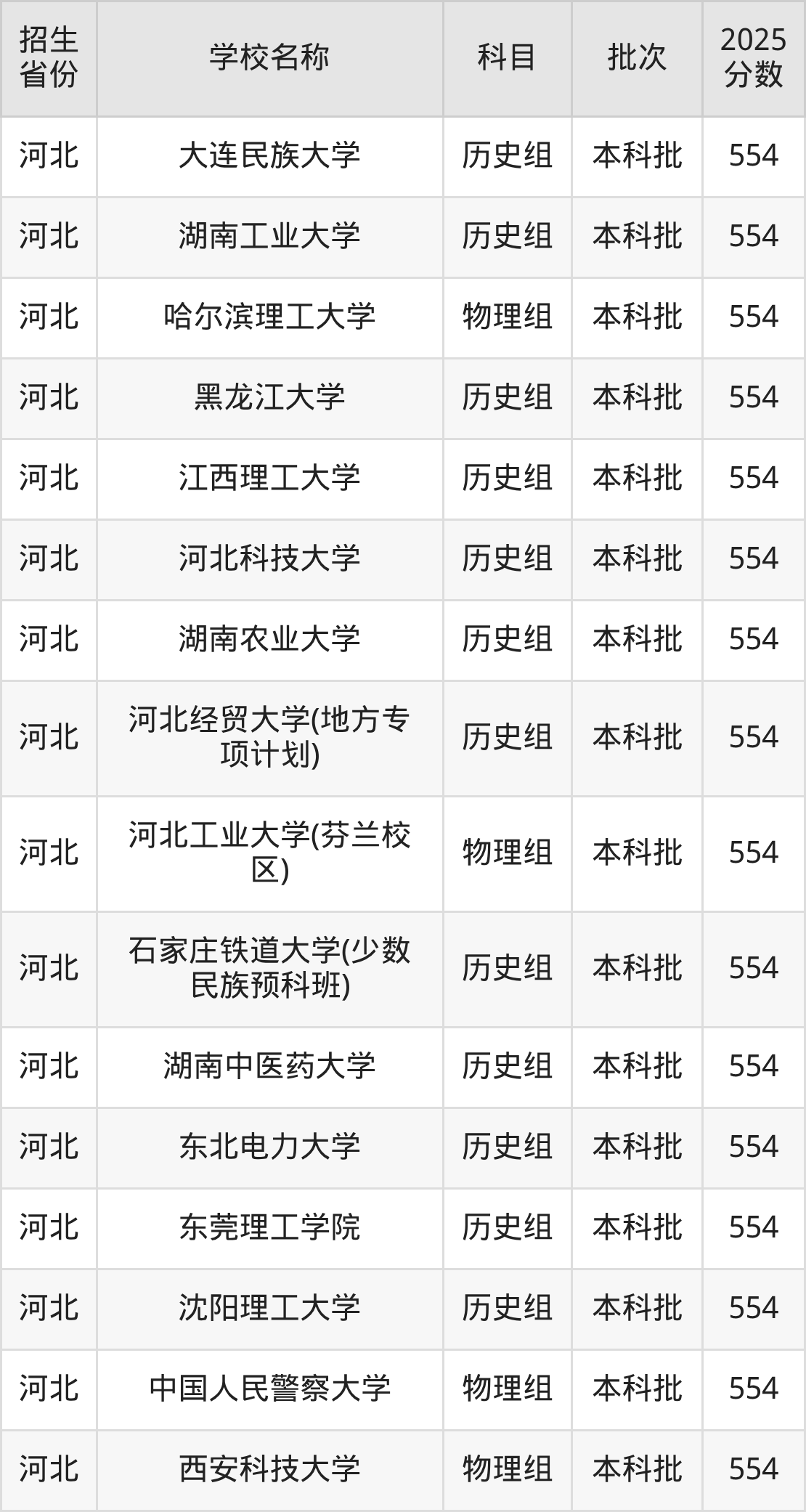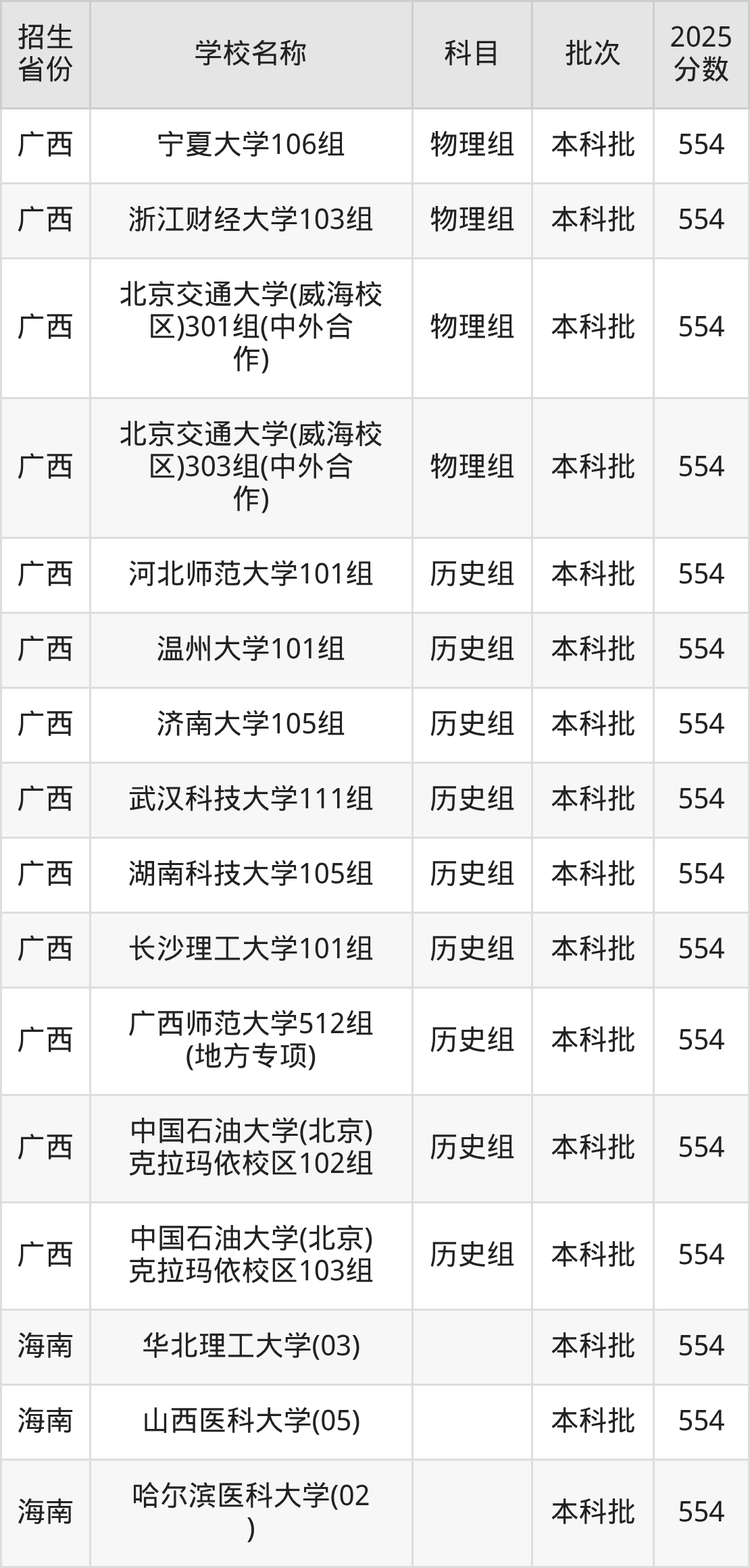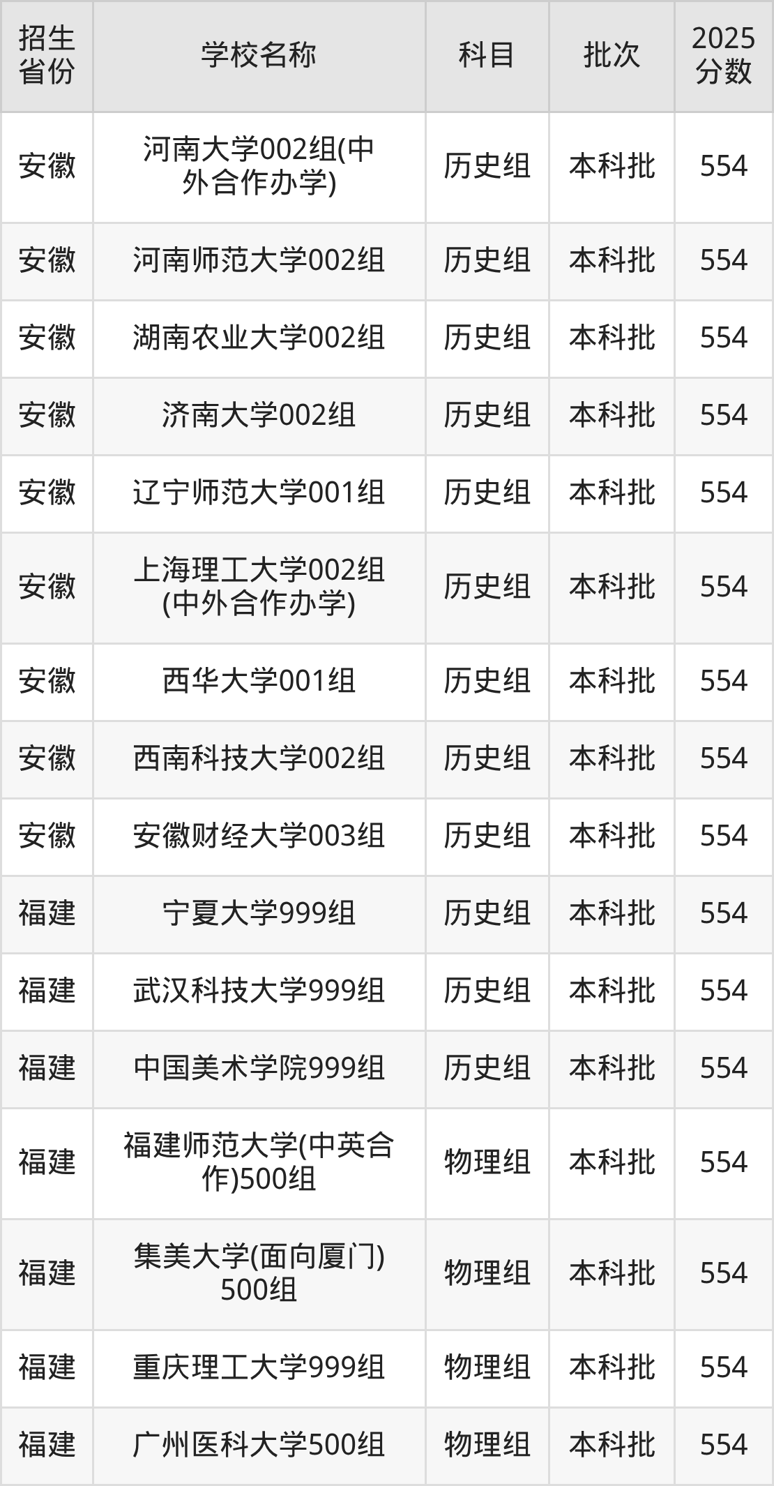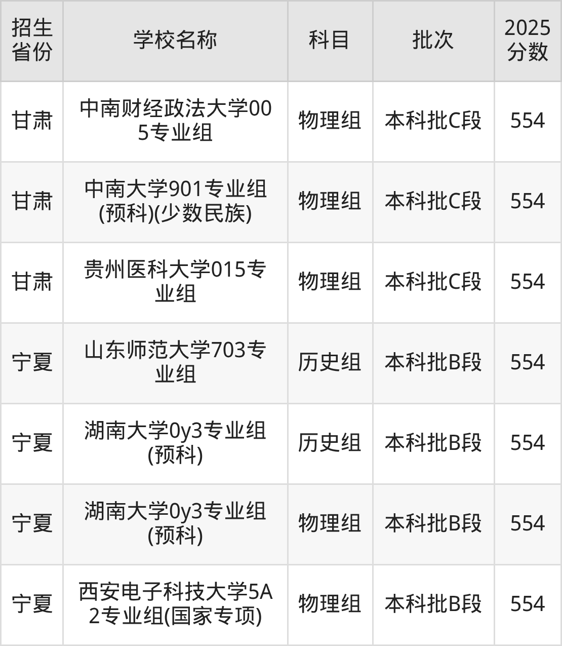 筛选全国各省2025年录取分数线为554分的重点大学如下:
