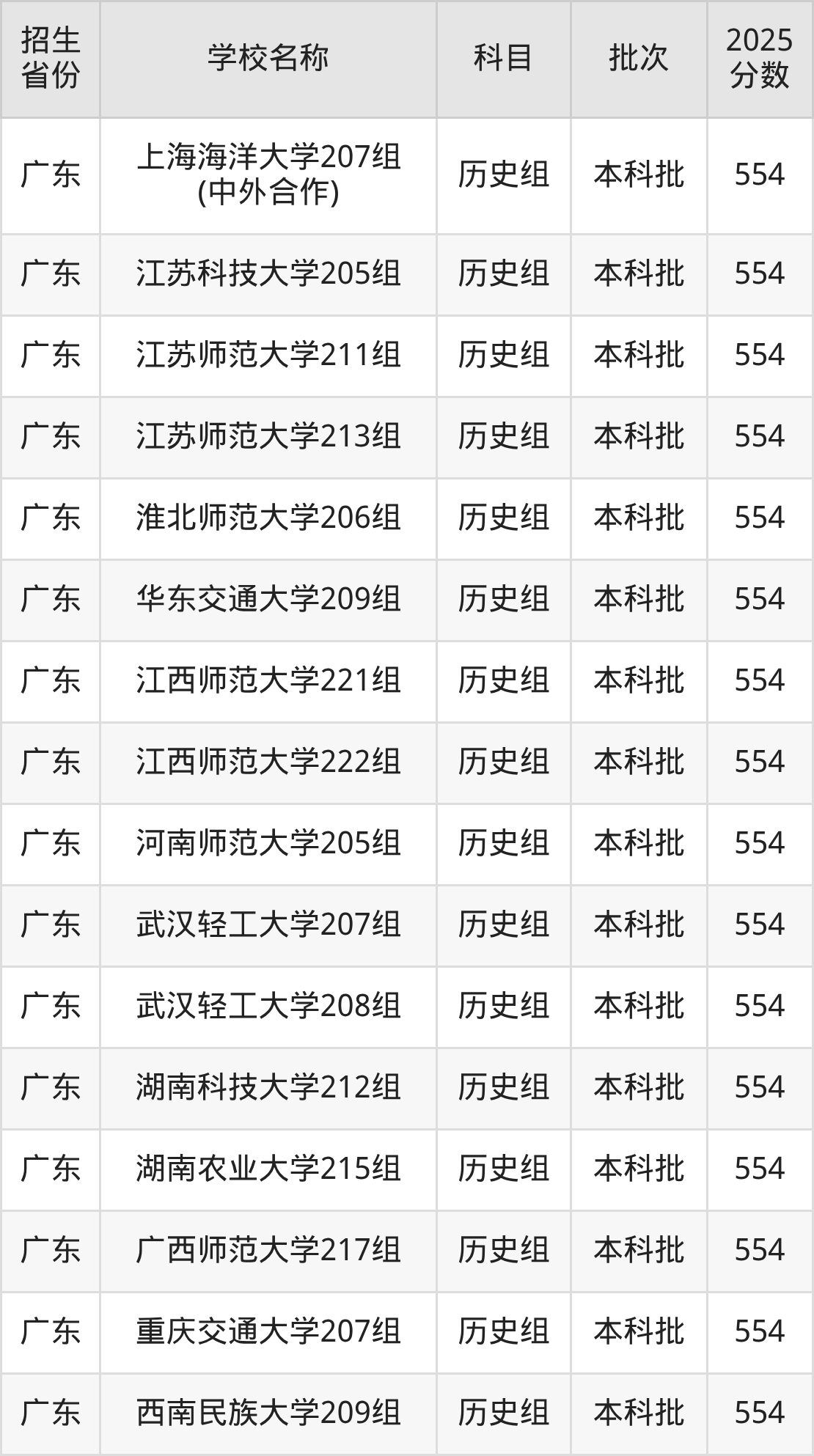 广东省历史组分数线是554分的重点大学有:天津工业大学、天津中医药大学、上海海洋大学、江苏科技大学、江苏师范大学、淮北师范大学、华东交通大学、江西师范大学、河南师范大学、武汉轻工大学。