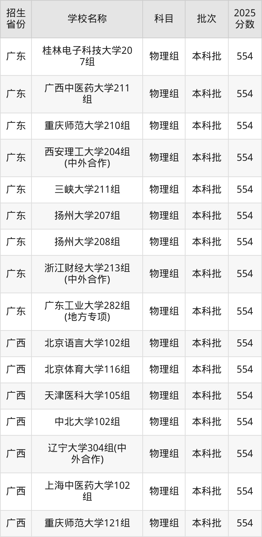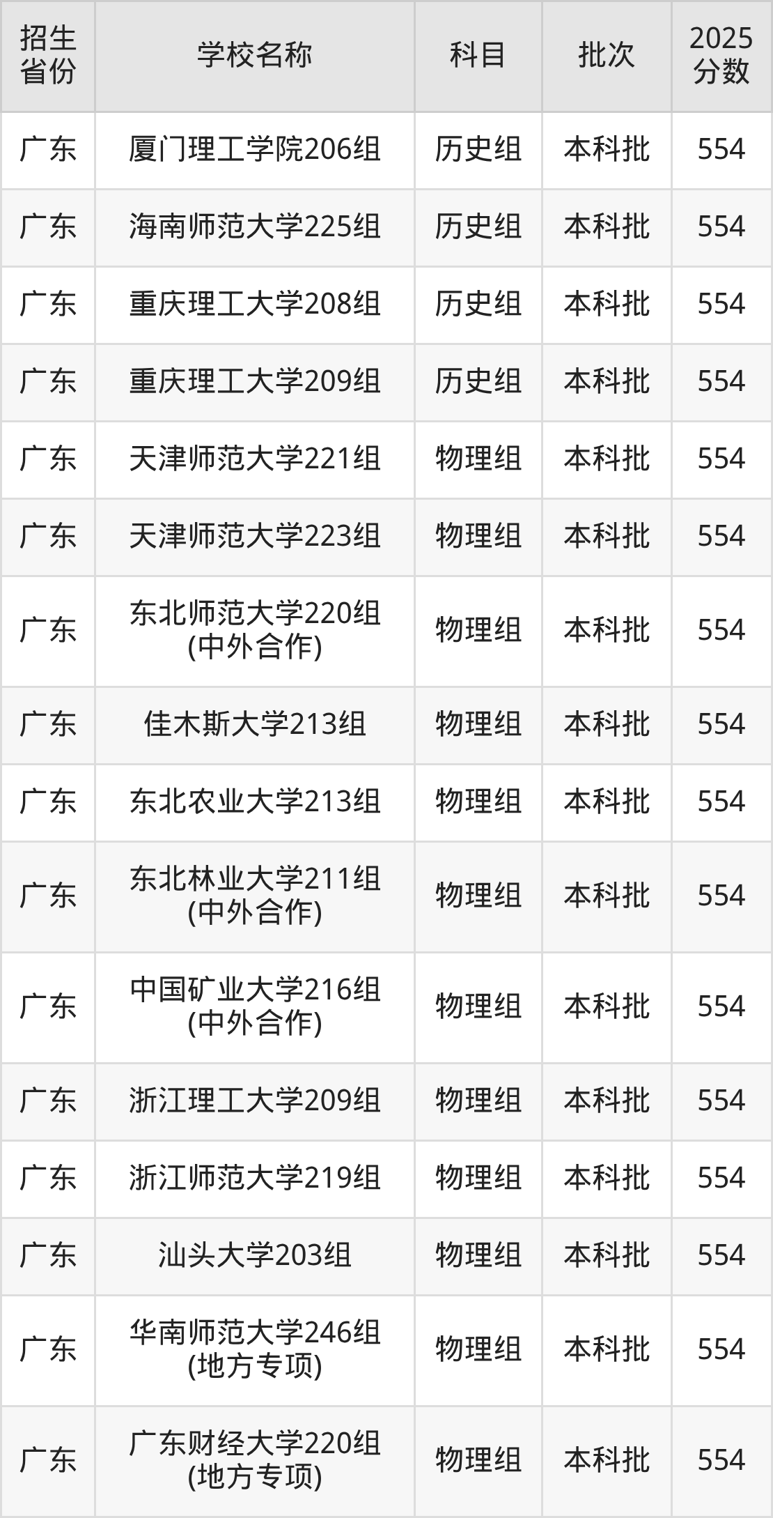 广东省物理组分数线是554分的重点大学有:天津师范大学、东北师范大学、佳木斯大学、东北农业大学、东北林业大学、中国矿业大学、浙江理工大学、浙江师范大学、汕头大学、华南师范大学。