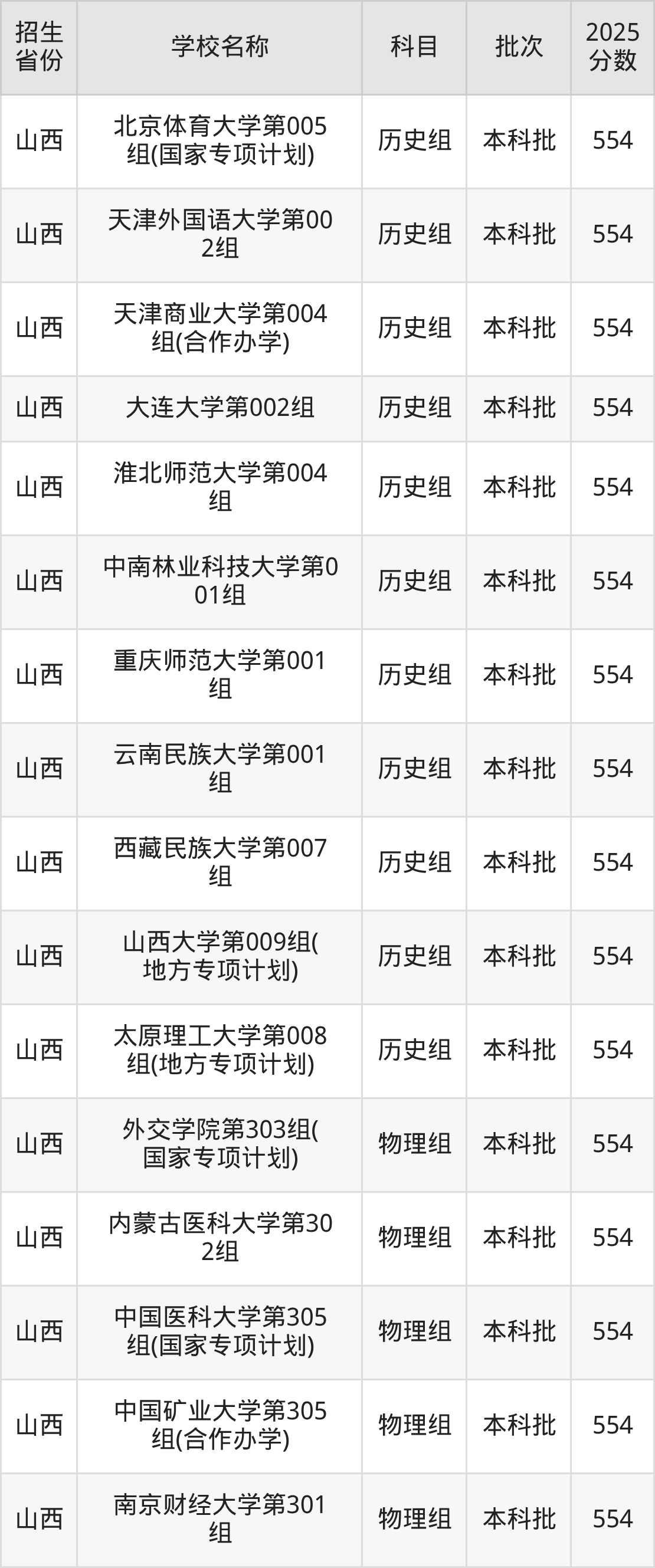 山西省历史组分数线是554分的重点大学有:北京体育大学、天津外国语大学、天津商业大学、大连大学、淮北师范大学、中南林业科技大学、重庆师范大学、云南民族大学、西藏民族大学、山西大学。