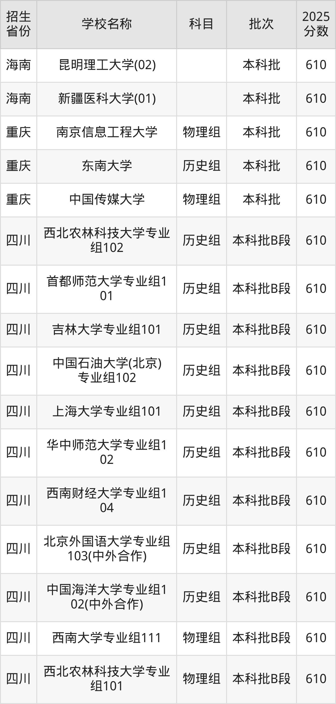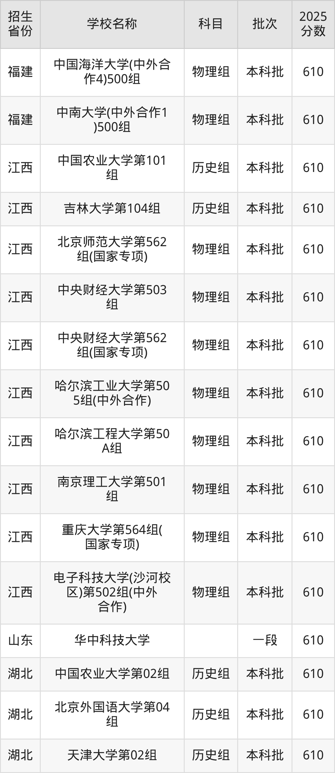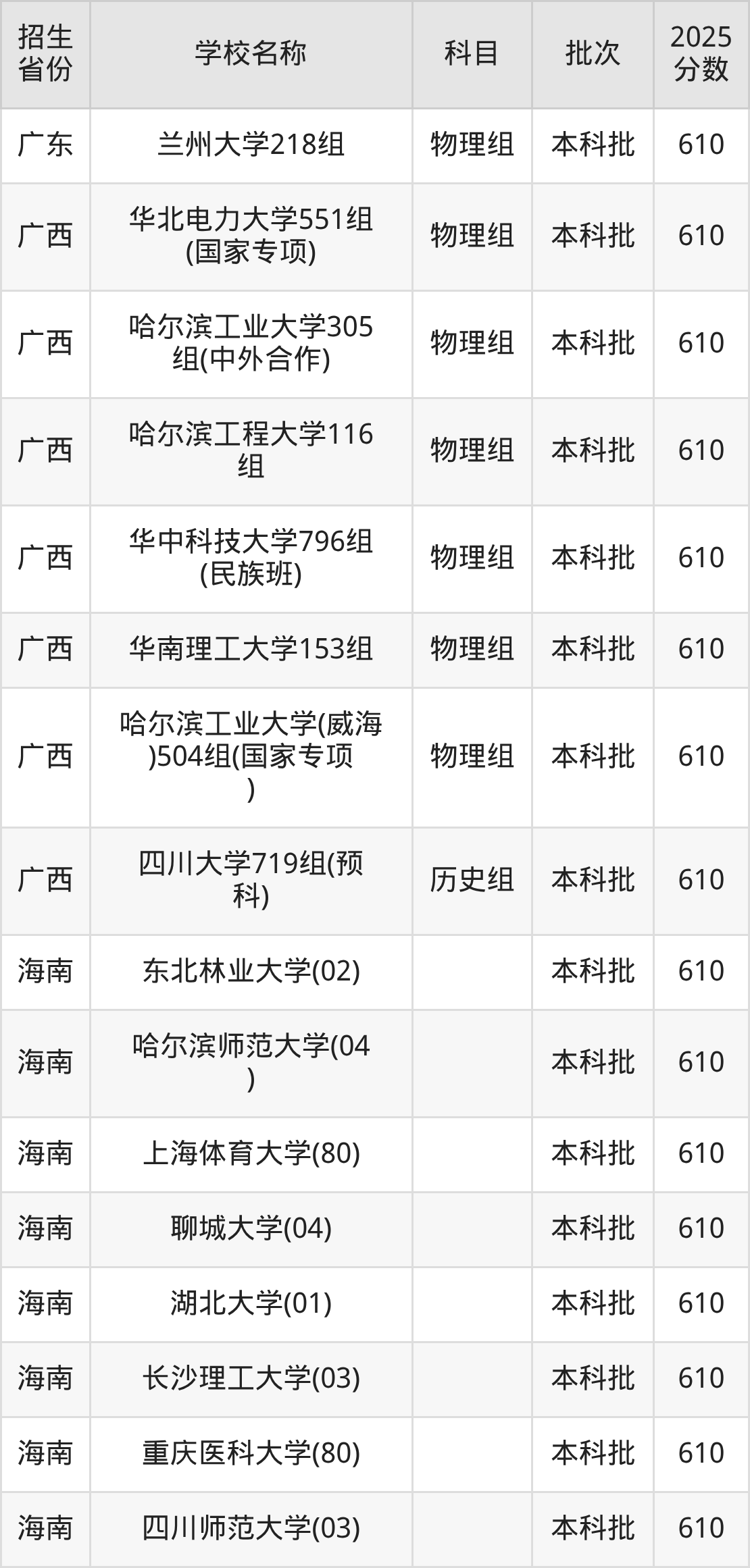 筛选全国各省2025年录取分数线为610分的一本大学如下: