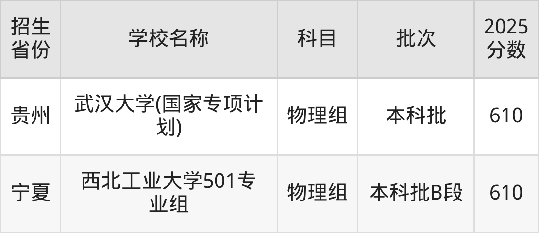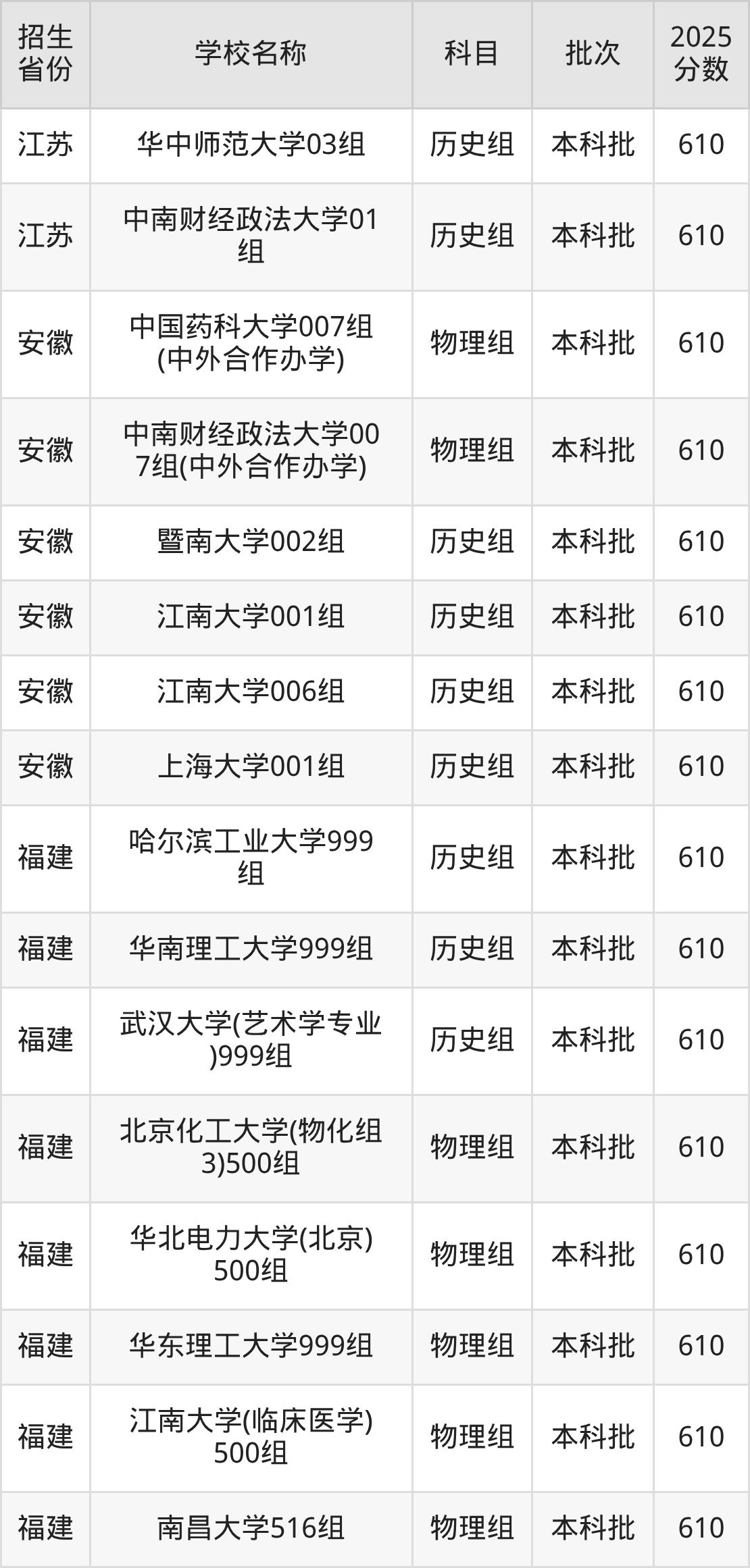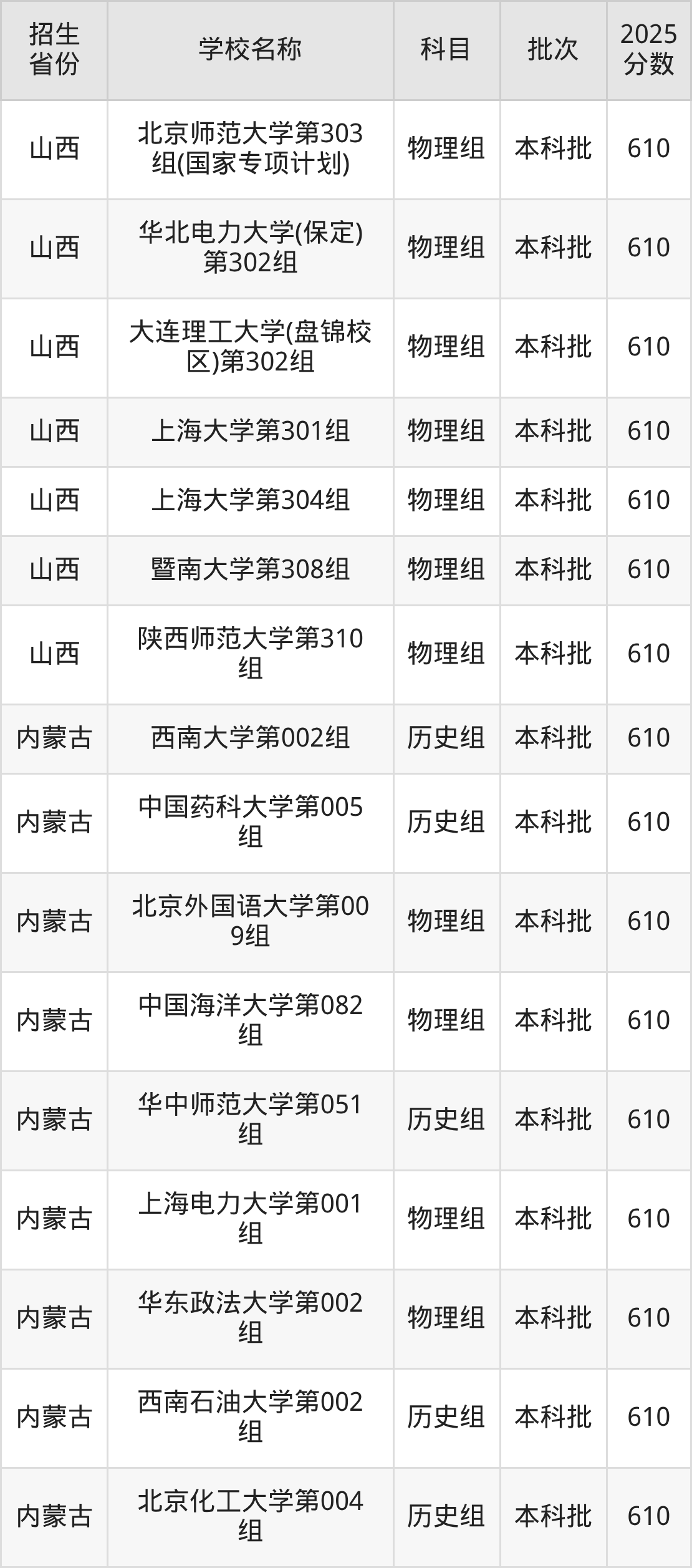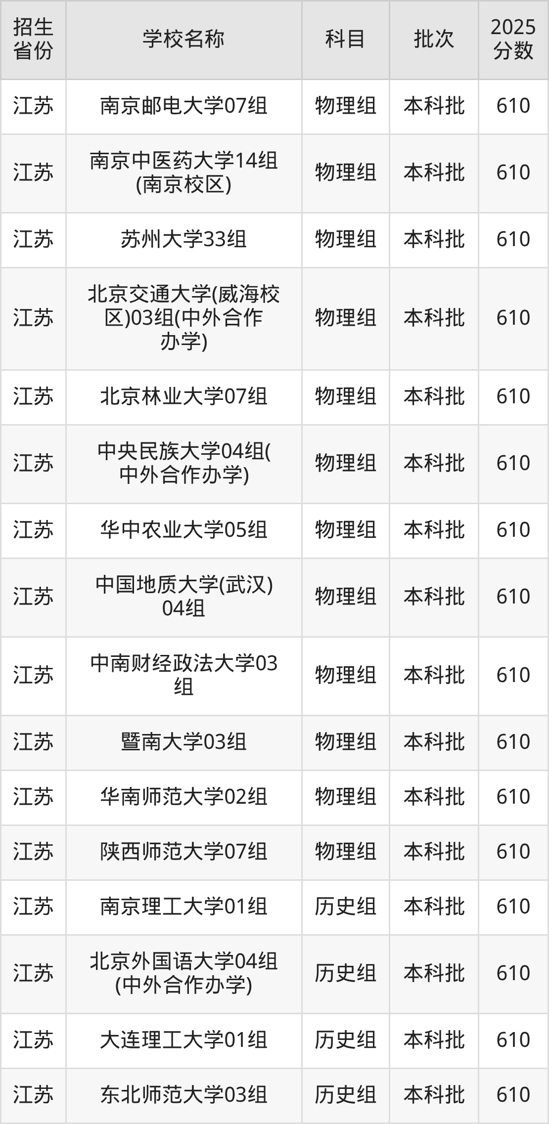 筛选全国各省2025年录取分数线为610分的一本大学如下:
