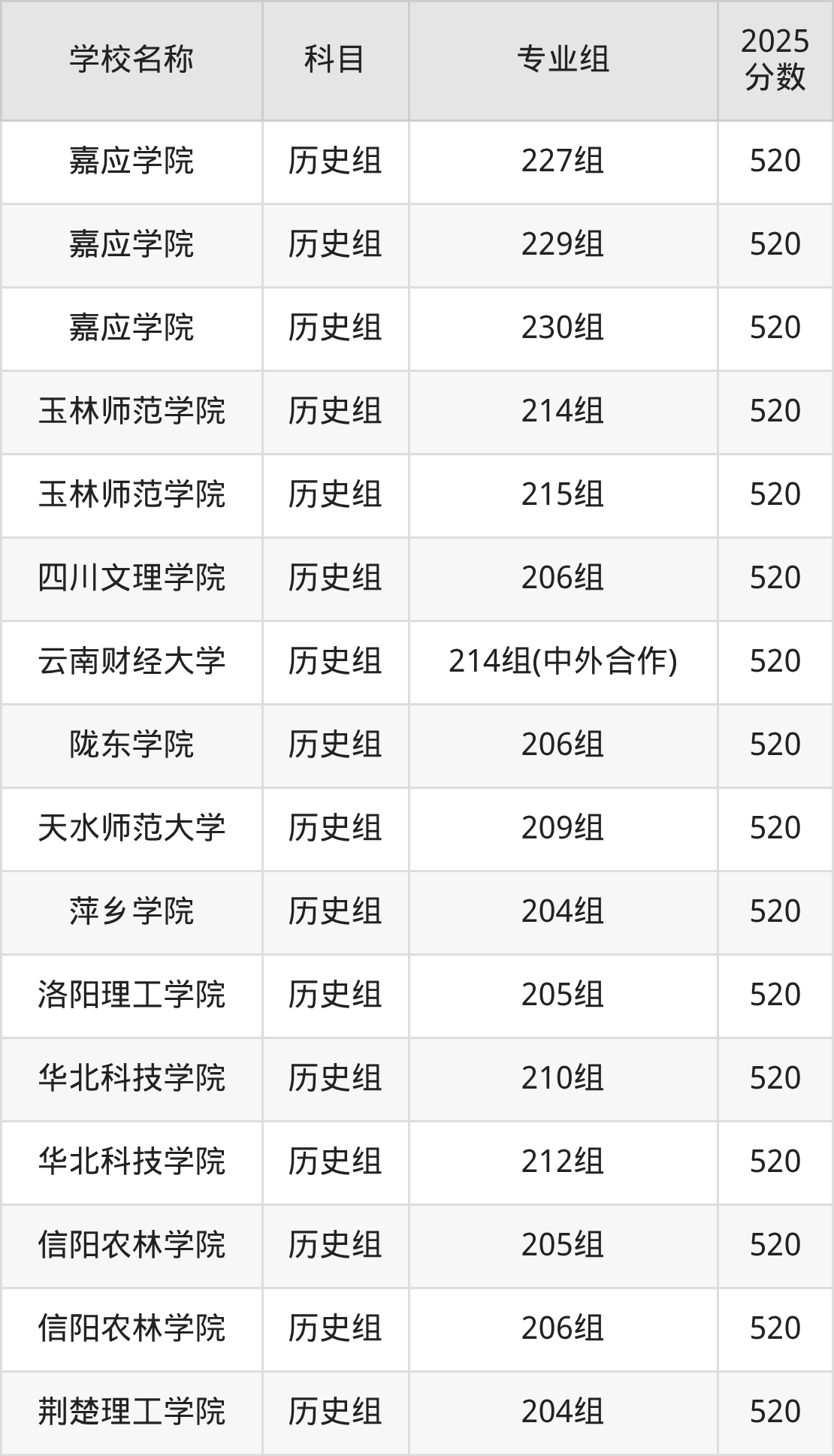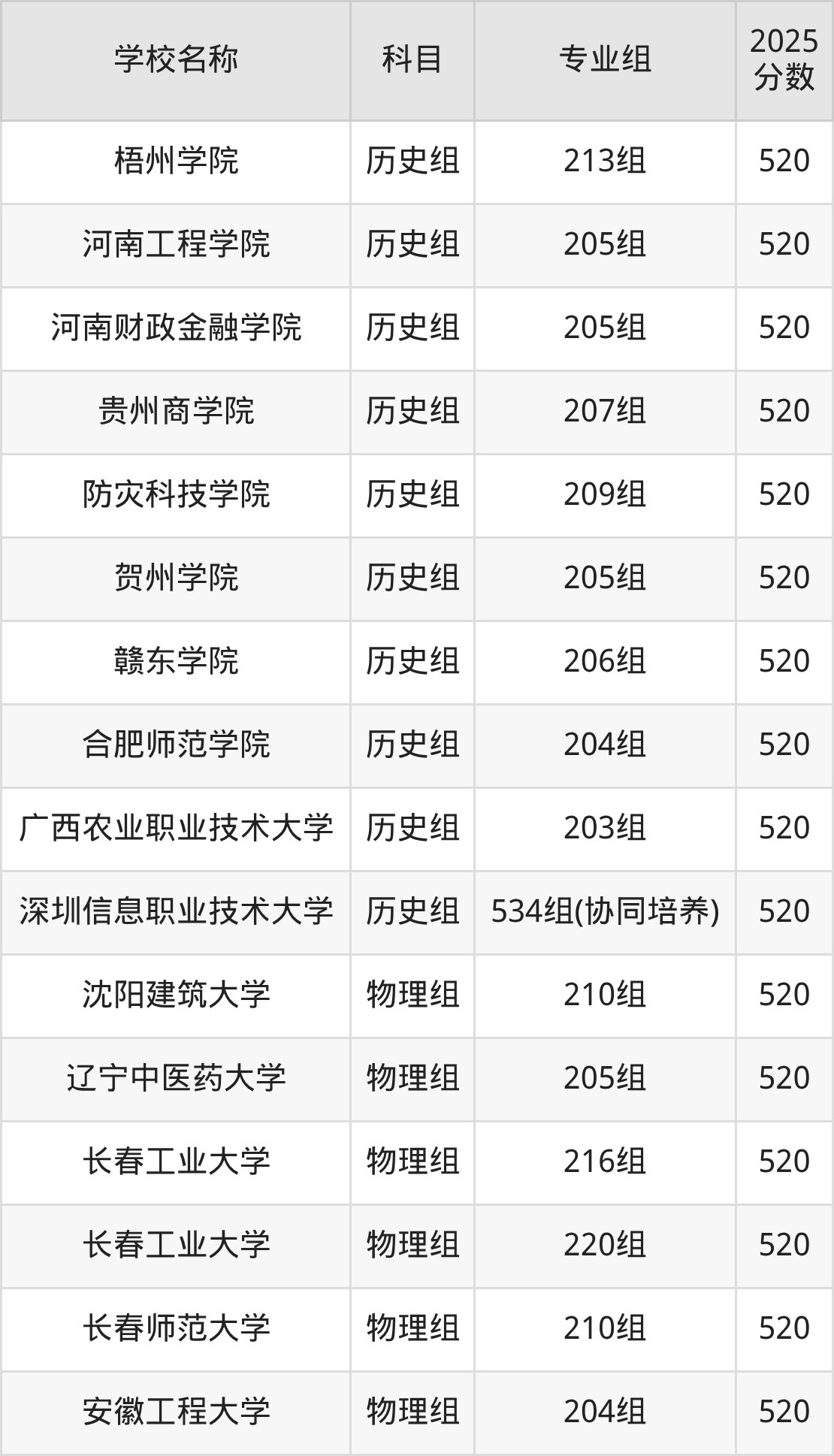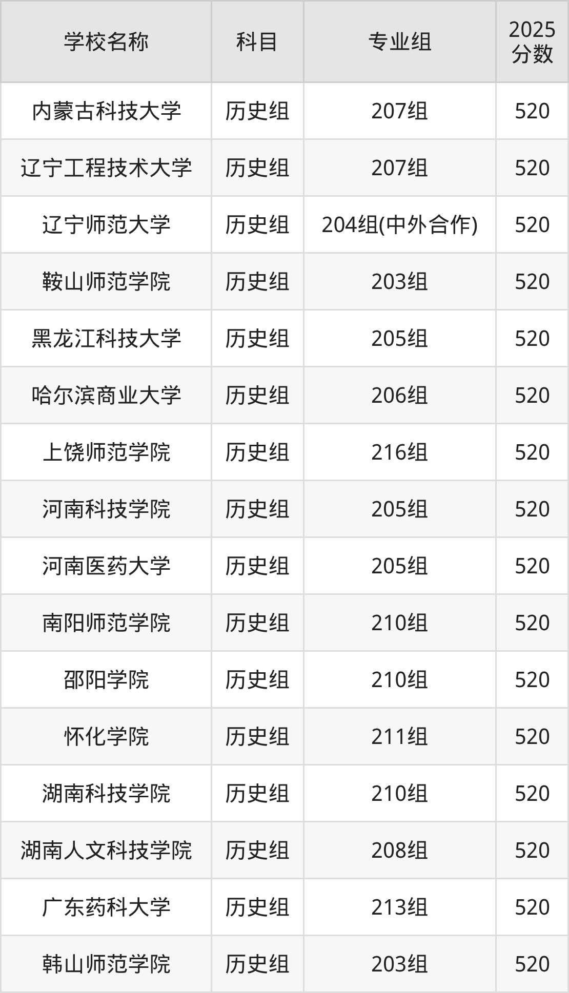 广东高考录取分数线在520分左右的公办院校专业组一共有66个,其中历史组有:内蒙古科技大学(520分)、辽宁工程技术大学(520分)、辽宁师范大学(520分),物理组有:沈阳建筑大学(520分)、辽宁中医药大学(520分)、长春工业大学(520分)。