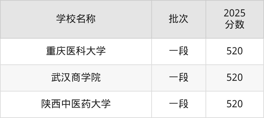 山东高考录取分数线在520分左右的公办大学一共有3所。分别是重庆医科大学(520分)、武汉商学院(520分)、陕西中医药大学(520分)