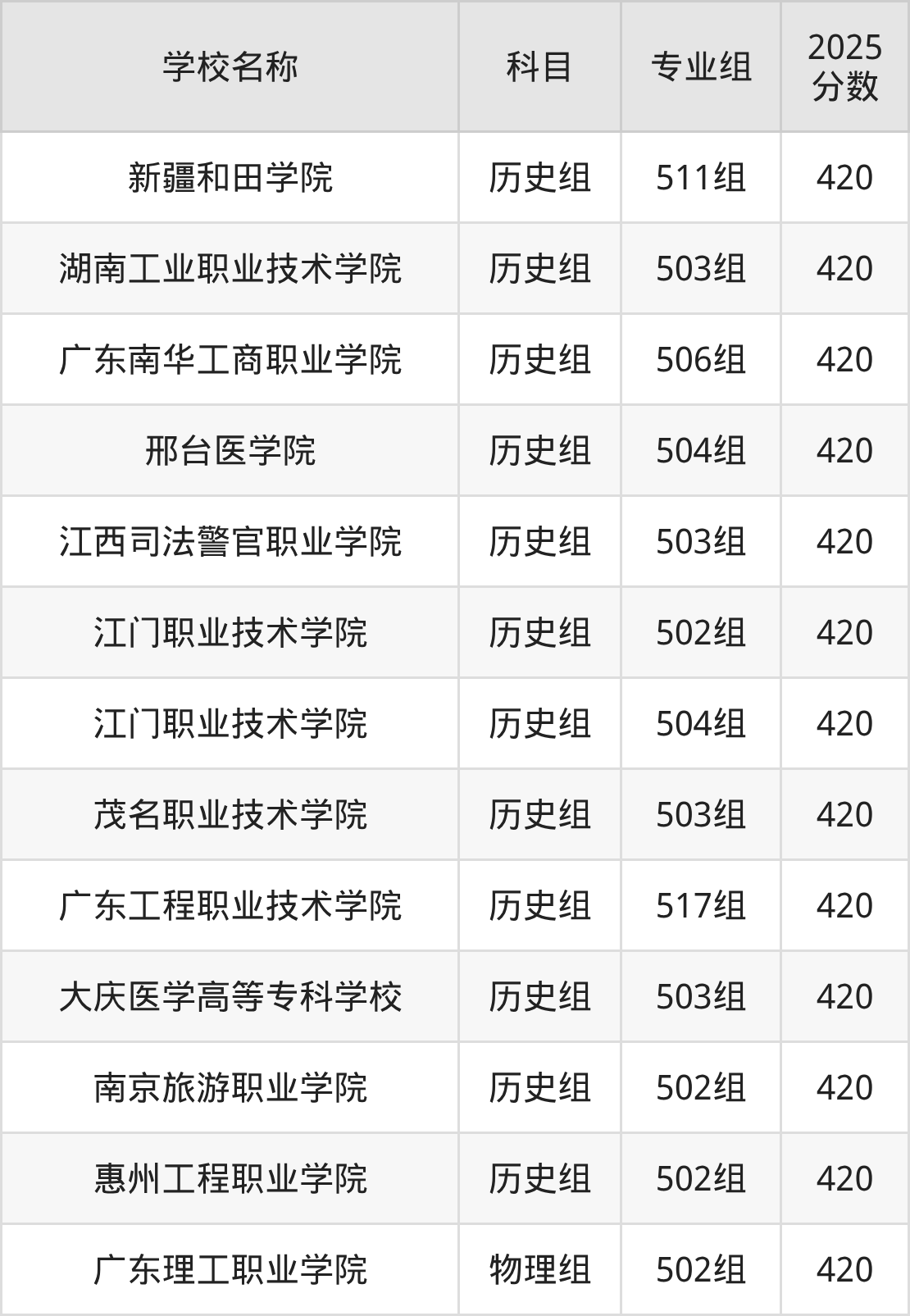 广东高考录取分数线在420分左右的公办院校专业组一共有13个,其中历史组有:新疆和田学院(420分)、湖南工业职业技术学院(420分)、广东南华工商职业学院(420分),物理组有:广东理工职业学院(420分)。