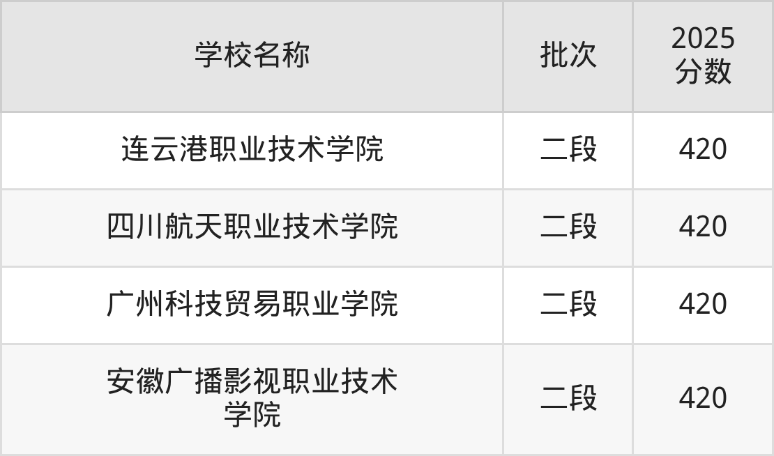 山东高考录取分数线在420分左右的公办大学一共有4所。分别是连云港职业技术学院(420分)、四川航天职业技术学院(420分)、广州科技贸易职业学院(420分)
