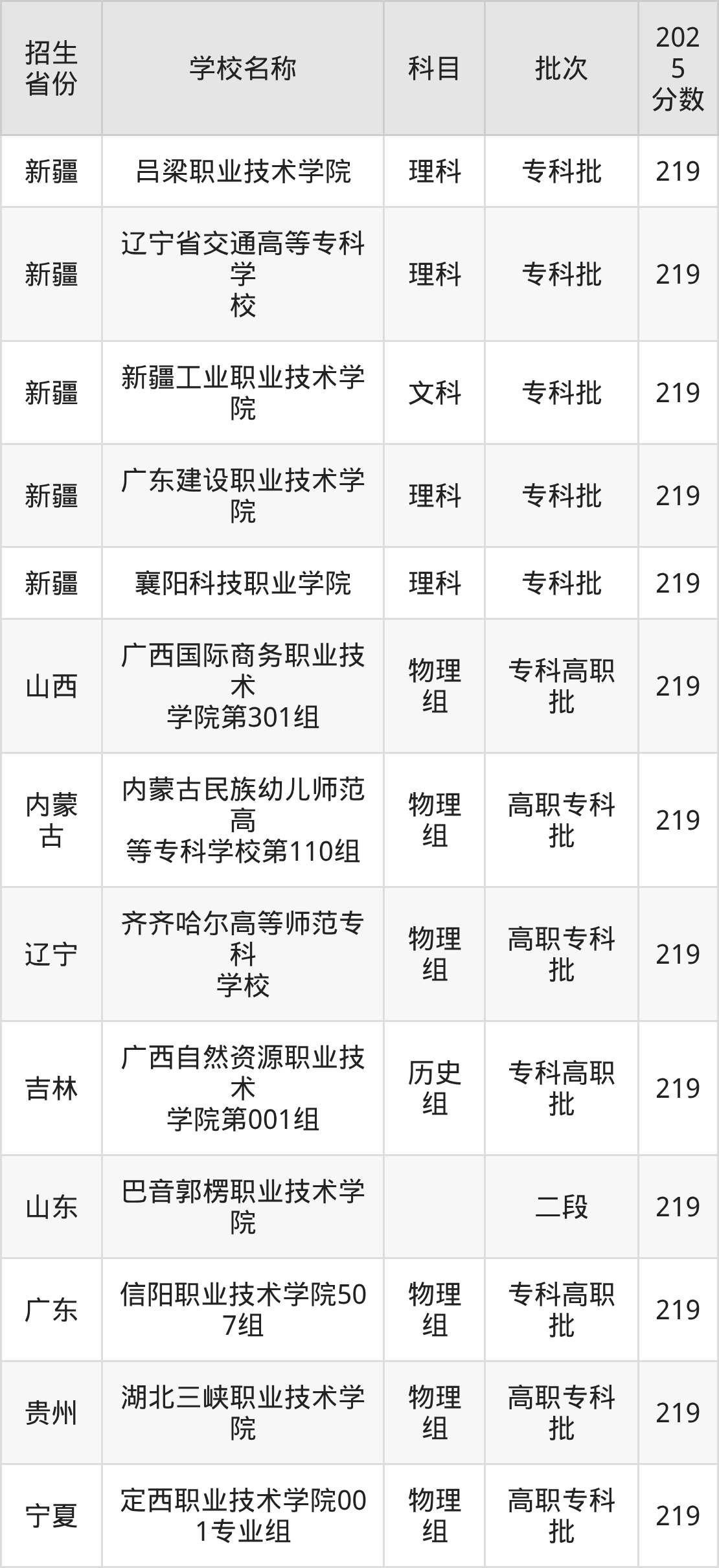 筛选全国各省2025年录取分数线为219分的公办专科大学如下: